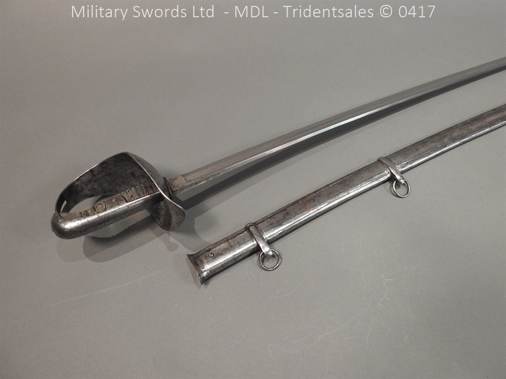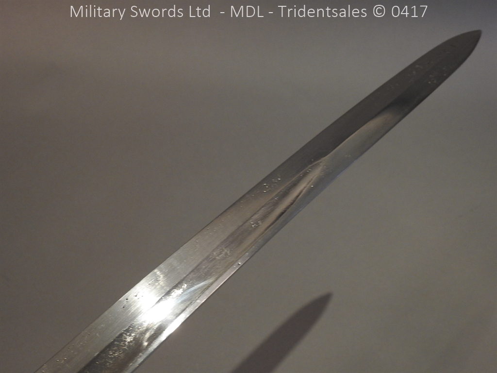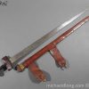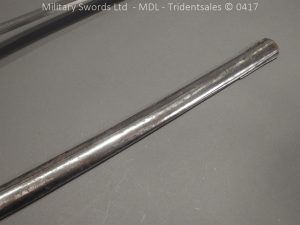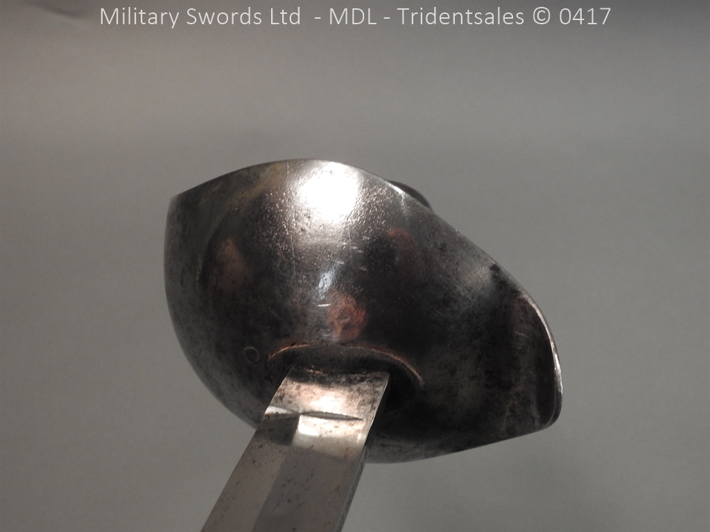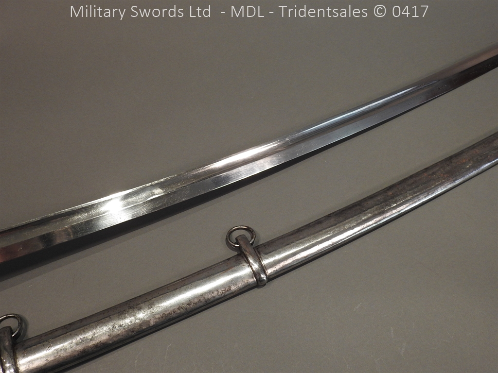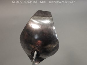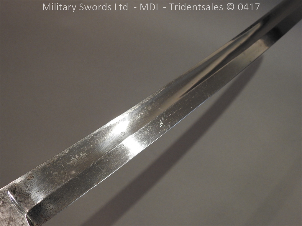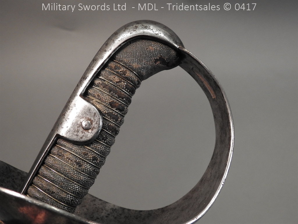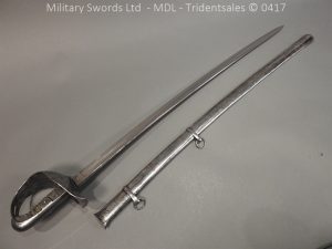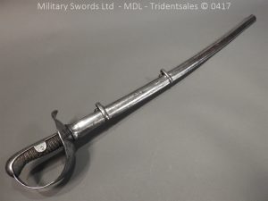 Slightly curved blade in very good condition. Double fuller for three quarters of its length. Blunt edge marked ‘Fba. De Toledo 1868’. Full iron handguard. Metal backstrap with ‘ears’. Fish skin grip with 15 turns of wire. Scabbard with two hangers and marked ‘Toledo’ on front side. Size: Overall 107cm Blade 86cm