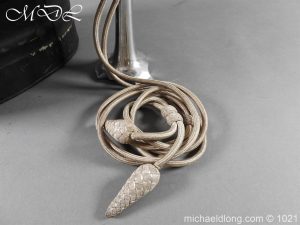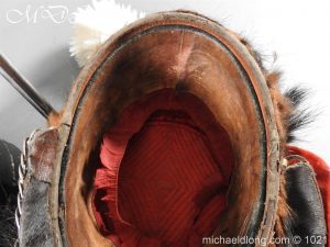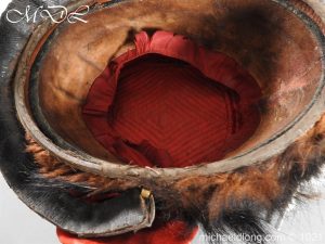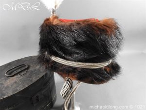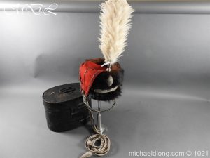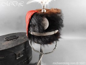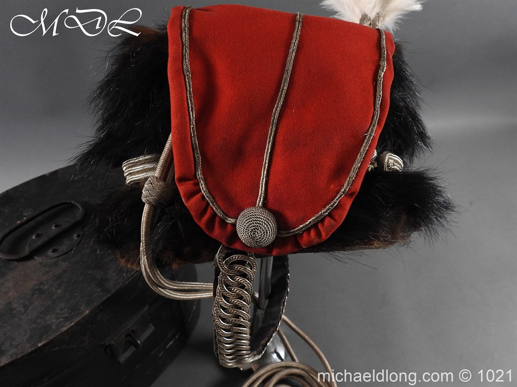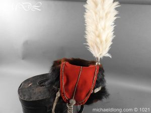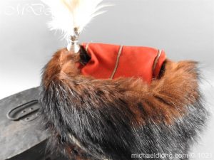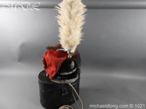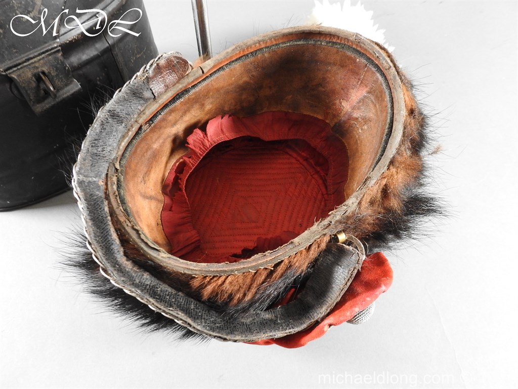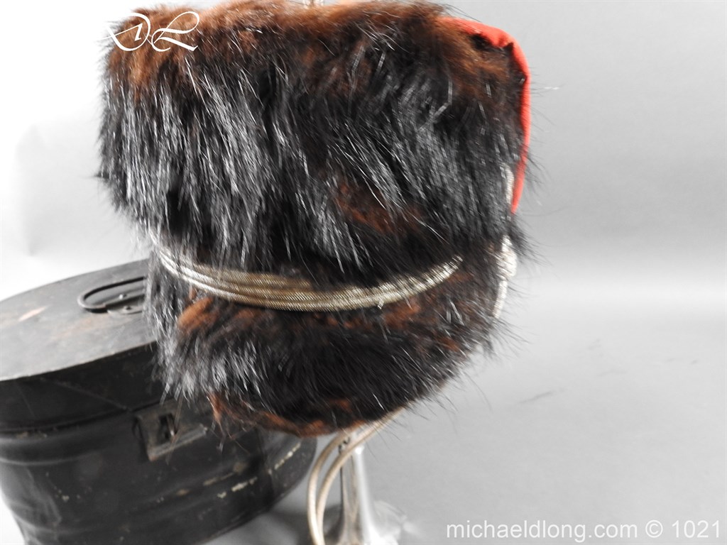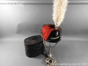 Staffordshire Yeomanry Officer’s Busby late Victorian early Edwardian period.with leather and red silk liner with some age wear to the edges of the bearskin however in generally good condition. The red side bag trimmed with silver lace and is complete with correct silver officer’s lines, chin strap plus white feather plume and transit case note plume a later replacement