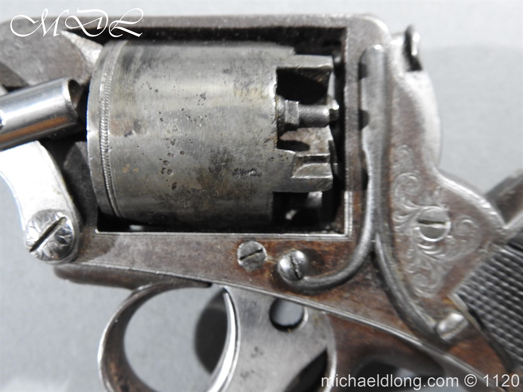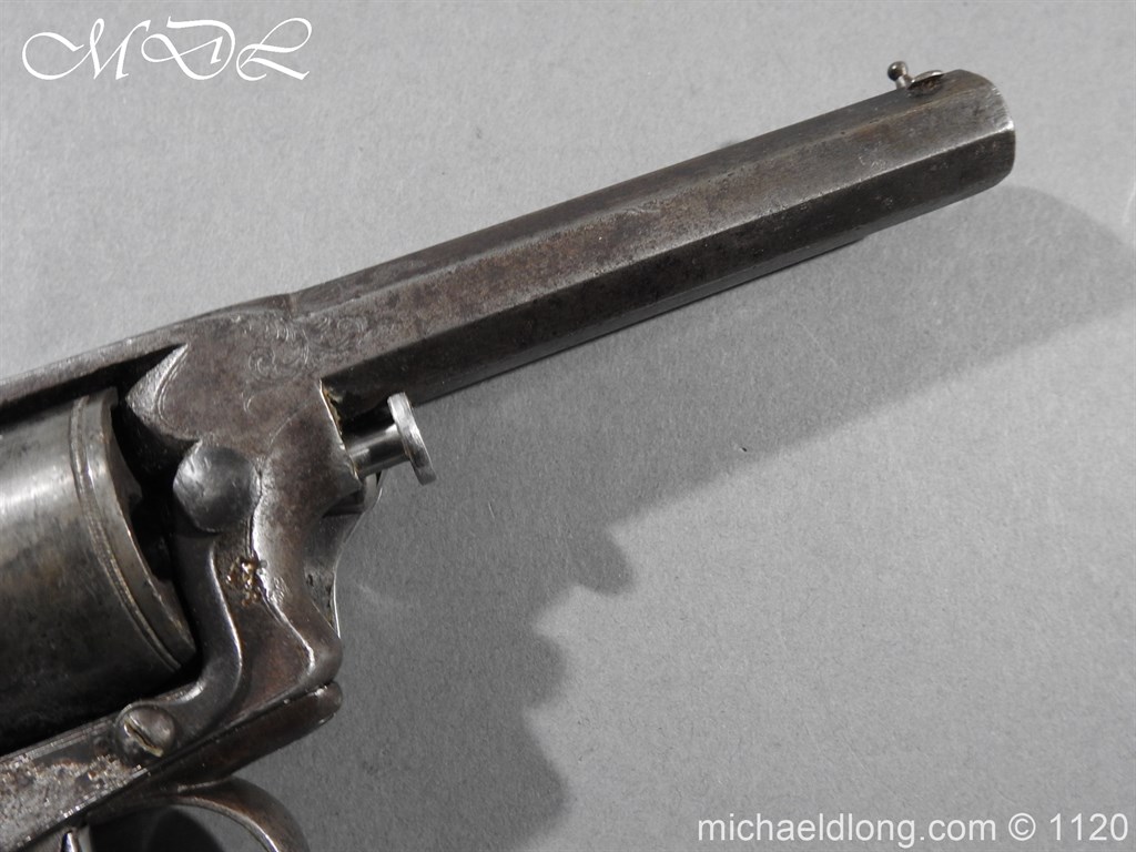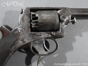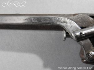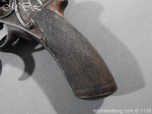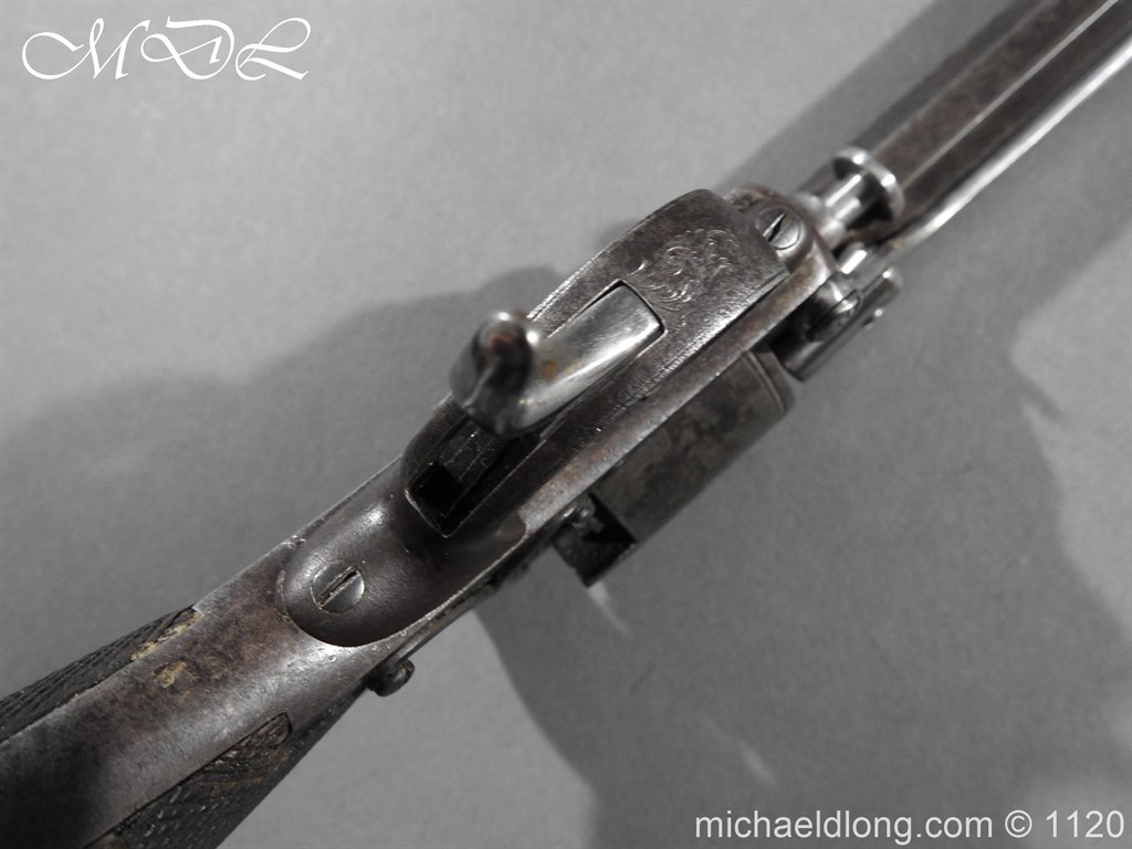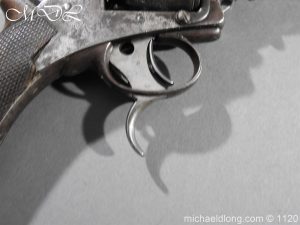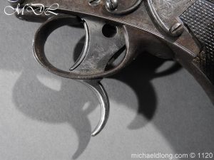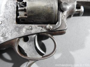 Tranter 80 Bore Percussion Revolver the frame engraved with floral design action in working order with 4.5 inch barrel. Cylinder with Victorian proof marks 5 shot and with tranter patent rammer and double trigger. Complete with chequered one piece grip with engraved butt cap. This historic revolver is of an obsolete caliber and can therefore be owned live without any form of license. It can be fully stripped, cock and dry fired – UK Delivery address only please