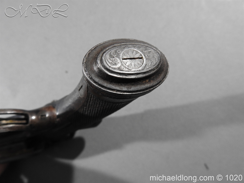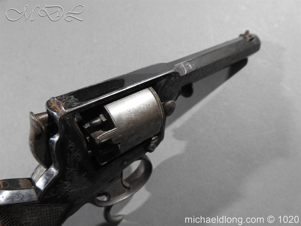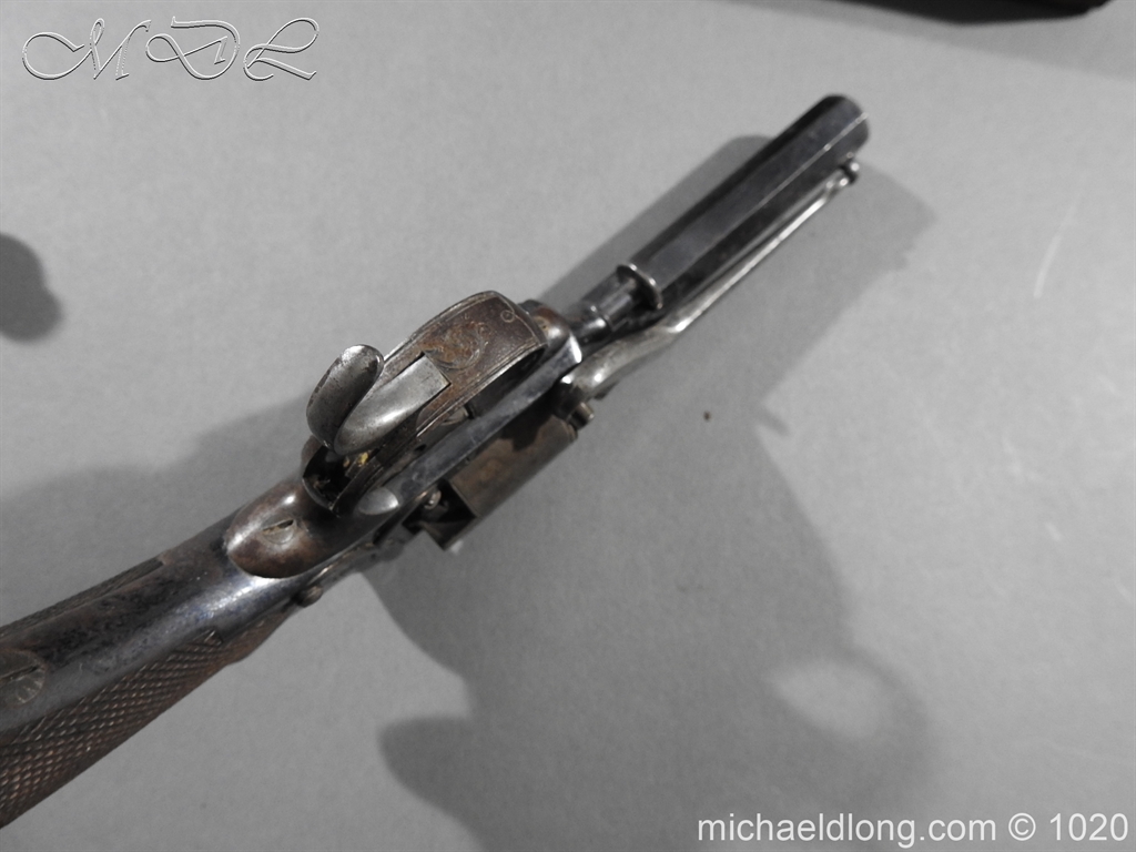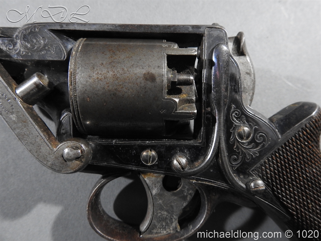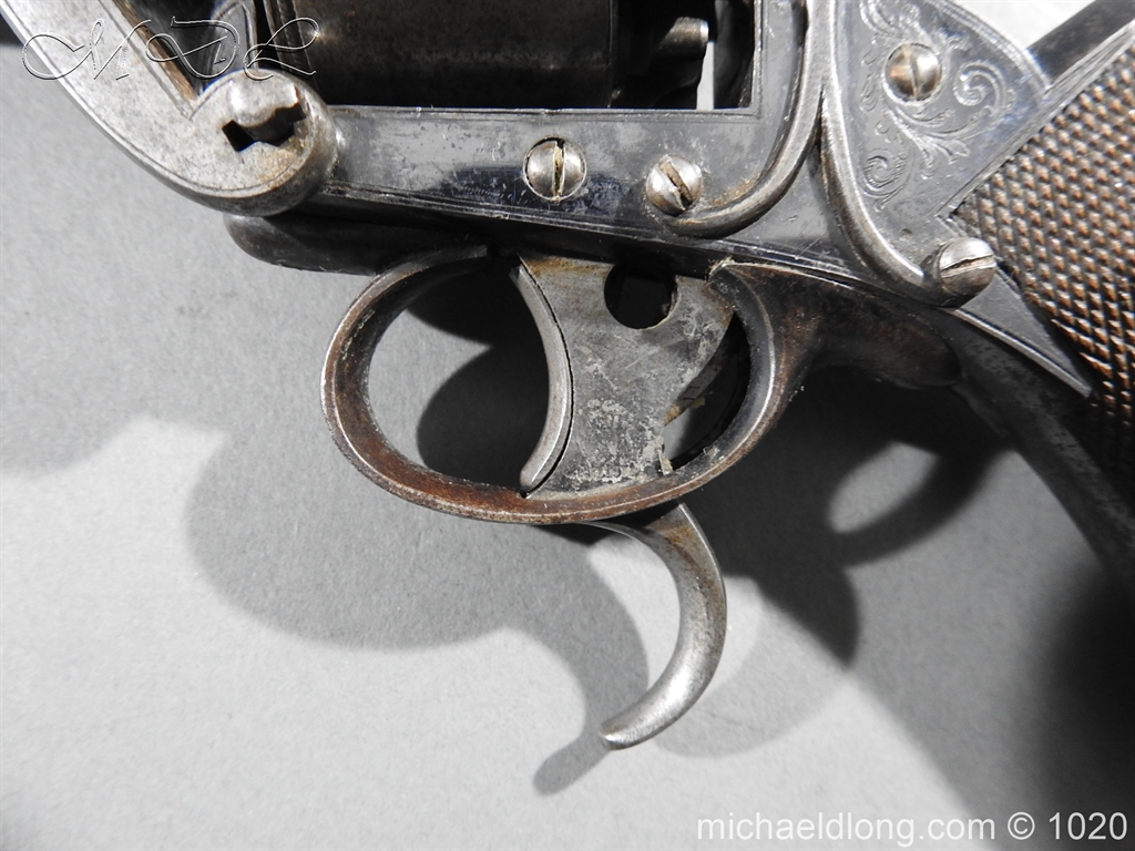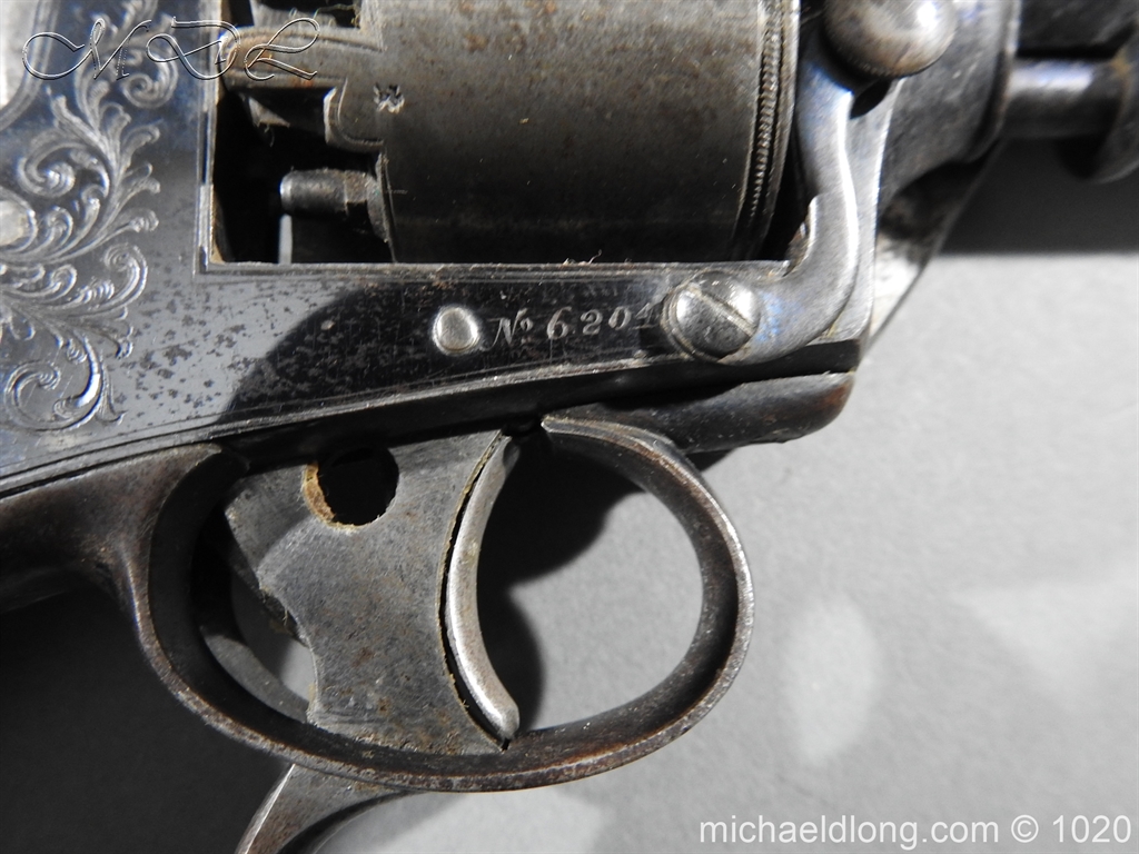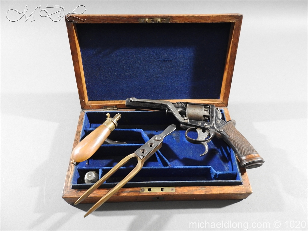 Tranter Cased 80 Bore Percussion Revolver double trigger serial number 6024. With blued octagonal sighted barrel engraved with a band of foliage at the muzzle and sprays of scroll work at the breech, border and scroll engraved blued top-strap and frame, blued arbor-pin, arbor-pin-catch and sprung hammer-safety, case-hardened cylinder cut with a decorative roped band towards the front edge, bright hammer and patent trigger, chequered figured walnut butt, blued border and scroll engraved trigger-guard, foliate and scroll engraved butt-cap and scroll engraved Tranter patent rammer, retaining original finish throughout however some wear discolour, in original fitted mahogany case lined in blue baize with accessories including a revolver flask, a Tranter patent double-cavity brass bullet mould engraved Baker London a Dixon oil bottle, screw driver the exterior with circular brass escutcheon