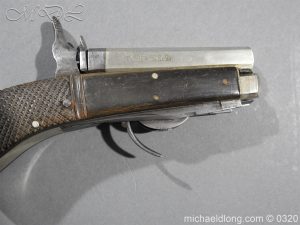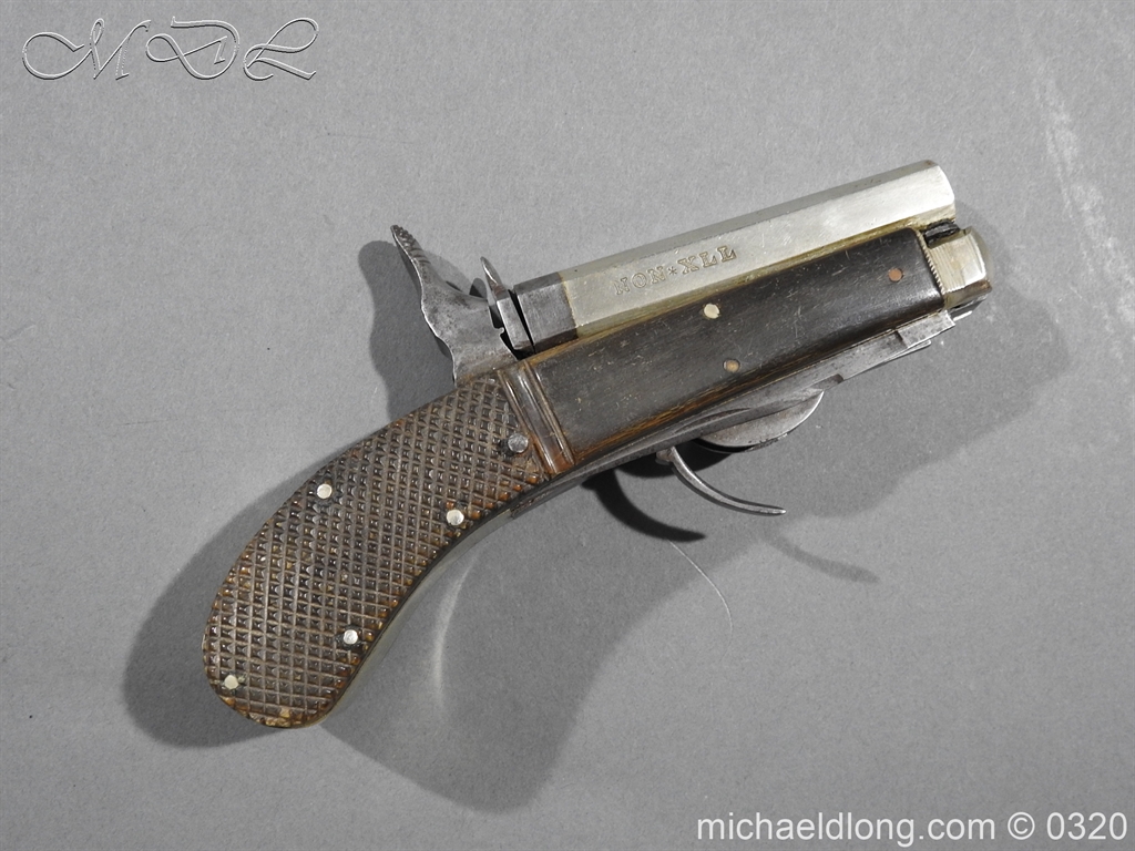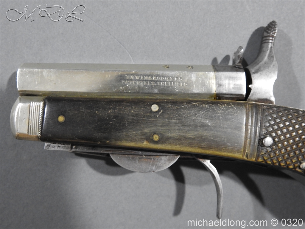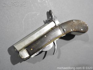 Unwin and Rodgers rimfire Knife Pistol with white-metal octagonal barrel stamped Unwin & Rodgers Patentees Sheffield and NON XXL, two folding single-edged knife-blades white-metal body with pinned rounded dark horn side-plates chequered at the butt plus opening butt cap and Birmingham proof marks. For other examples see Lewis Winant, Firearms Curiosa, 1955, pp. 122-125, figs. 126-128 – 9 cm. barrel