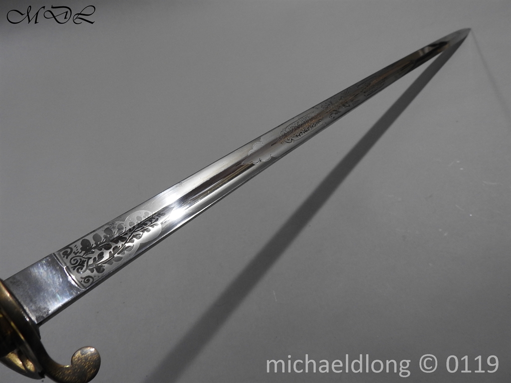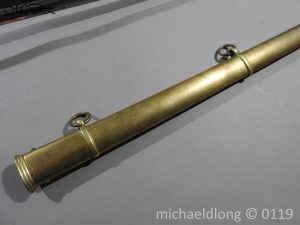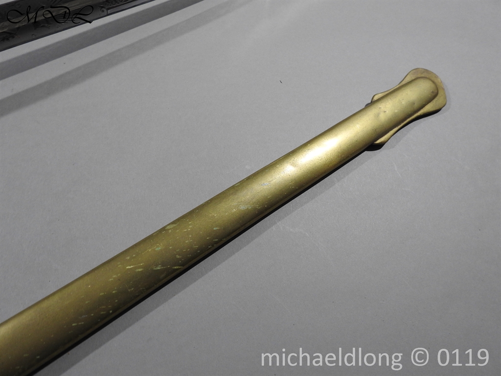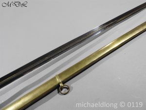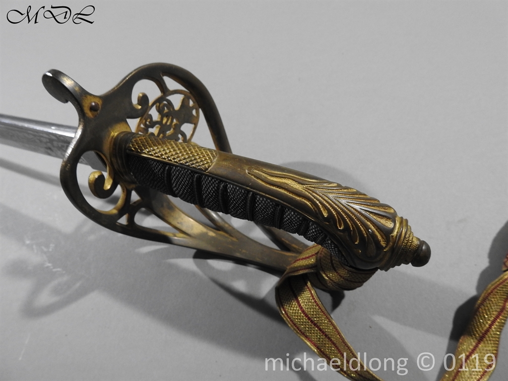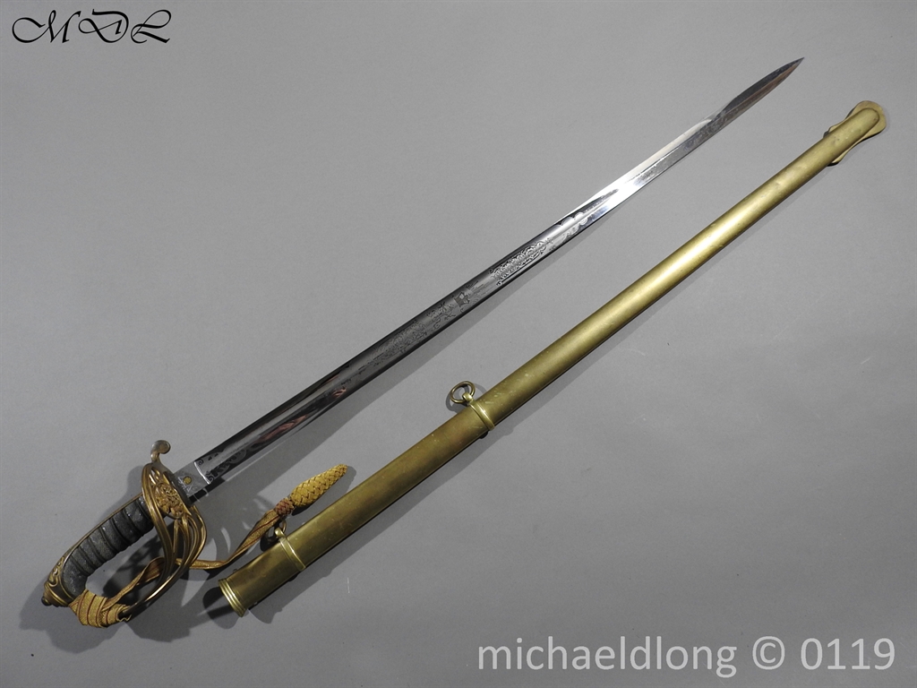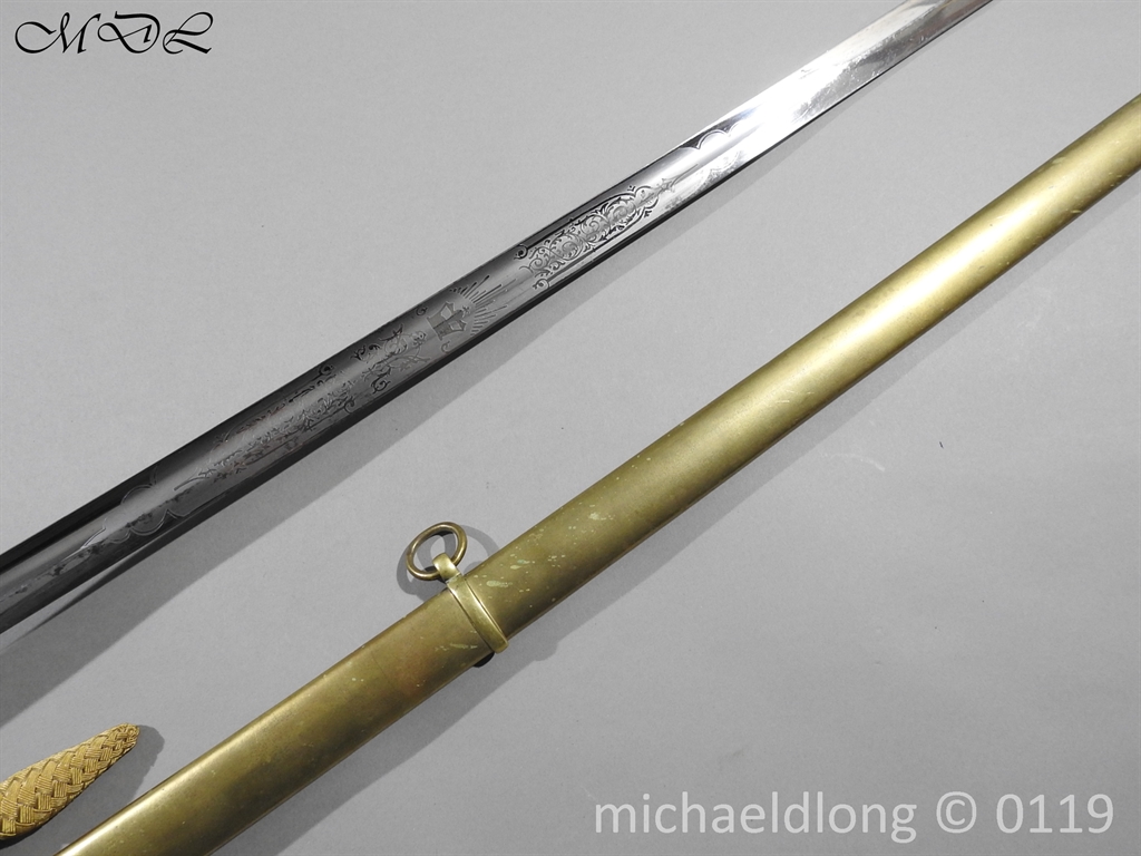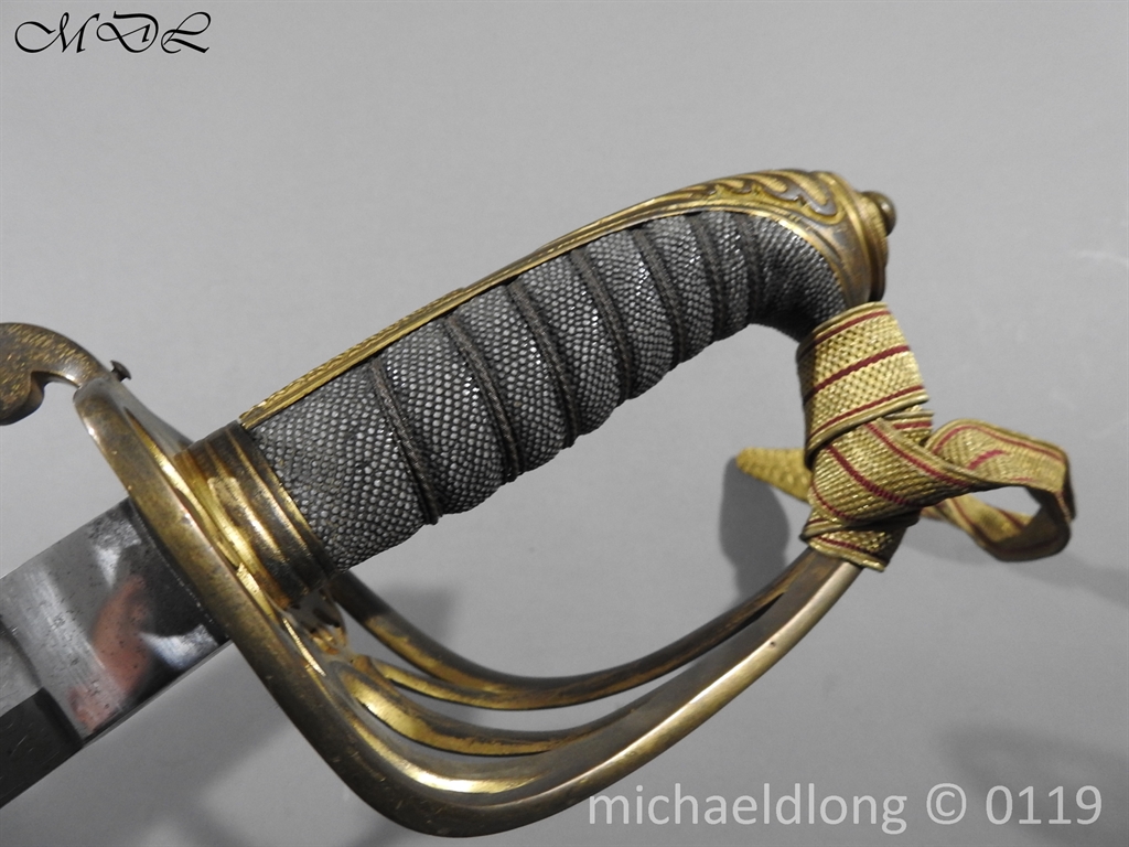 Victorian 1845 Infantry Officer’s Sword in untouched condition, regulation gilt hilt with VR and crown to center. Fish skin grip bound with gilt wire and correct officer’s dress knot. The slightly curved blade is in very good condition etched both sides with Royal Crown,VR all surrounded by floral decoration plus brass proof plug. It is complete with brass scabbard which is in excellent condition