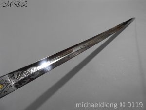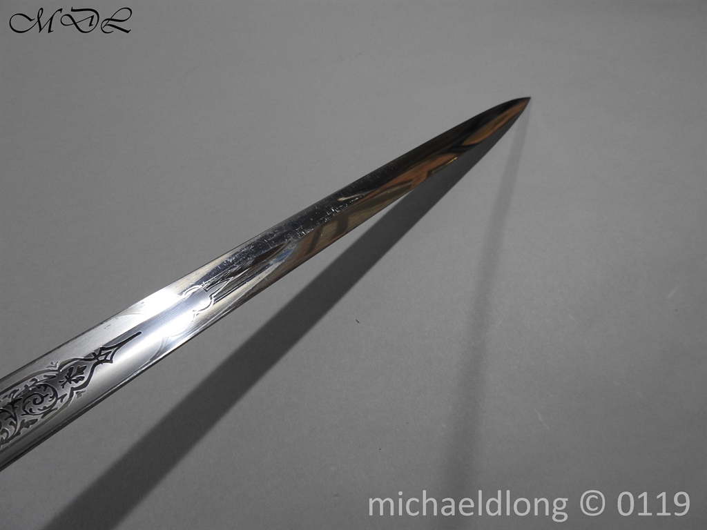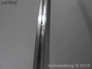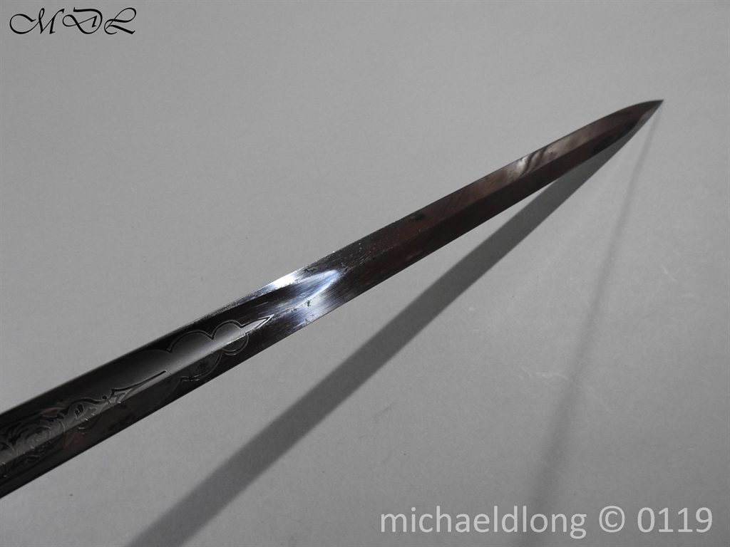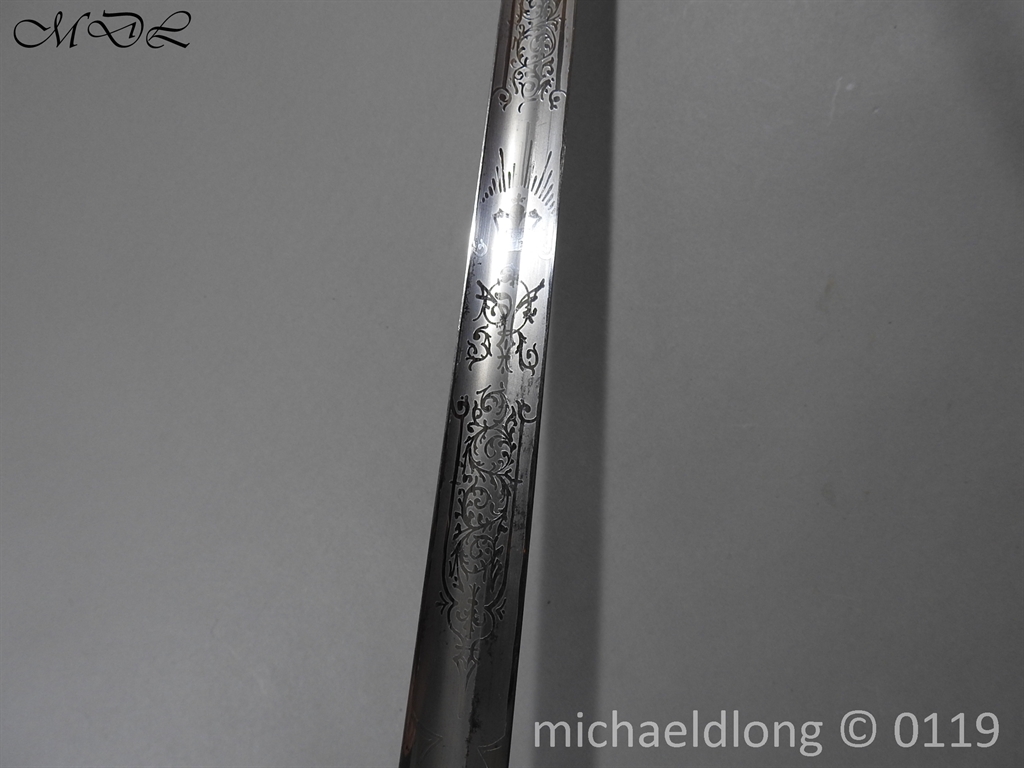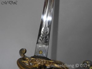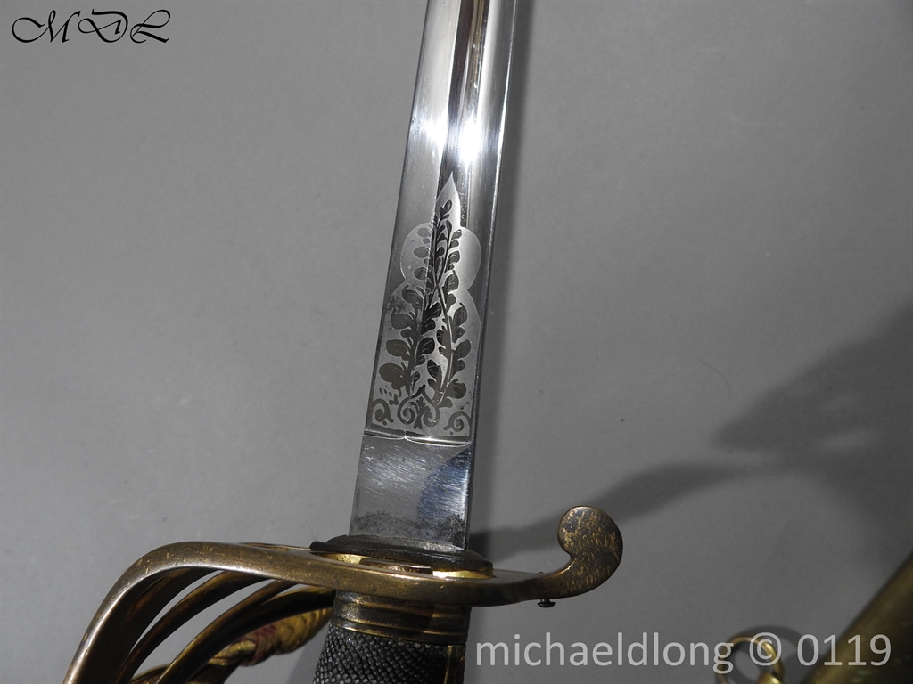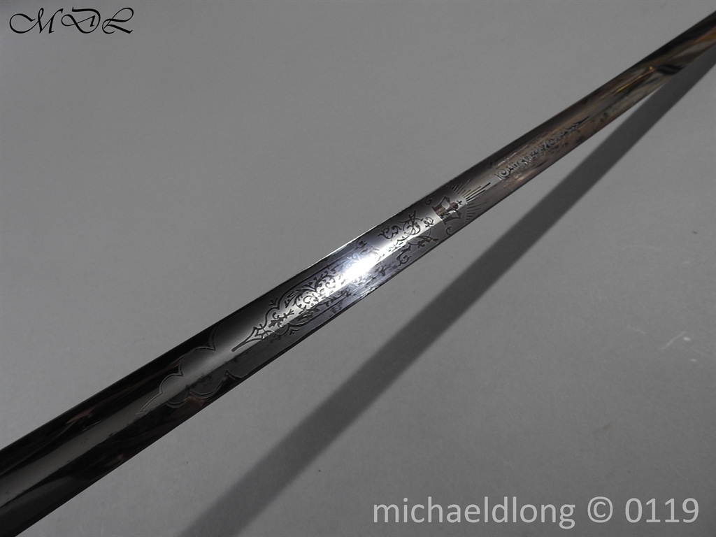 Victorian 1845 Infantry Officer’s Sword in untouched condition, regulation gilt hilt with VR and crown to center. Fish skin grip bound with gilt wire and correct officer’s dress knot. The slightly curved blade is in very good condition etched both sides with Royal Crown,VR all surrounded by floral decoration plus brass proof plug. It is complete with brass scabbard which is in excellent condition