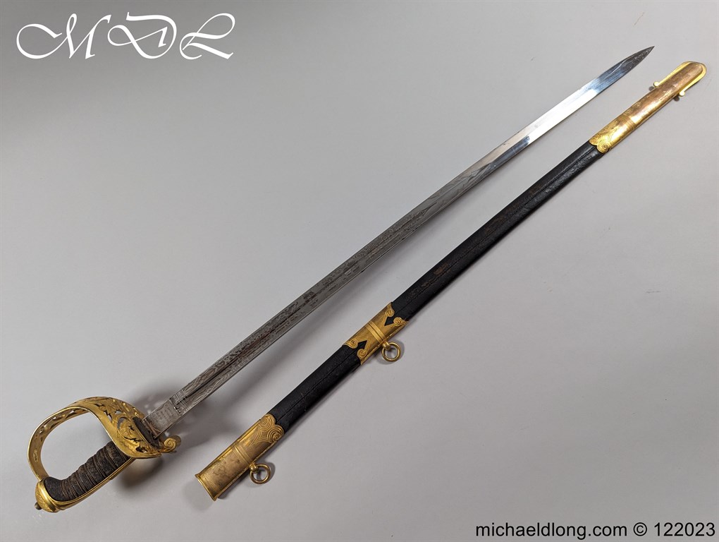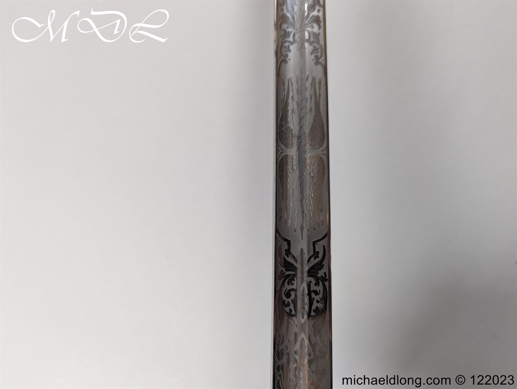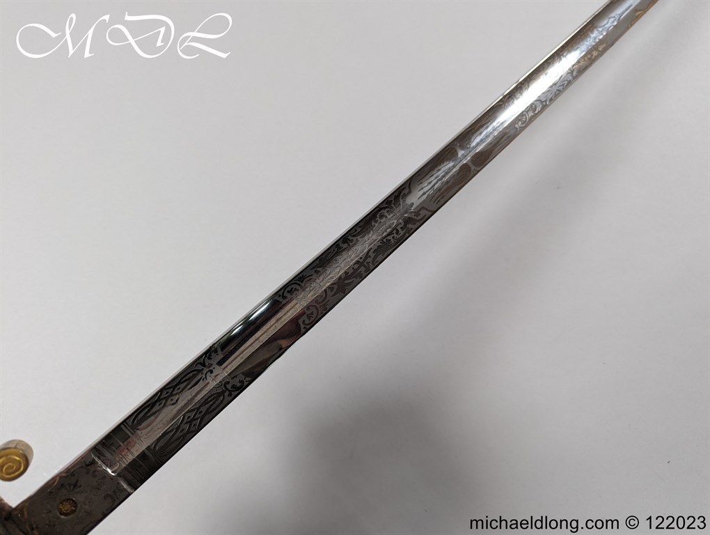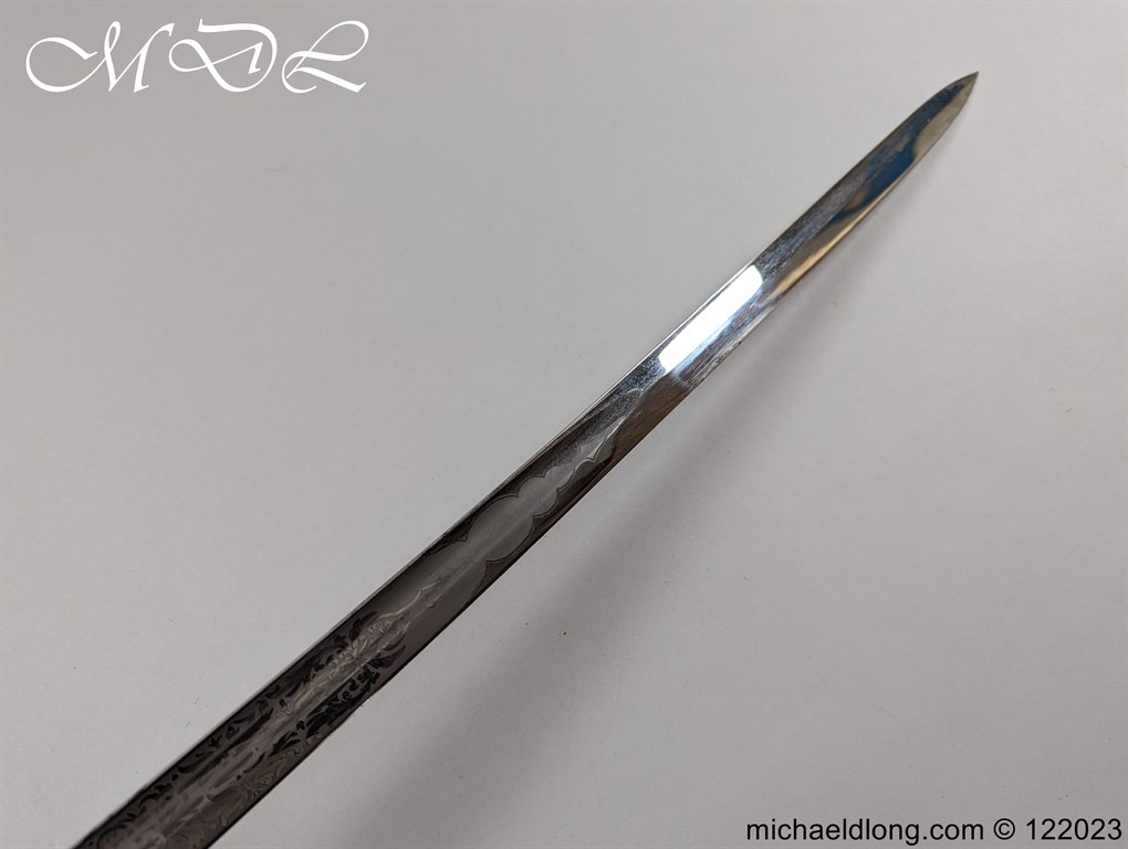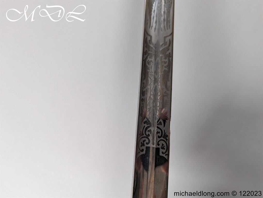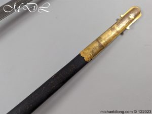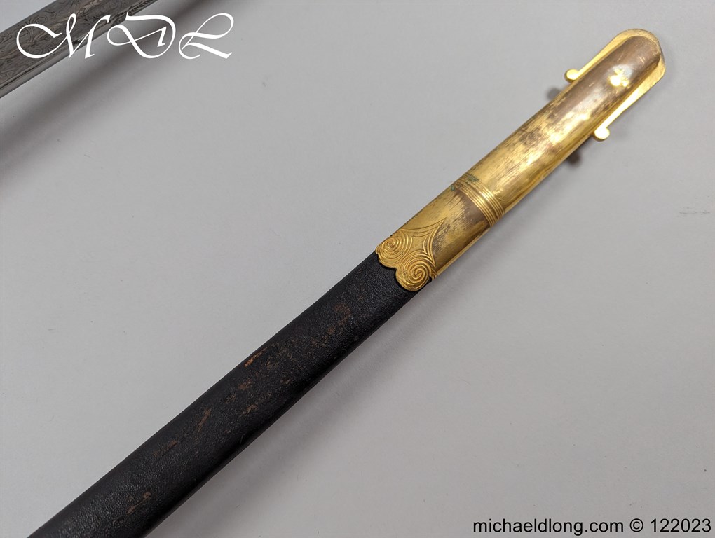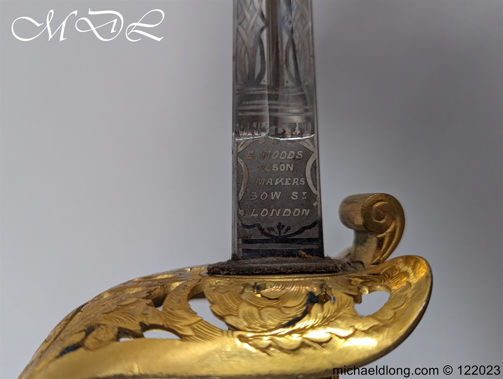 Victorian 1st Essex Engineer Volunteers Officers Sword in good condition, this was a short-lived Volunteer unit – 1861–1871 only. Regulation brass hilt with quality decoration, chequered pommel and black fish skin grip bound with gilt wire. The slightly curved blade in super condition etched with Royal Engineers with cannon and wings plus 1 EEV all against a floral background. Maker marked E Woods and Sons London complete with black leather scabbard with matching gilt mounts.