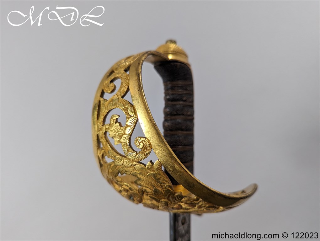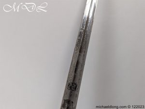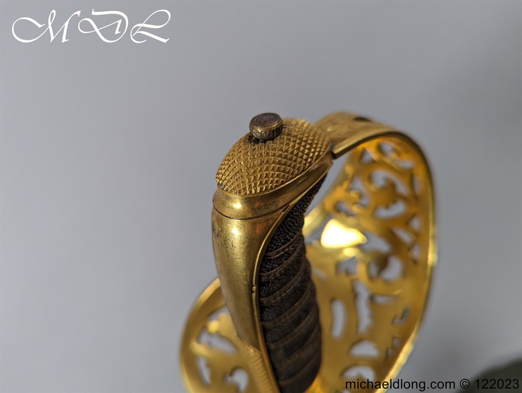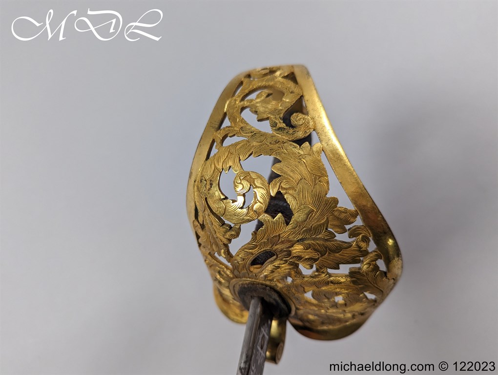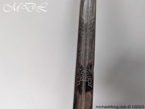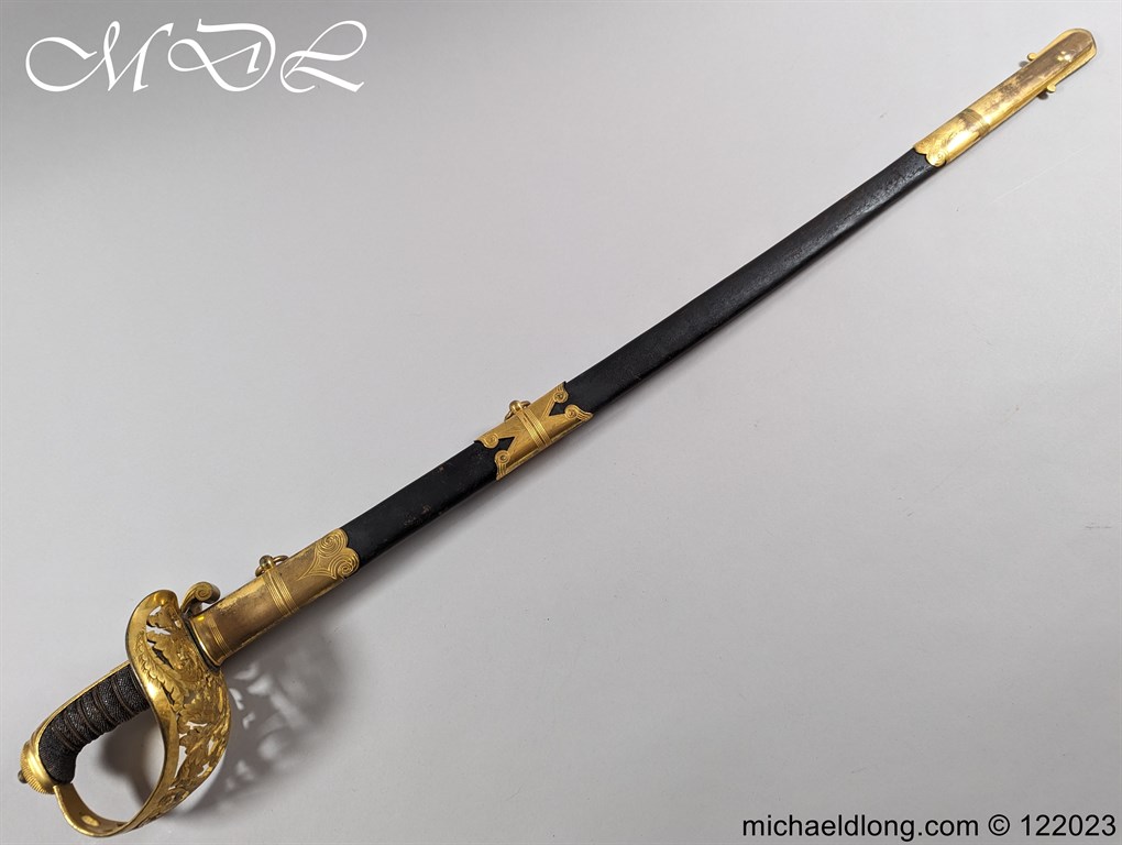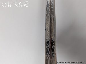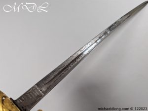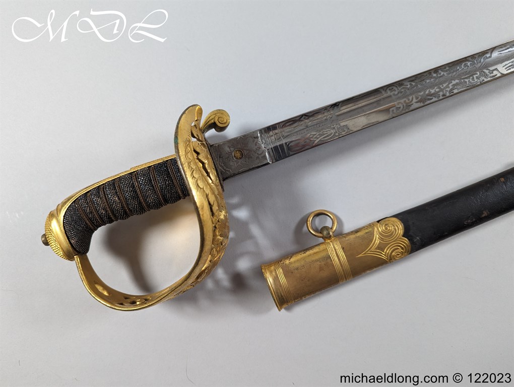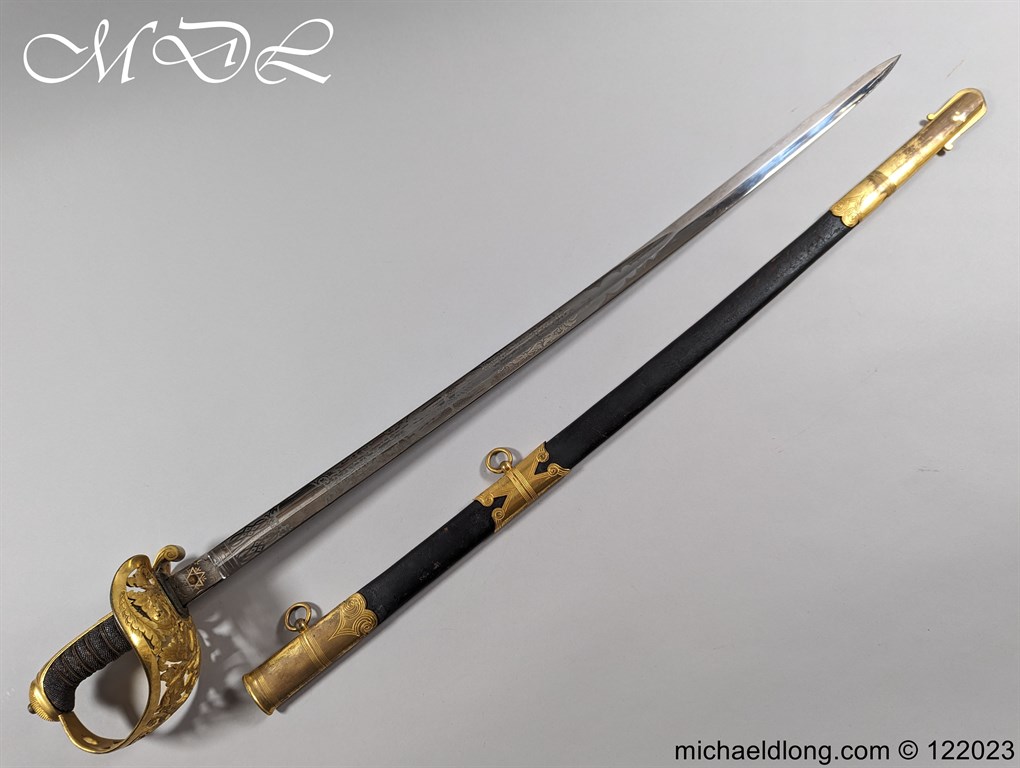 Victorian 1st Essex Engineer Volunteers Officers Sword in good condition, this was a short-lived Volunteer unit – 1861–1871 only. Regulation brass hilt with quality decoration, chequered pommel and black fish skin grip bound with gilt wire. The slightly curved blade in super condition etched with Royal Engineers with cannon and wings plus 1 EEV all against a floral background. Maker marked E Woods and Sons London complete with black leather scabbard with matching gilt mounts.