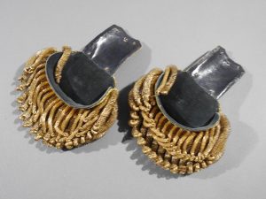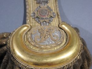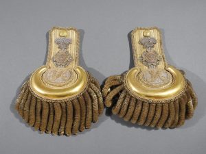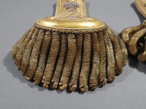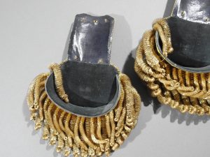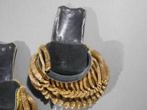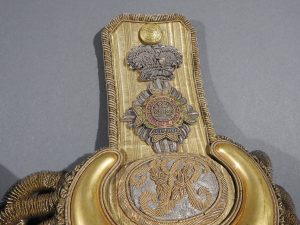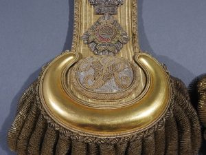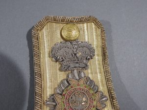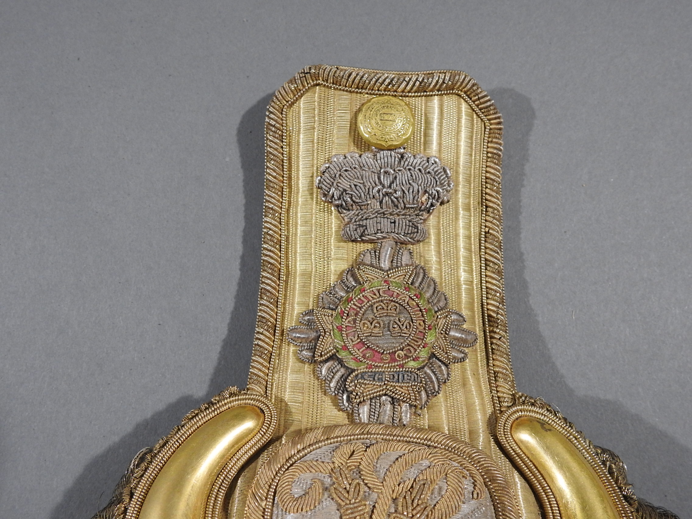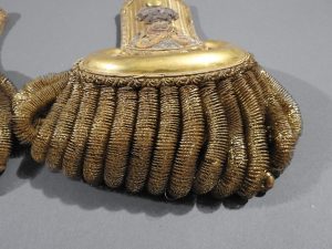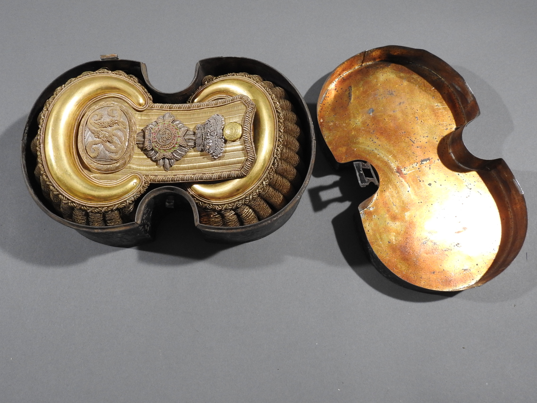 Excellent pair of gilt eppaulets with leather and velet lining, regimental button with XXVIII embroided crown and order of the bath no damage complete with original storage tin hinge broken