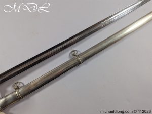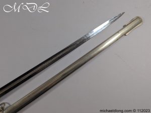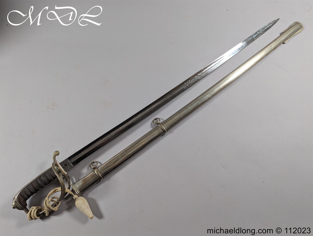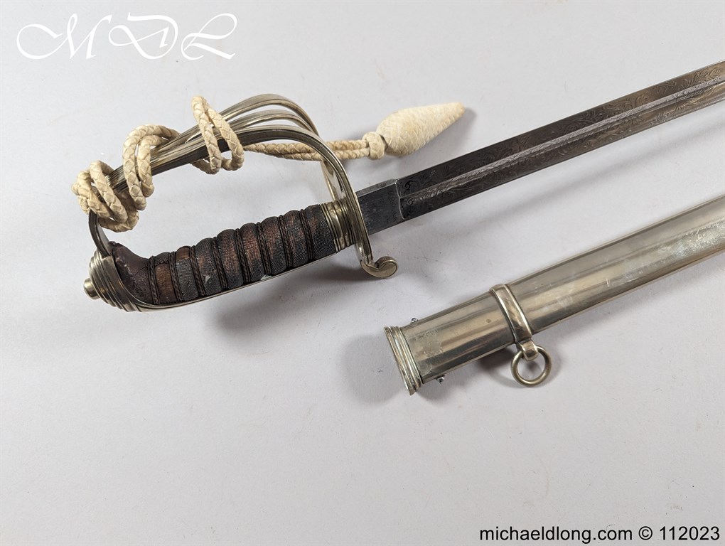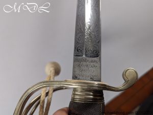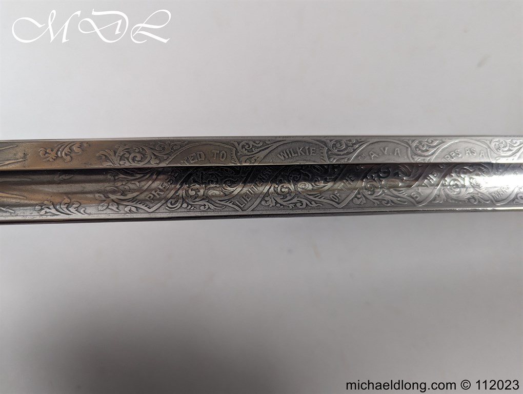 Victorian 4th Ardrossan Artillery Presentation Sword. Regulation plated 3 bar hilt with fish skin grip and white cord knot. The blade in stunning condition by Hobson and sons engraved with VR and crown and cannon to one side the reverse with full presentation as follows: PRESENTED TO LIETUENANT WILKIE Of THE 4TH A V A BYTHE CORP AS A MARK OF THEIR ESTEEM – ARDROSSAN 4TH MARCH 1870. Complete with matching plated scabbard