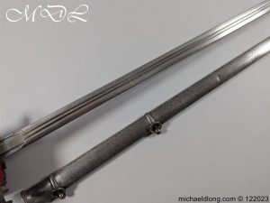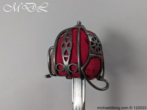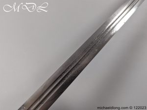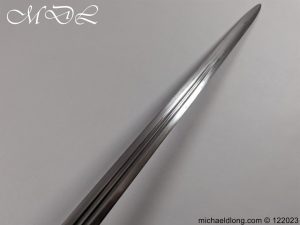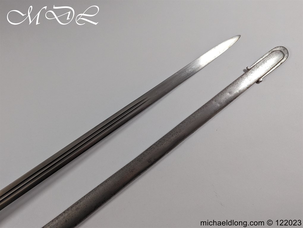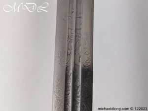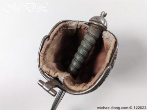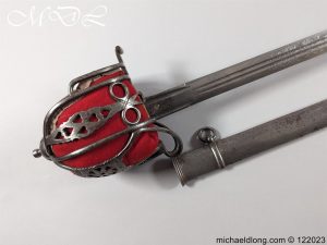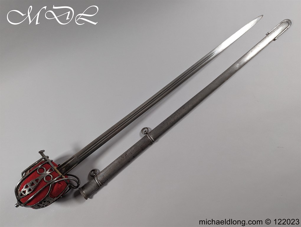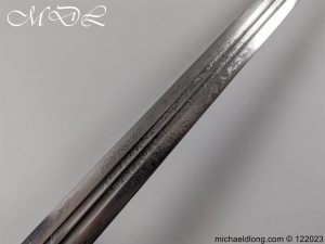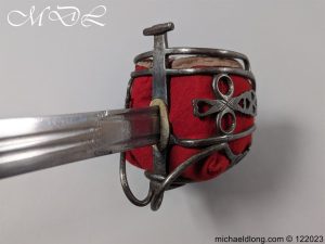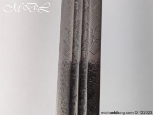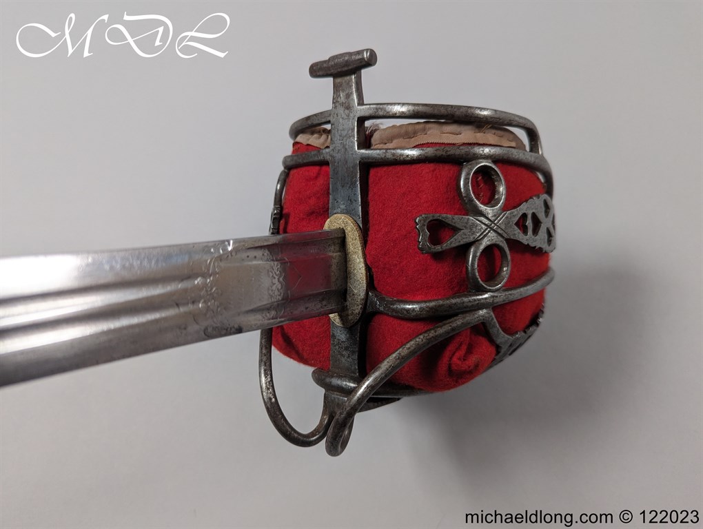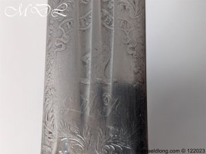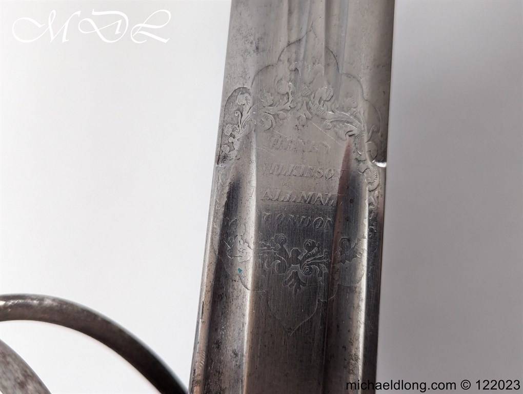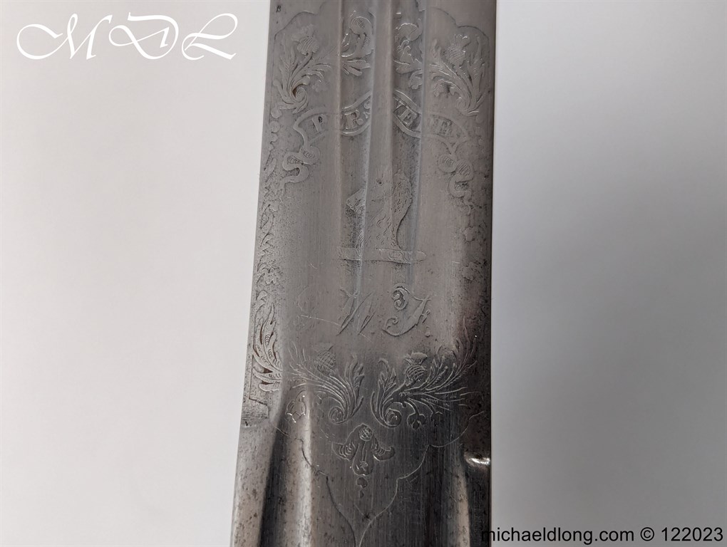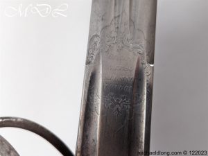 Victorian 74th Highlander Officer’s Sword by Henry Wilkinson early example not number but with the family crest of Fordyce plus initials G W F – George William Fordyce. Regulation basket hilt complete with liner. The broad sword blade in super condition good deep engraving with V R Crown, regimental badge, I X X I and family crest, maker marked Henry Wilkinson Pall Mall London . It is complete with steel scabbard. Notes: Attack on the troops under Lieutenant-Colonel Fordyce of the 74th Highlanders, while forcing their way through the Kroomie Forest on 8th September 1851 Reference: Swords of the British Army Revised Edition page 182 Blade Length: 83cm, overall Length: 101cm