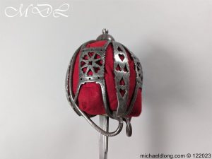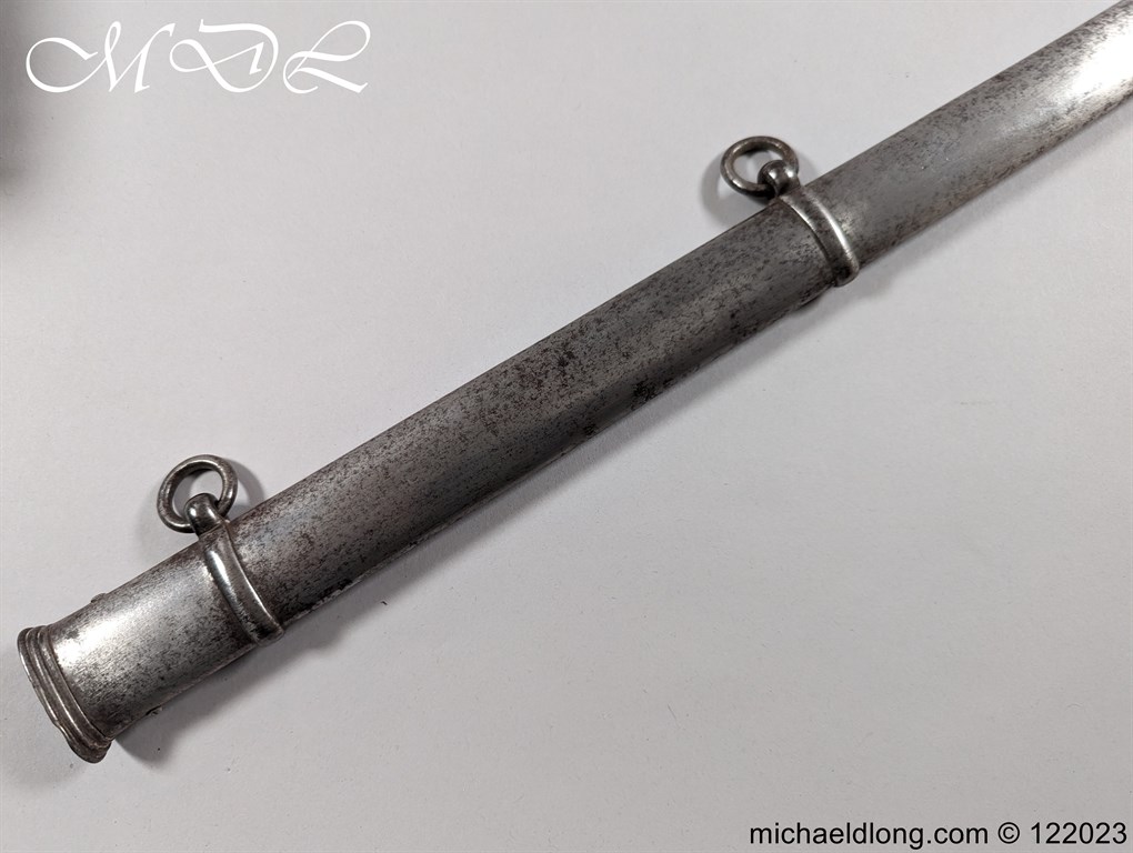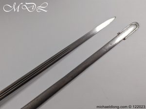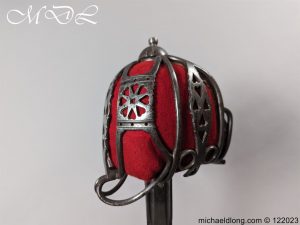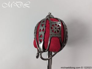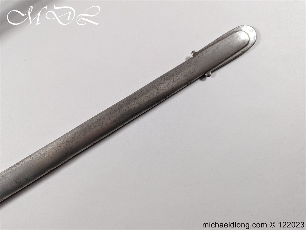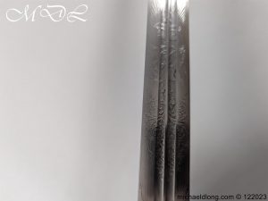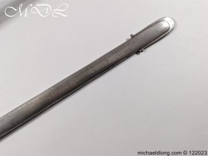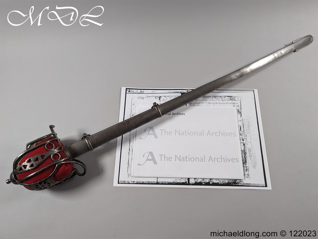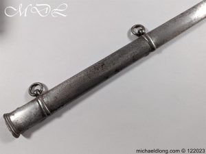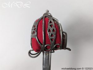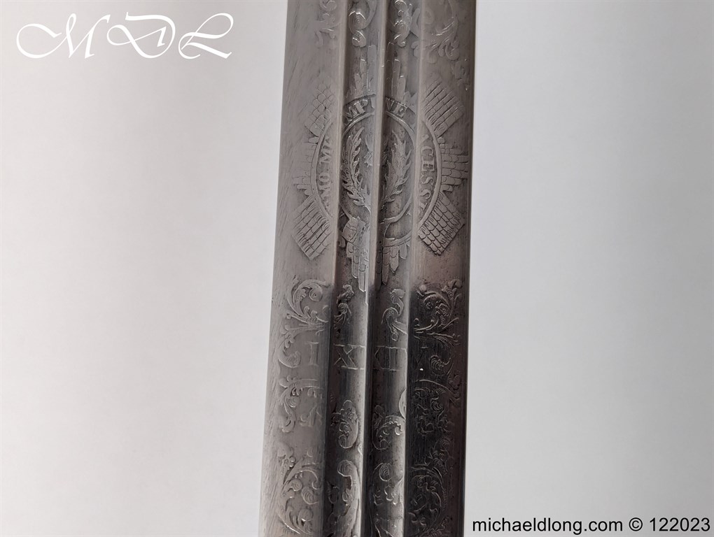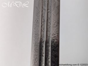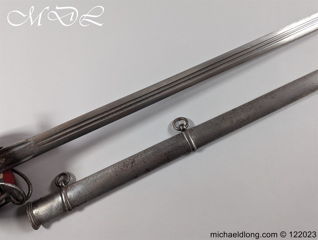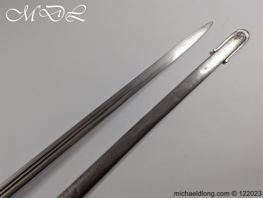 Victorian 74th Highlander Officer’s Sword by Henry Wilkinson early example not number but with the family crest of Fordyce plus initials G W F – George William Fordyce. Regulation basket hilt complete with liner. The broad sword blade in super condition good deep engraving with V R Crown, regimental badge, I X X I and family crest, maker marked Henry Wilkinson Pall Mall London . It is complete with steel scabbard. Notes: Attack on the troops under Lieutenant-Colonel Fordyce of the 74th Highlanders, while forcing their way through the Kroomie Forest on 8th September 1851 Reference: Swords of the British Army Revised Edition page 182 Blade Length: 83cm, overall Length: 101cm