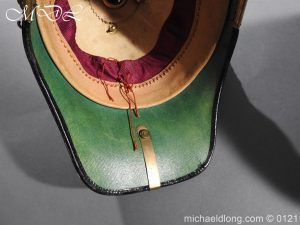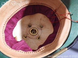 Victorian Bedfordshire Officer’s Blue Cloth Helmet in excellent condition no damage and complete. Victorian regiment plate with blue enamel and silver badge with scroll The Bedfordshire Regiment. It is complete with chin chain, leather and silk liner plus transit tin name plaque has been removed. Spike is a old replacement