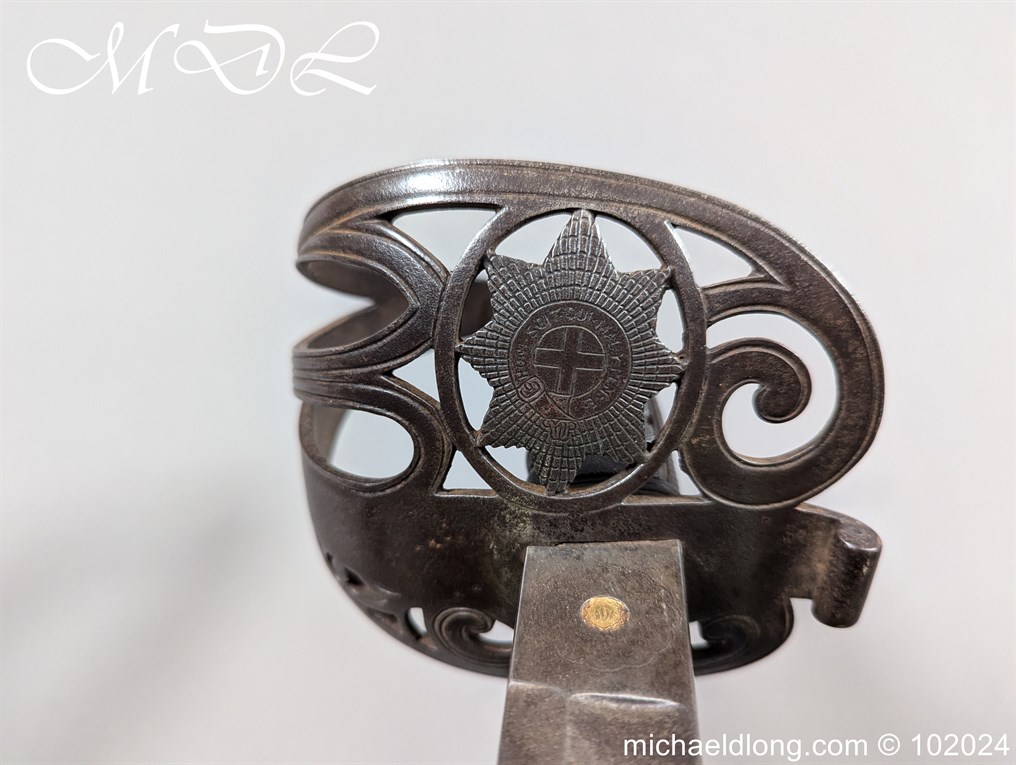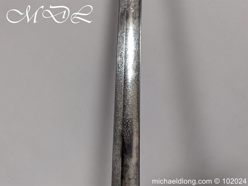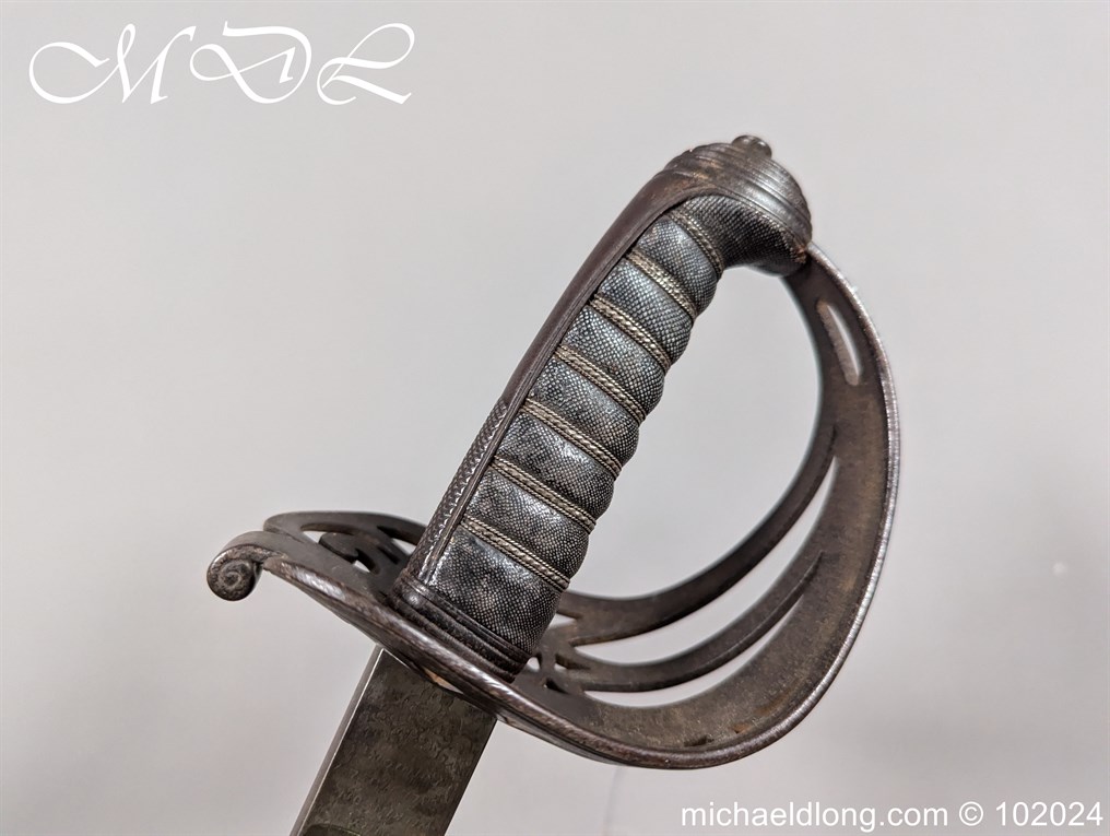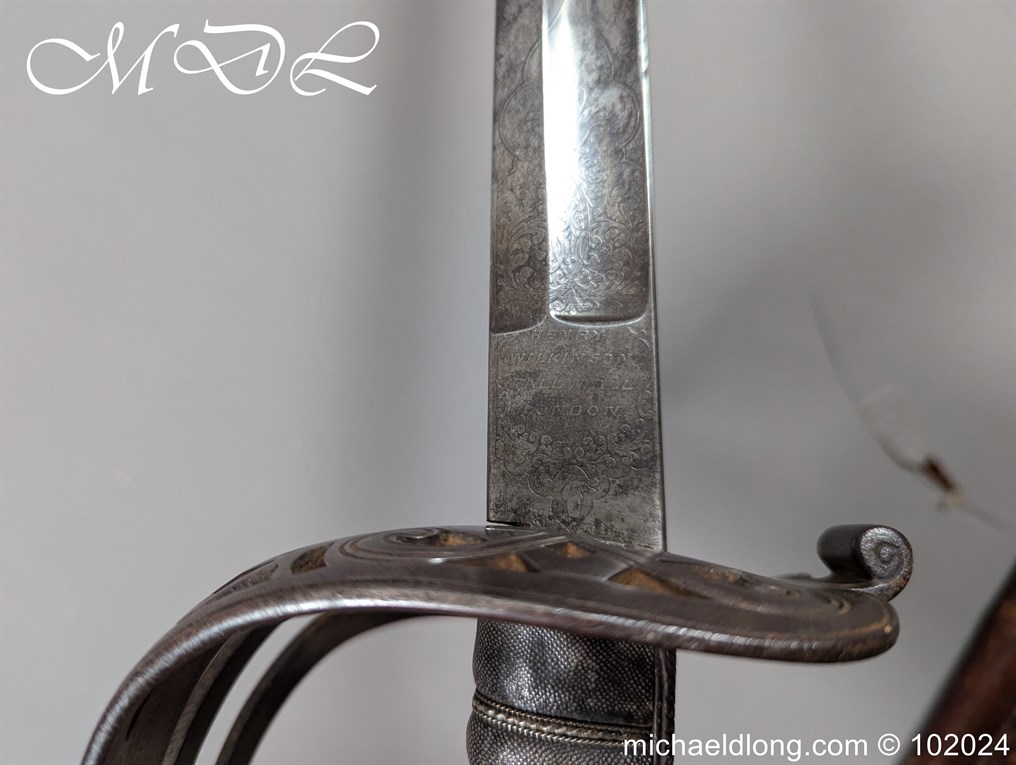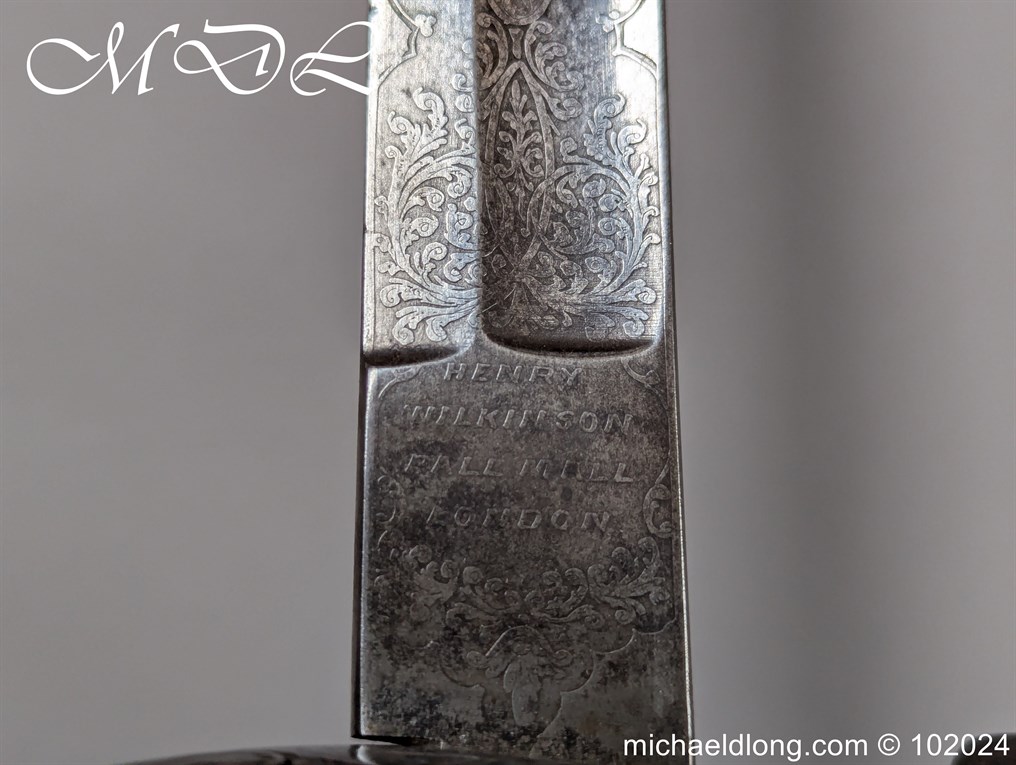 Victorian Coldstream Guards Officers Sword by Wilkinson No 5087 Very early example Henry Wilkinson started numbering sword at 5000 in 1854. Super engraving to the blade including VR, Crown and floral decoration, the hilt regulation with regimental devise and fish skin grip. Spine numbered 5087 and maker marked Henry Wilkinson London, complete with leather scabbard with brass mounts.