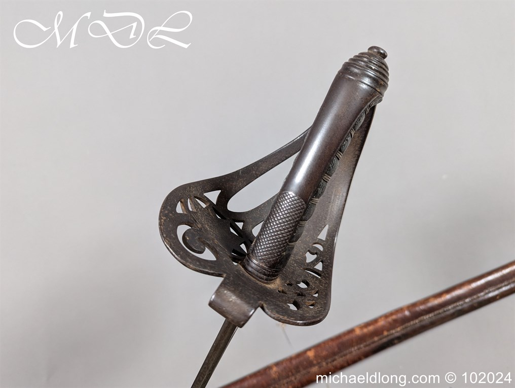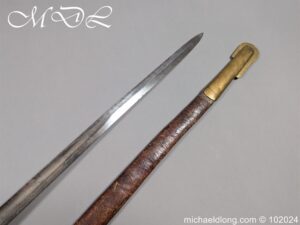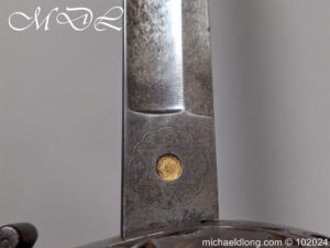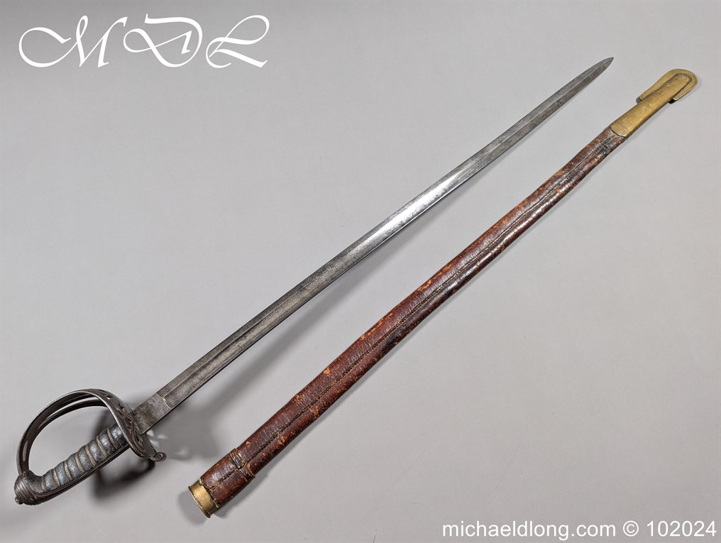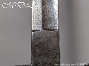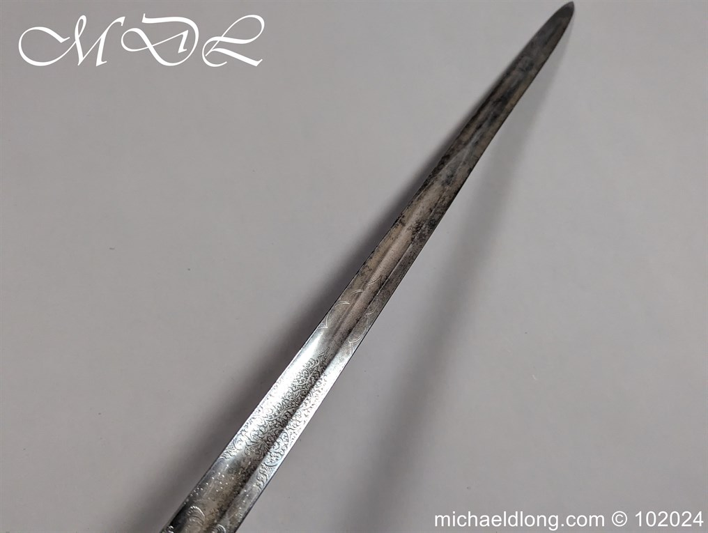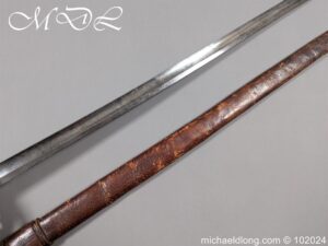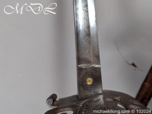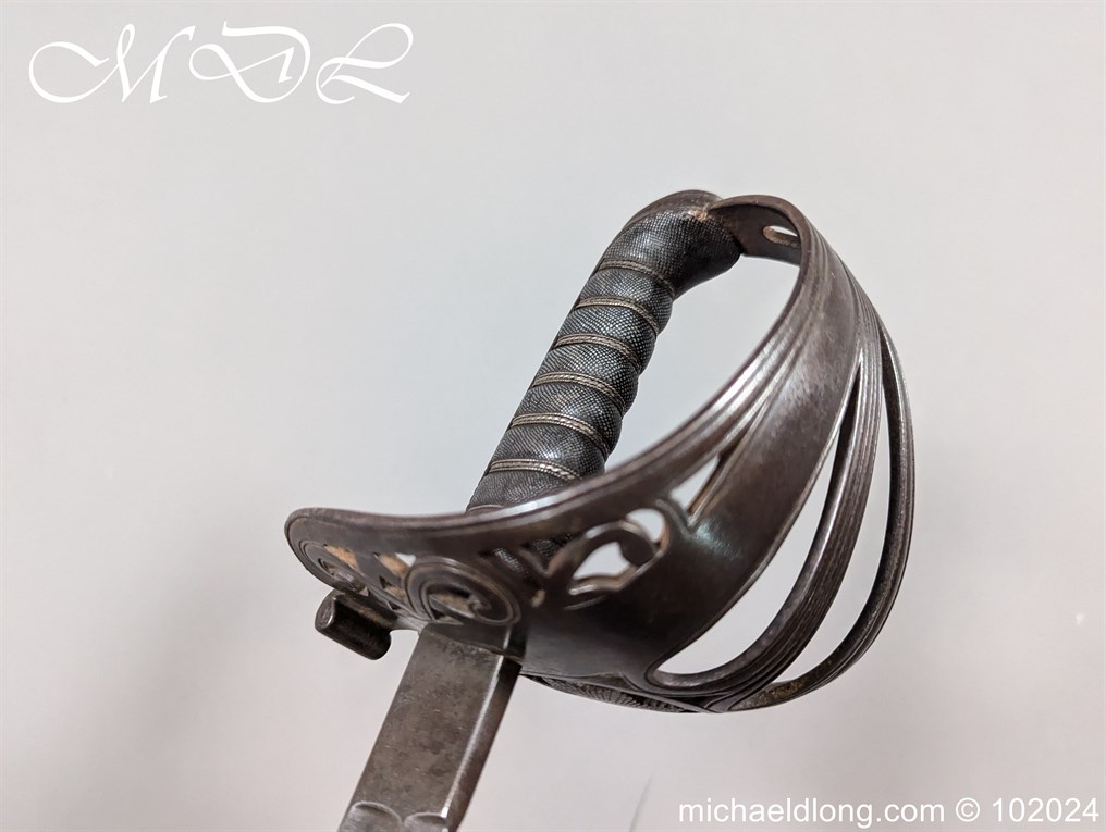 Victorian Coldstream Guards Officers Sword by Wilkinson No 5087 Very early example Henry Wilkinson started numbering sword at 5000 in 1854. Super engraving to the blade including VR, Crown and floral decoration, the hilt regulation with regimental devise and fish skin grip. Spine numbered 5087 and maker marked Henry Wilkinson London, complete with leather scabbard with brass mounts.