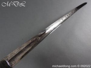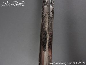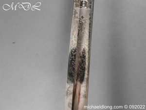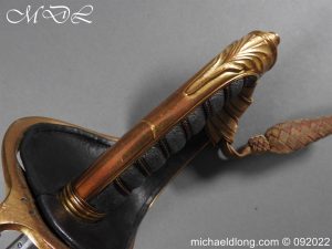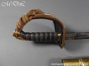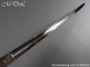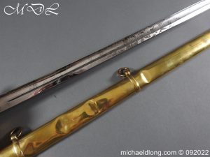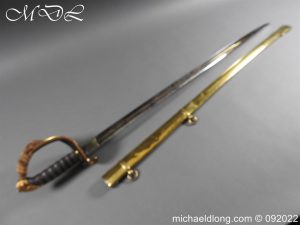 Victorian General Officer’s Sword by Henry Wilkinson very early production number 9703 1859 production. Brass Gothic hilt with General officer’s crossed sword and baton in cartouche with wreath and crown over. Brass stepped pommel and back strap with fish skin grip bound with brass wire and complete with black leather liner and knot. The stunning blade engraved with foliage VR with crown and crossed sword and baton. Makers details Henry Wilkinson London, complete with matching brass scabbard which does have some age dents.