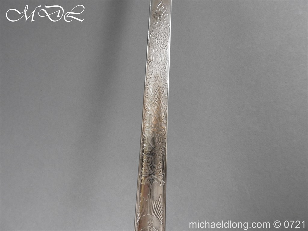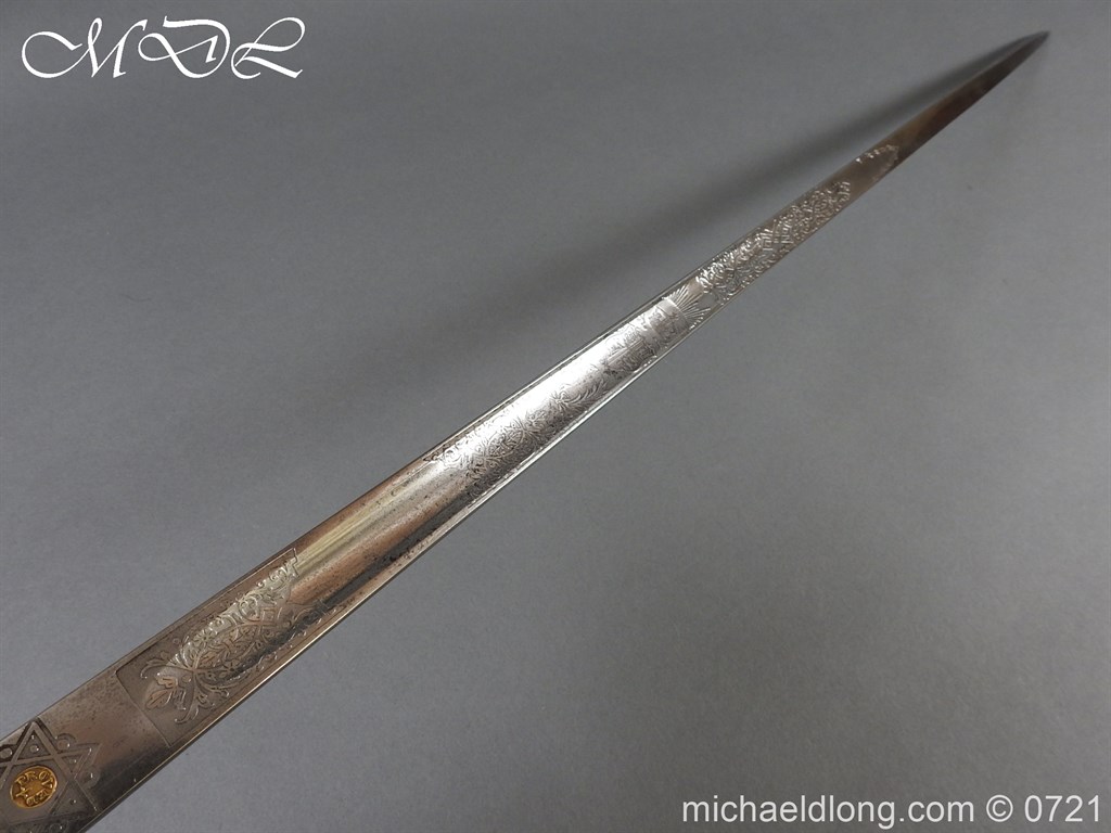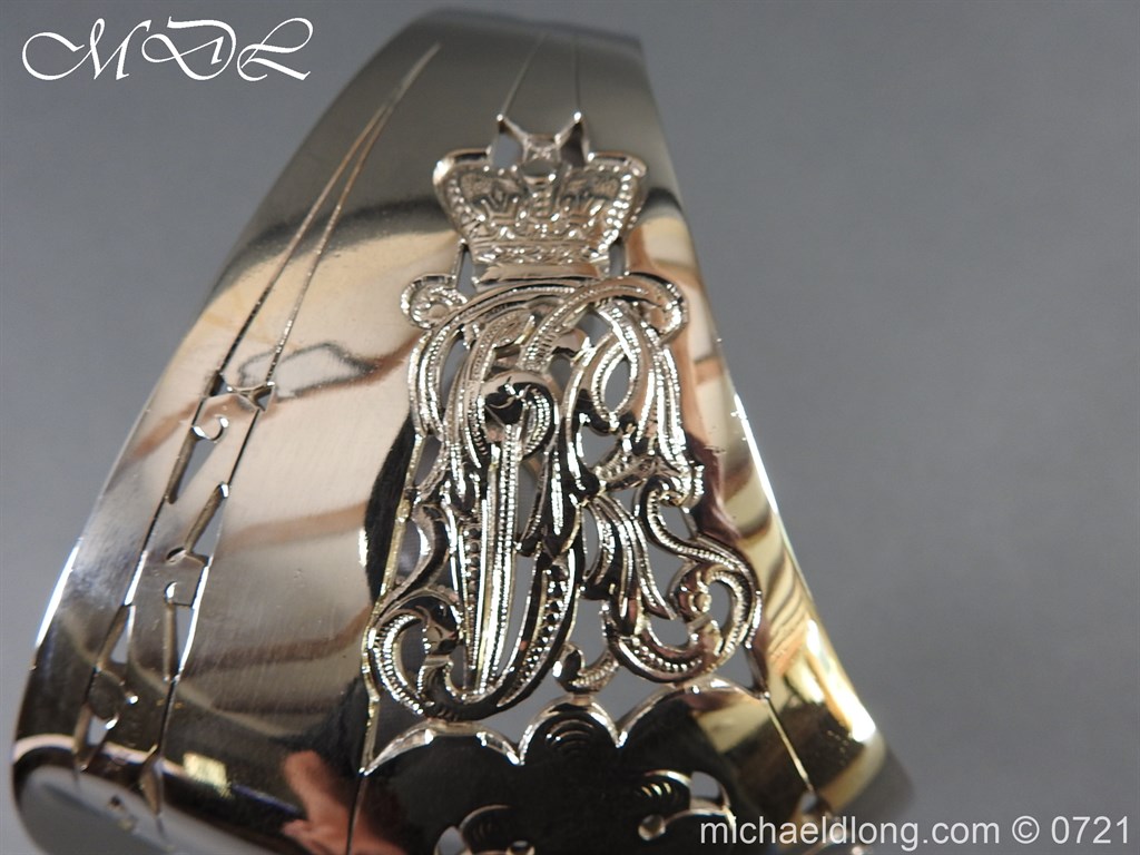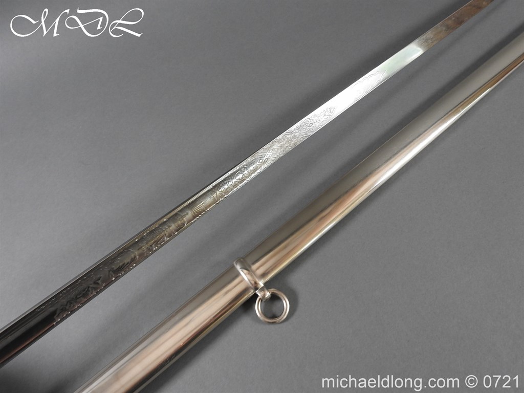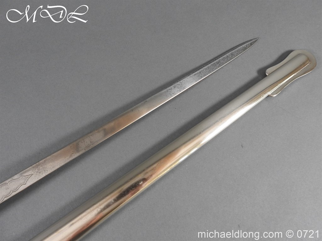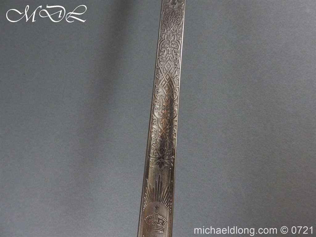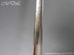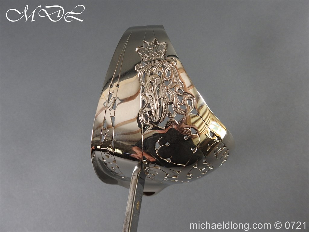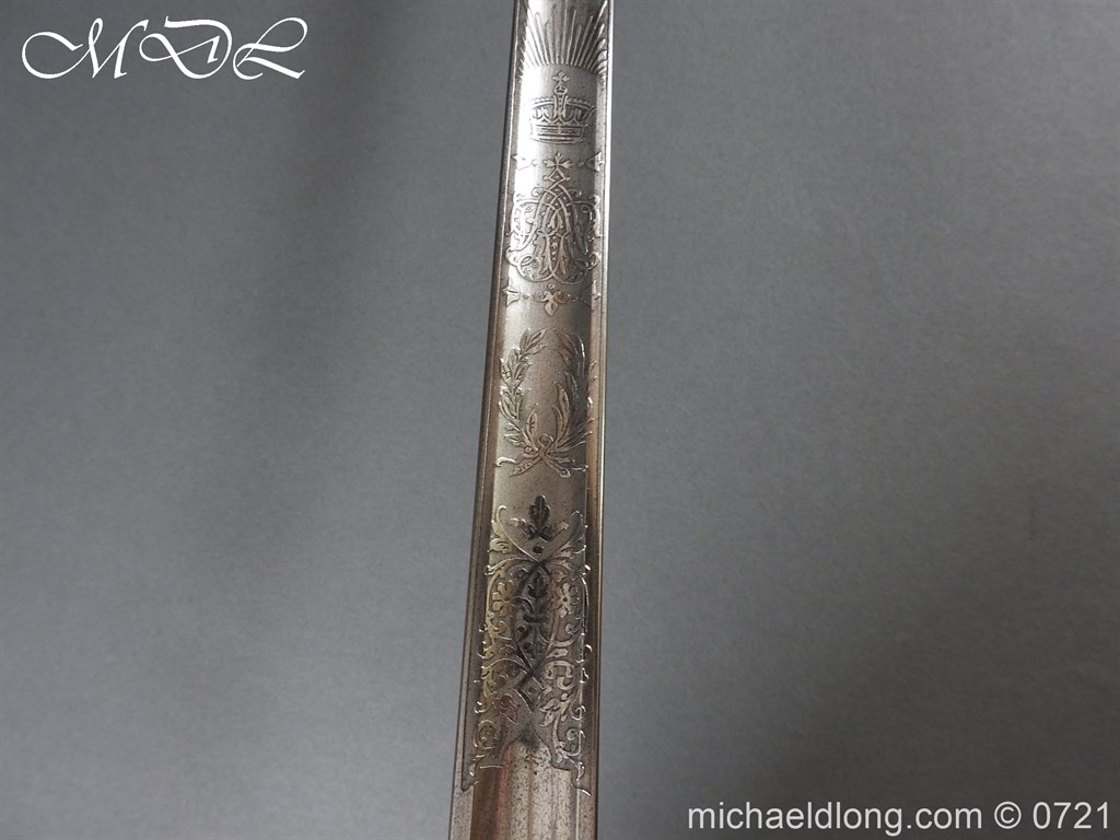 The blade which is engraved with Royal cipher and crown to one side the reverse with Royal Coat of Arms and crown plus proof plug. Complete with polish steel scabbard.