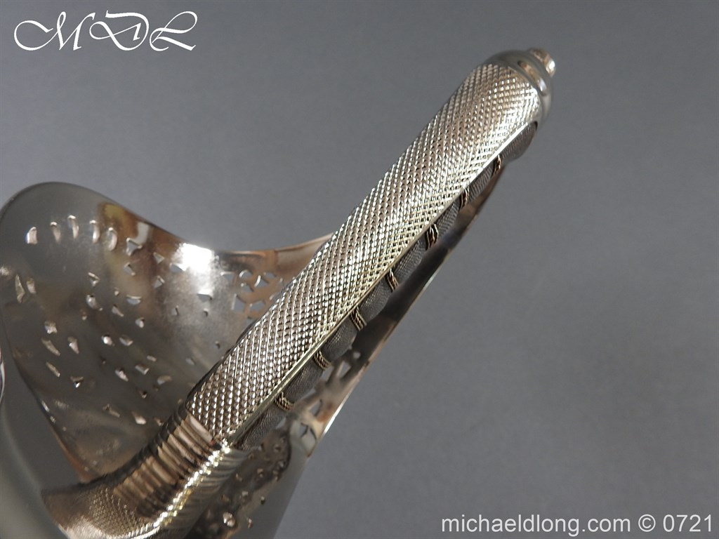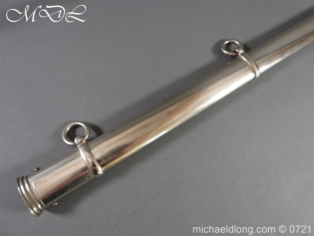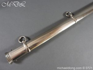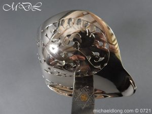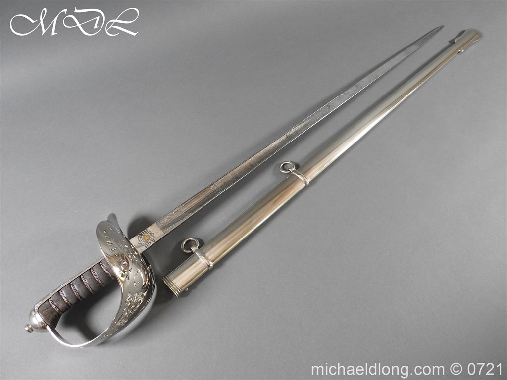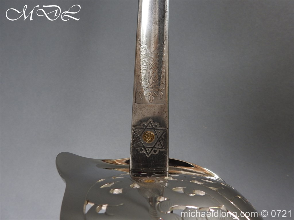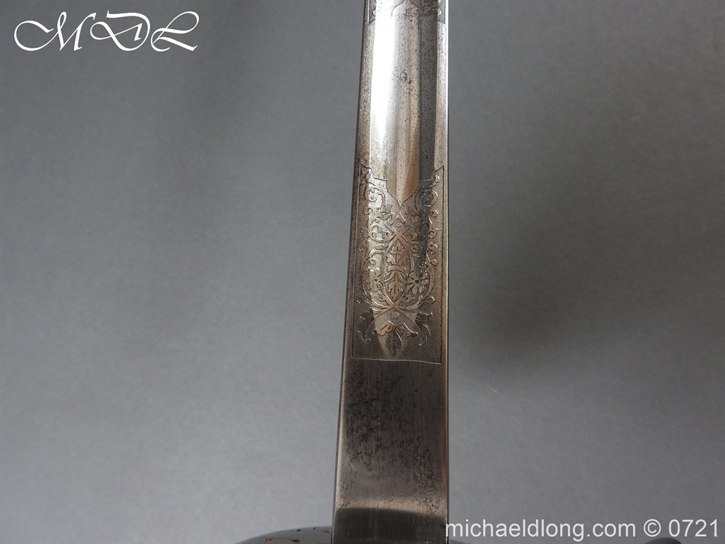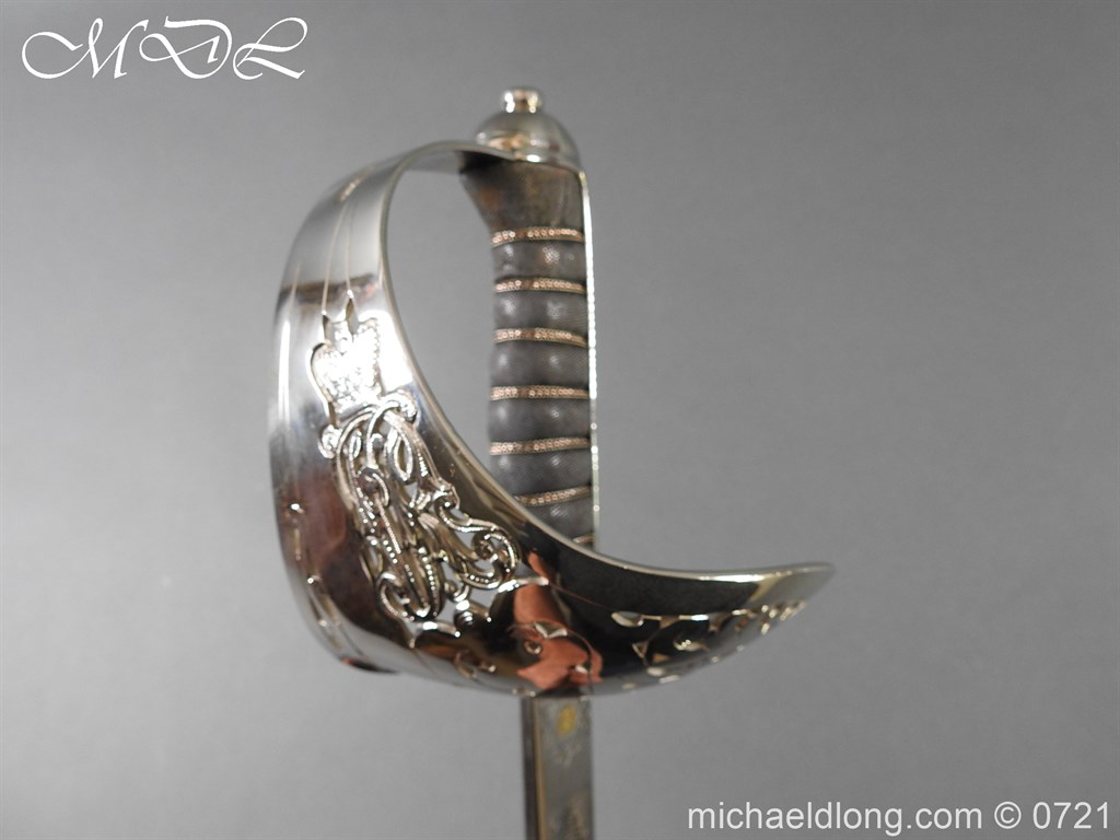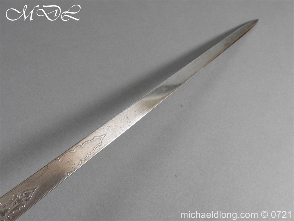 The blade which is engraved with Royal cipher and crown to one side the reverse with Royal Coat of Arms and crown plus proof plug. Complete with polish steel scabbard.
