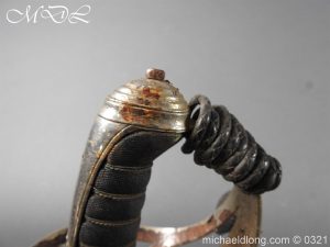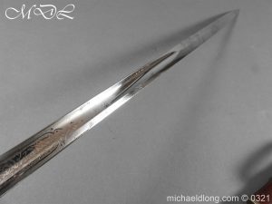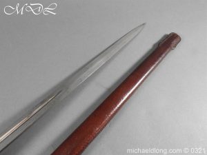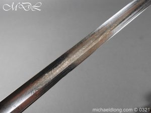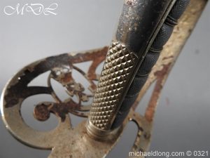 Victorian Middlesex 5th Rifle Voluneer’s Officer’s Sword regimental hilt with plating loss fish skin grip and black leather knot. The blade etched with VR crown and regiment details to reverse maker marked Firman and Son London and complete with field scabbard.