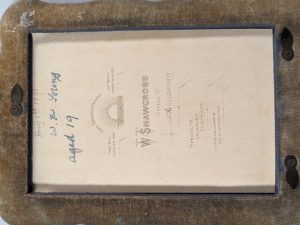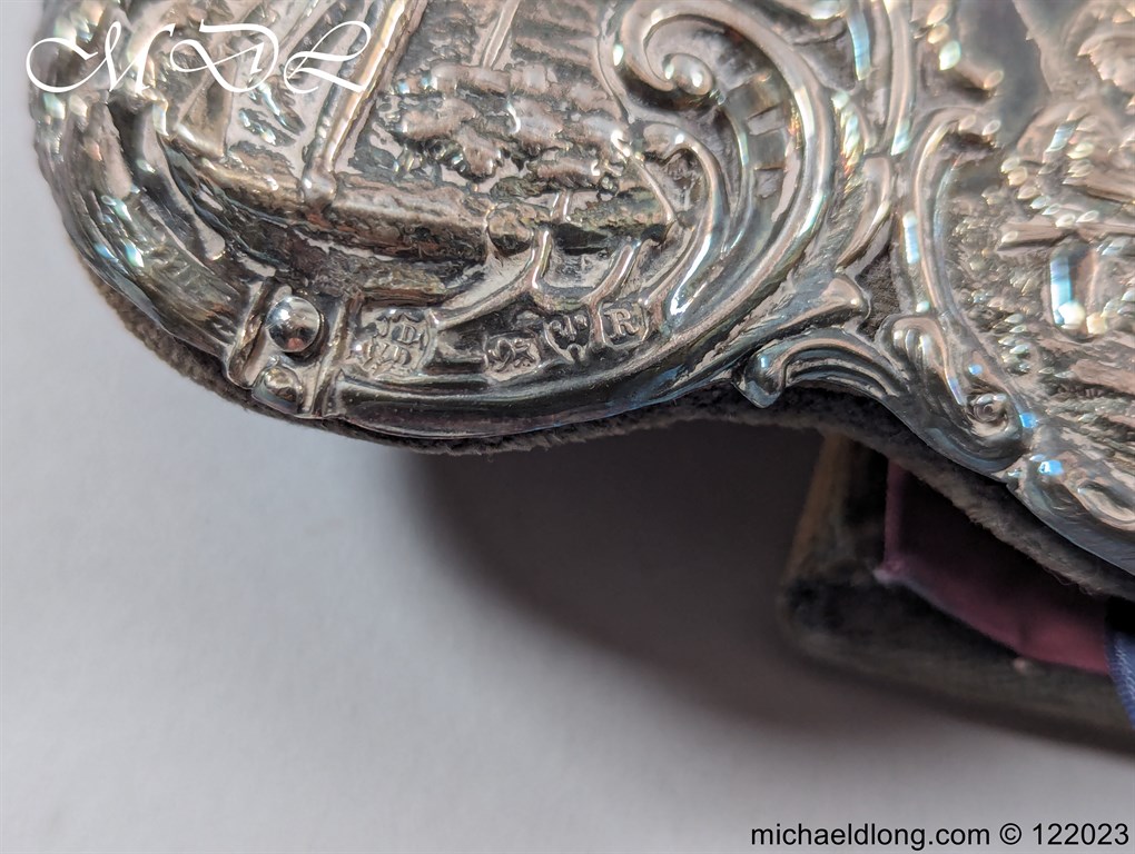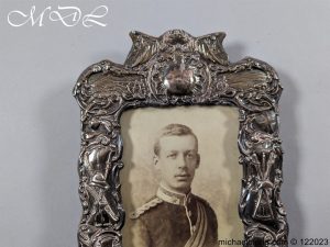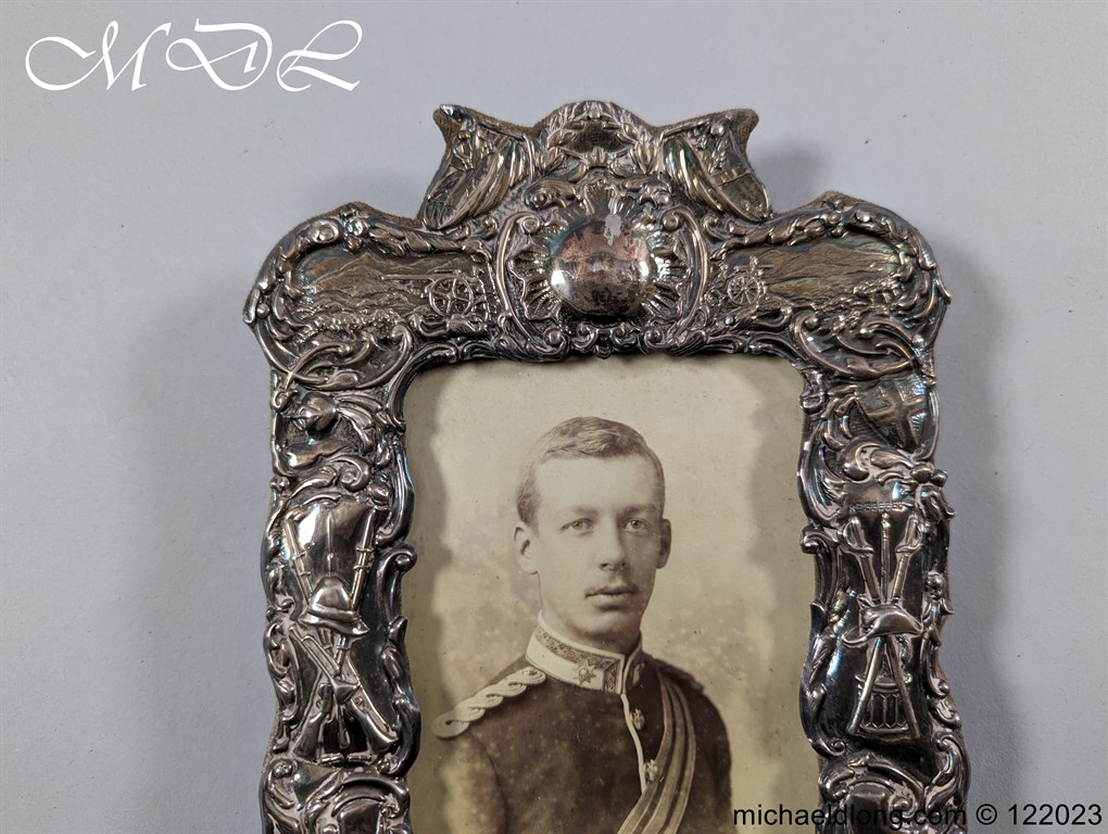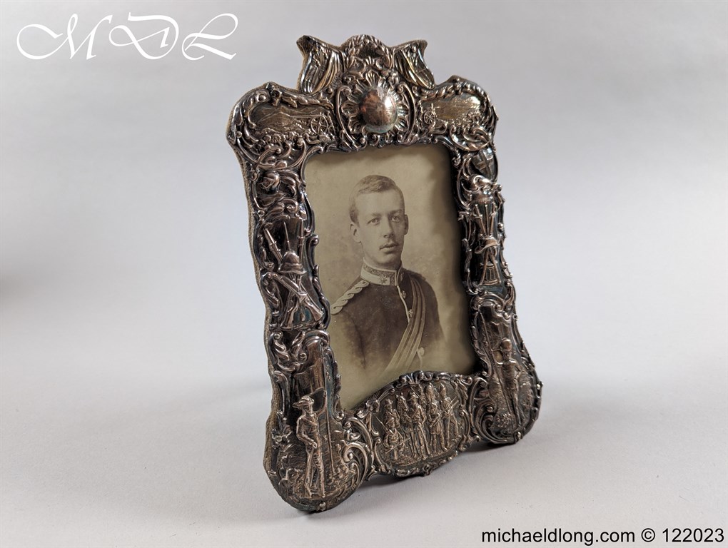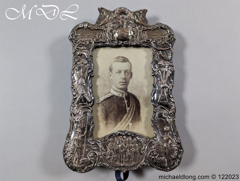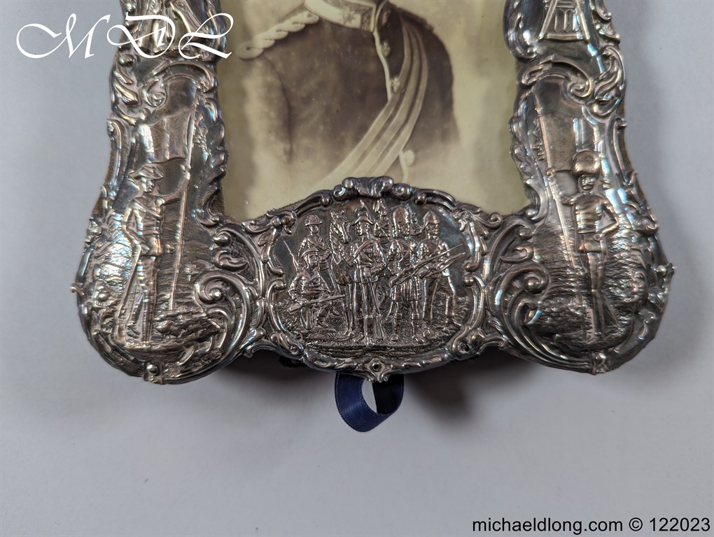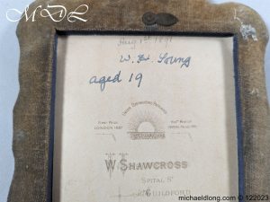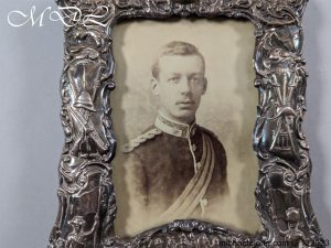 Victorian Military Boar War Period Silver Photo Frame in nice condition no damage and with original photo of an officer the back marked Aug 1st 1891 W H Young aged 19 taken by W Shawcross Guildford. Made by Silversmiths Deakin & Francis and hallmarks for Chester c 1900.The size is 8.75 by 6.25 inch, the aperture 4.5 by 3.25 inch approx velvet backing with stand