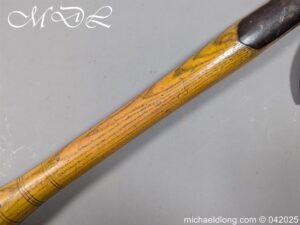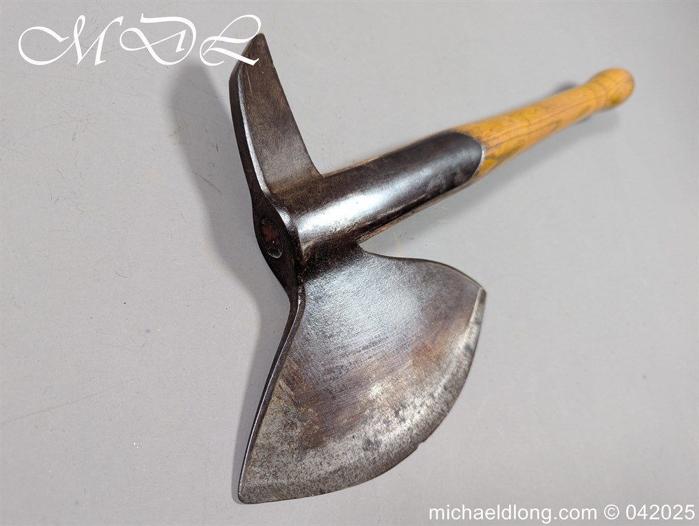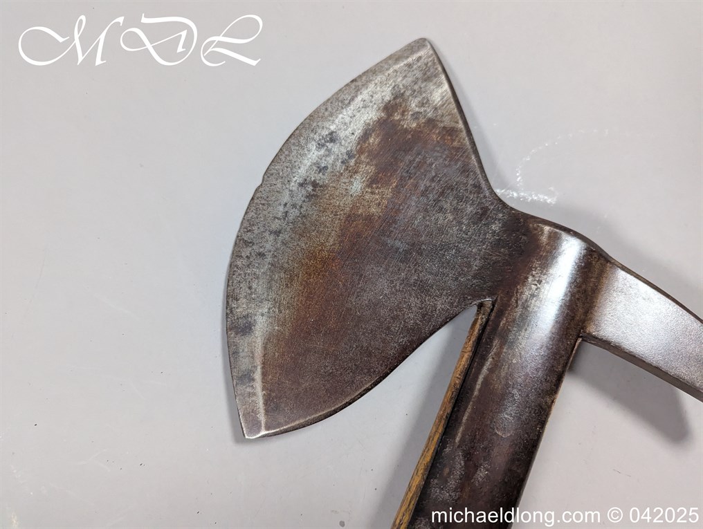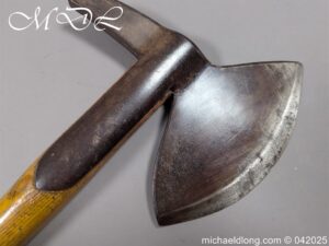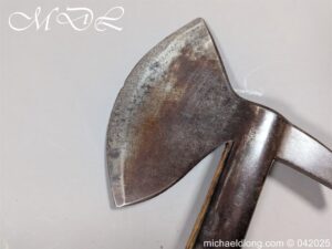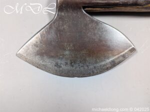 Victorian Naval Boarding Axe c 1850, large curved cutting head with spike. Secured to the shaft by rivetted straps. The shaft is swollen towards the end for better grip and is 19 inches in length 49cm the width of the head 9 inches 23cm