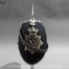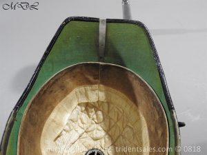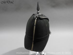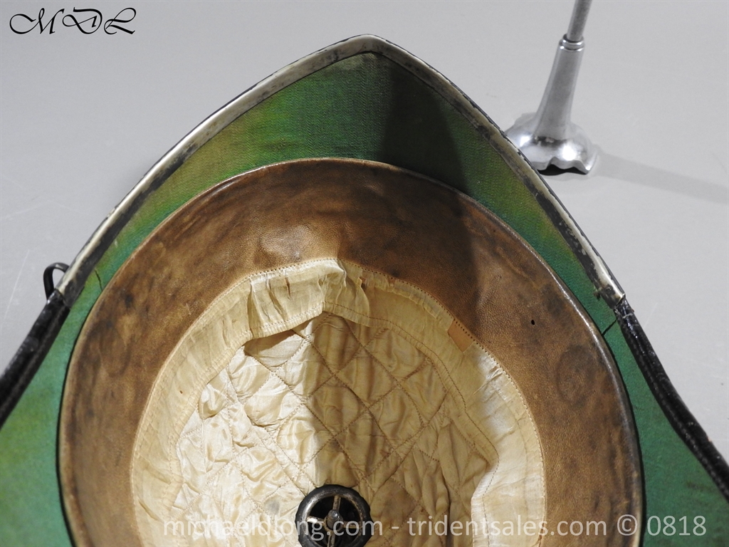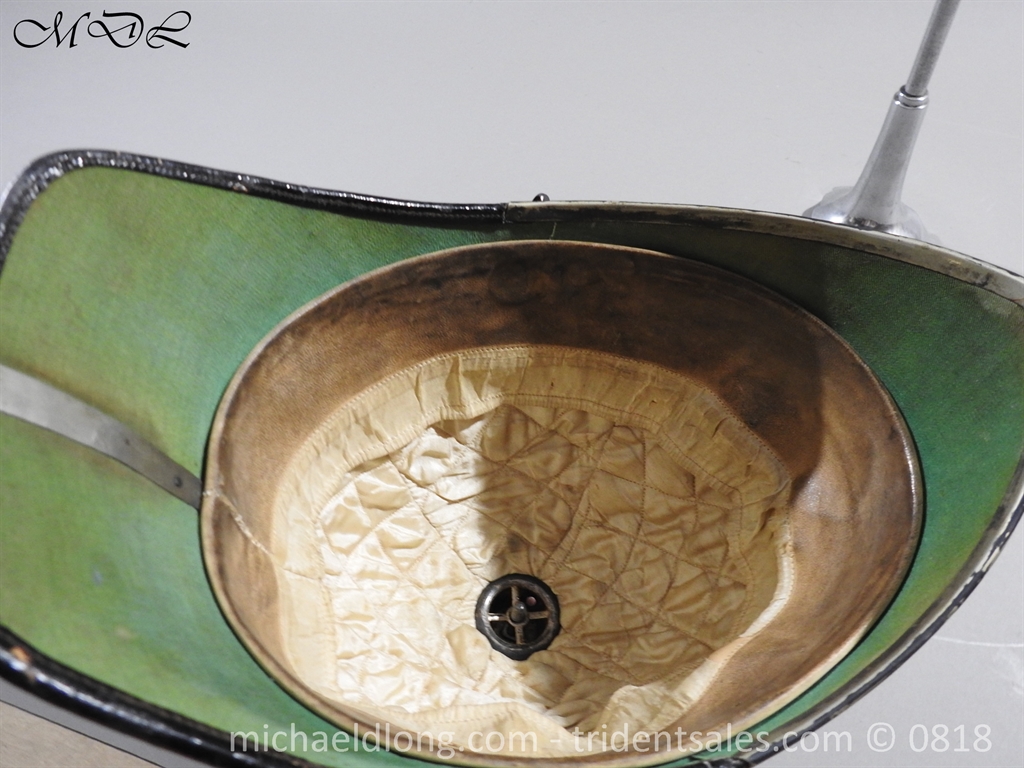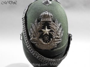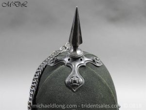 Victorian period Officer’s Green Cloth Helmet 5th Vol Btn Scottish Rifles, in very good condition the white metal fitting have darken nicely with age no damage or moth. Internal padded silk liner with leather sweat band and complete with velvet back chin chain.