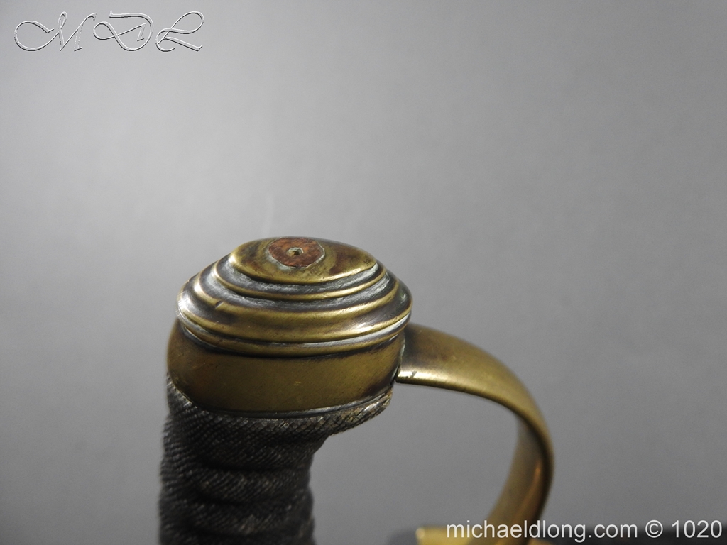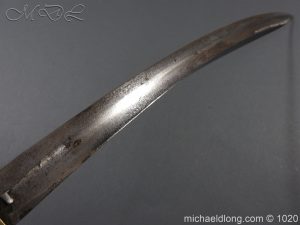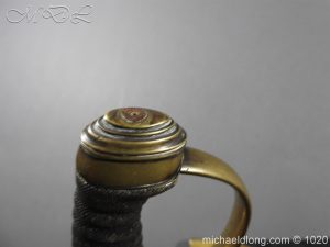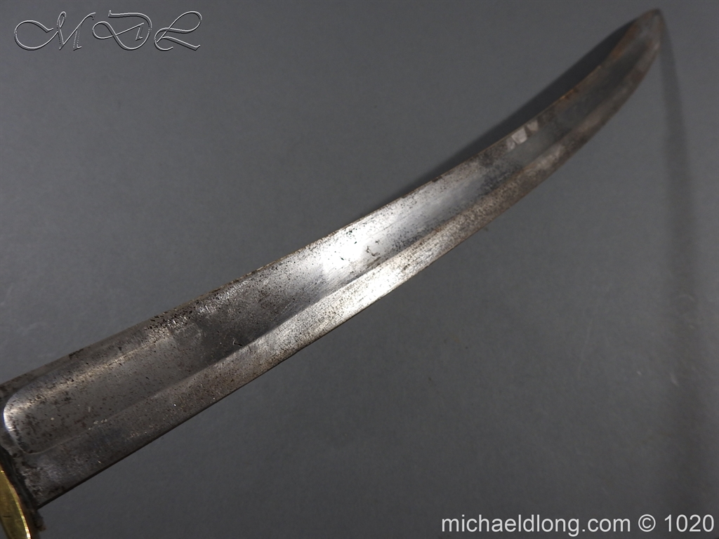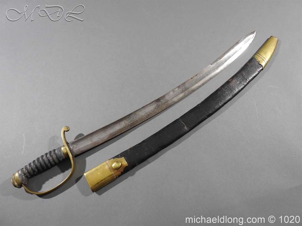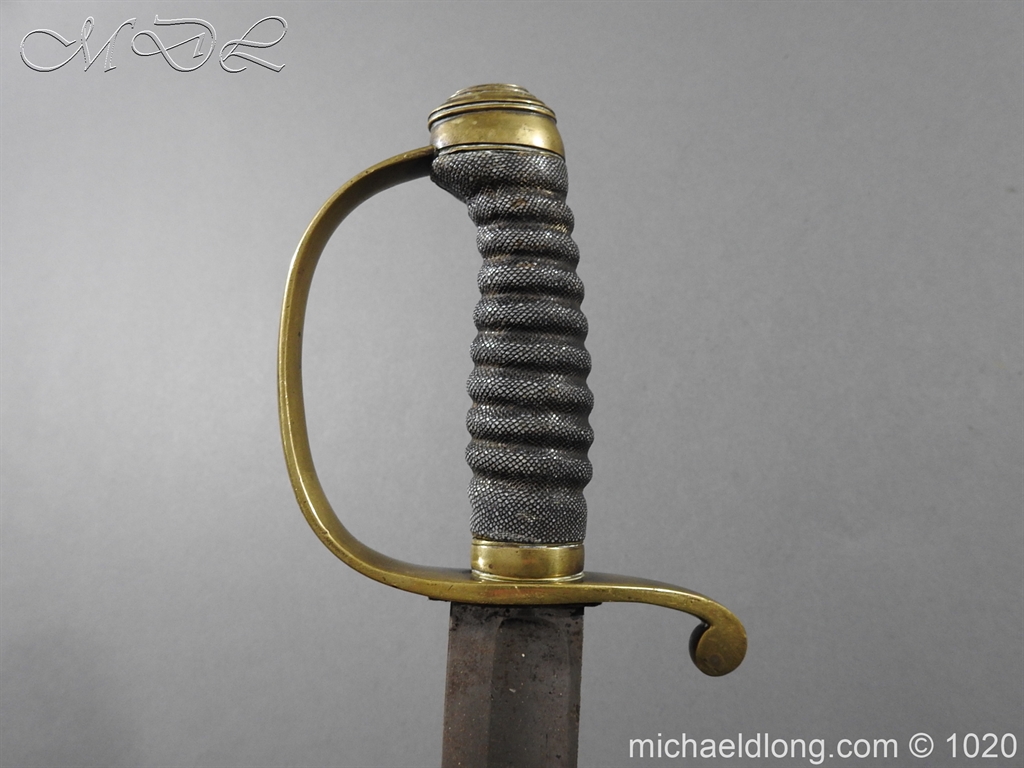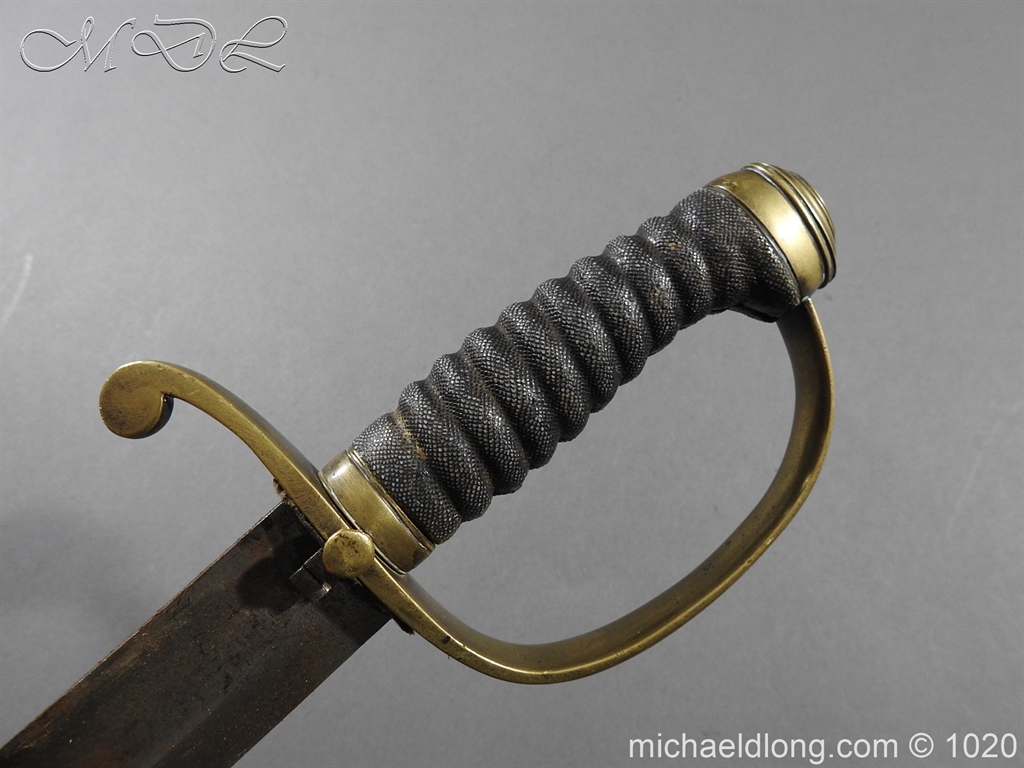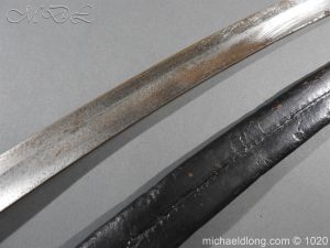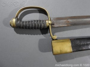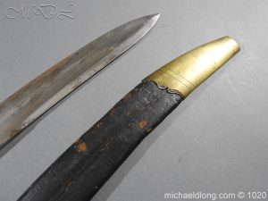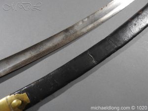 Victorian Police Sword brass D guard hilt with fish skin grip. The blade curved and showing age wear complete with brass mounted leather scabbard catch in working order.