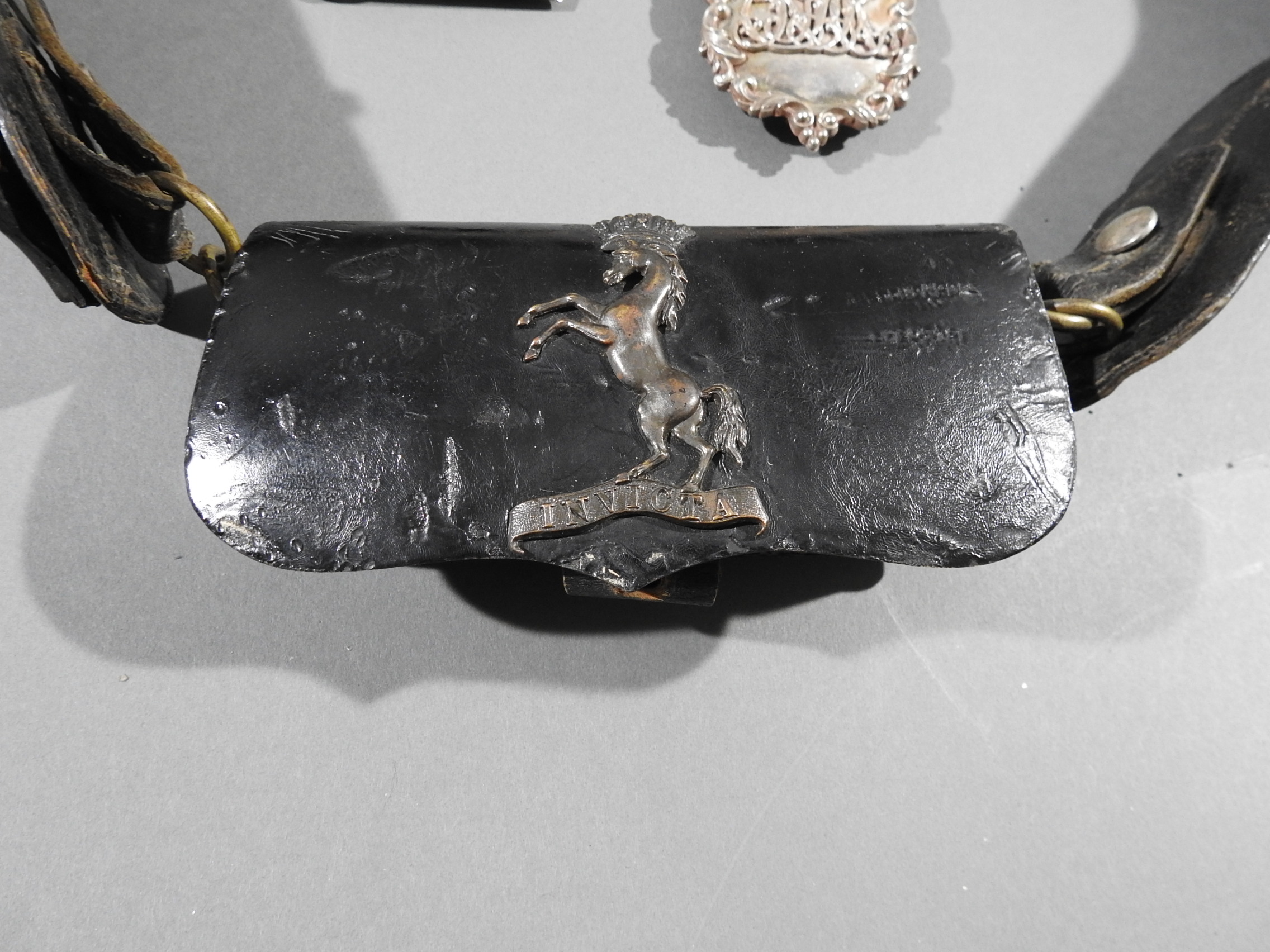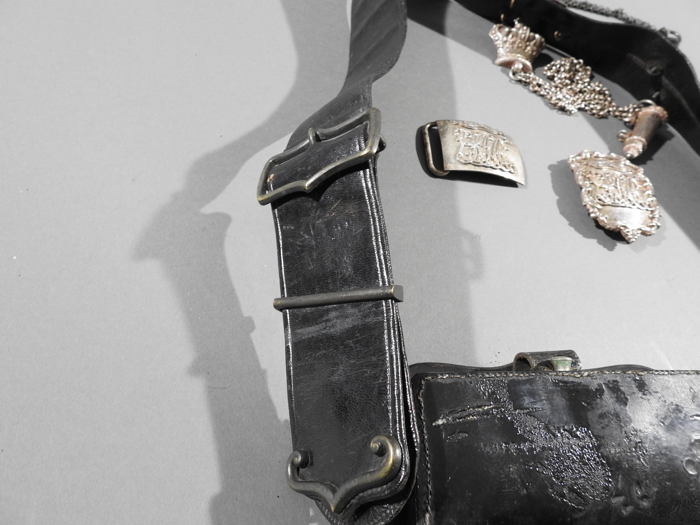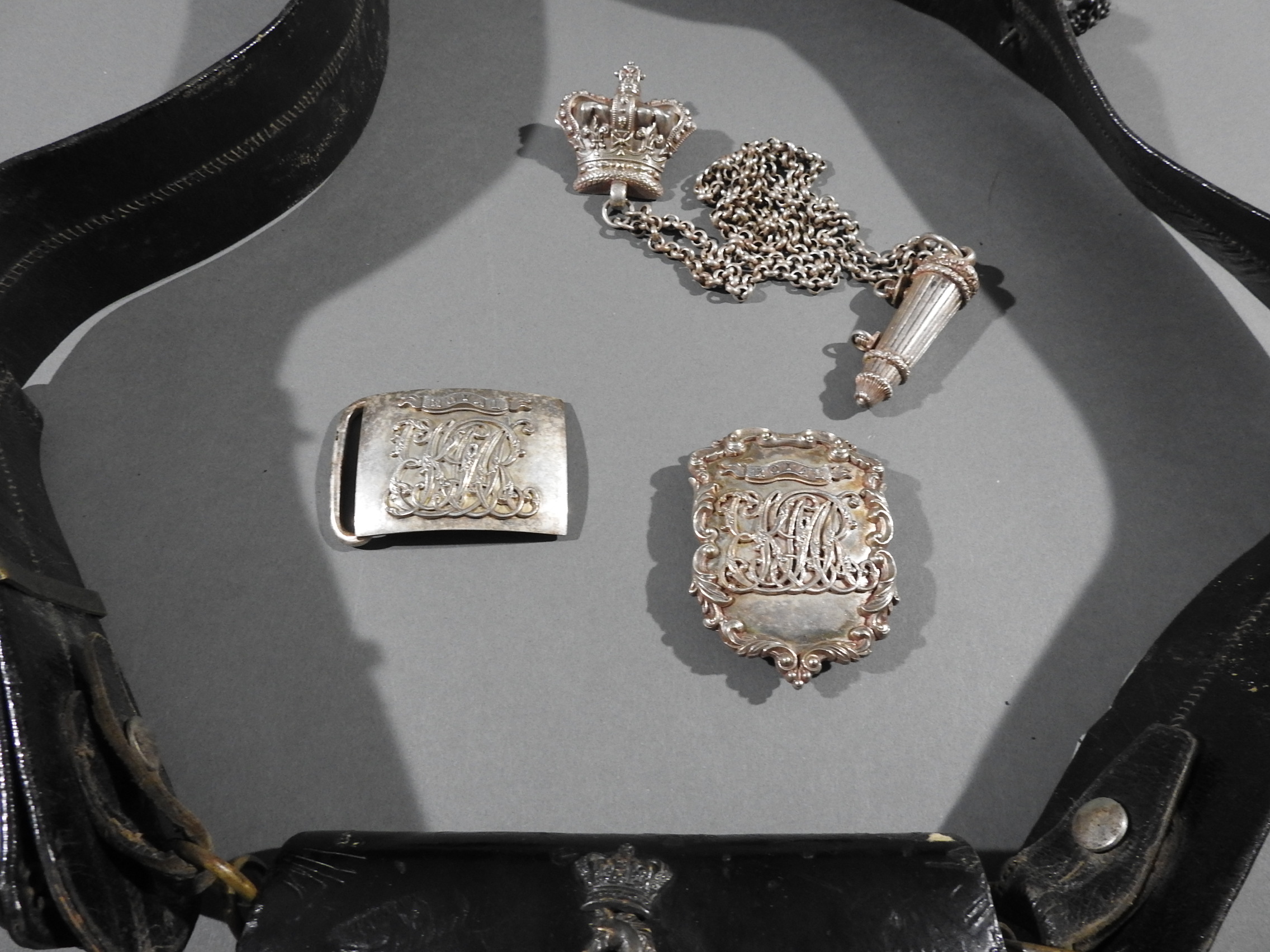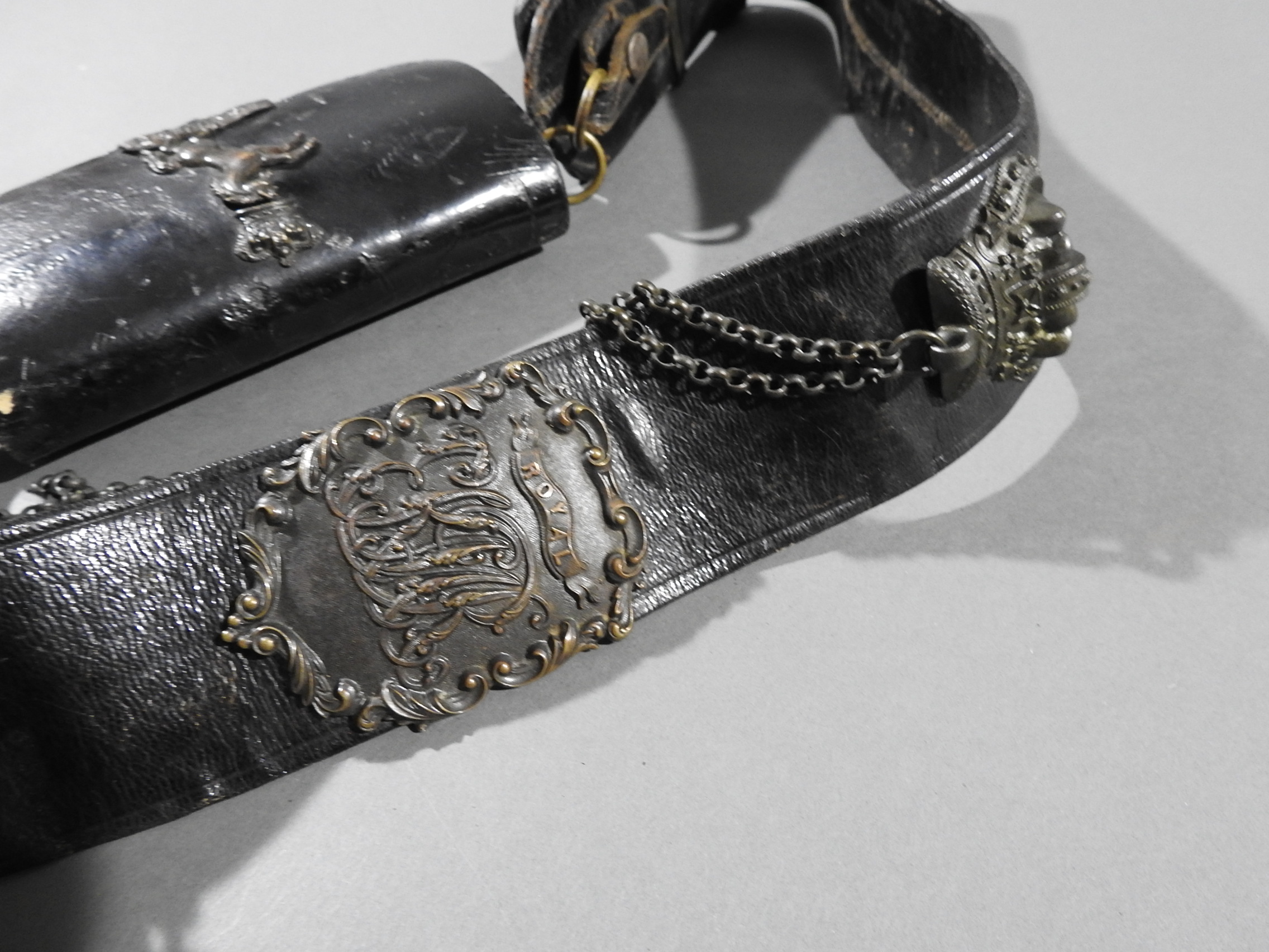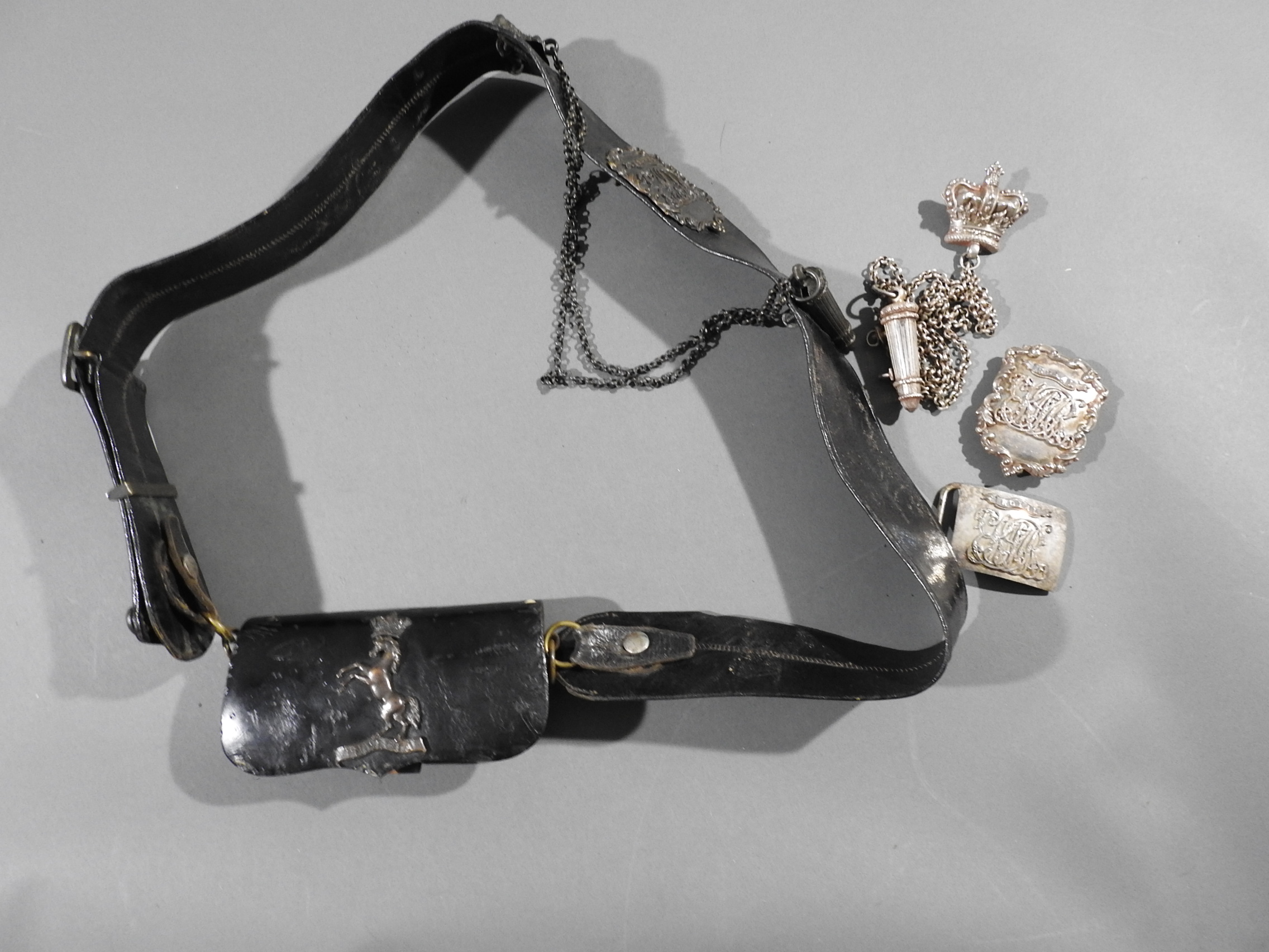 A Victorian black leather cross belt and pouch, the pouch with regimental badge to centre with original paper makers label to inside, Andrews London. The cross belt with blackened fittings, Victorian crown boss, regimental plate and whistle. Included in the sale is what we think maybe the dress fittings for the belt which are all the same as the ones on the belt but in silver, no hallmarks plus dress belt buckle.
