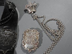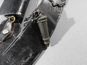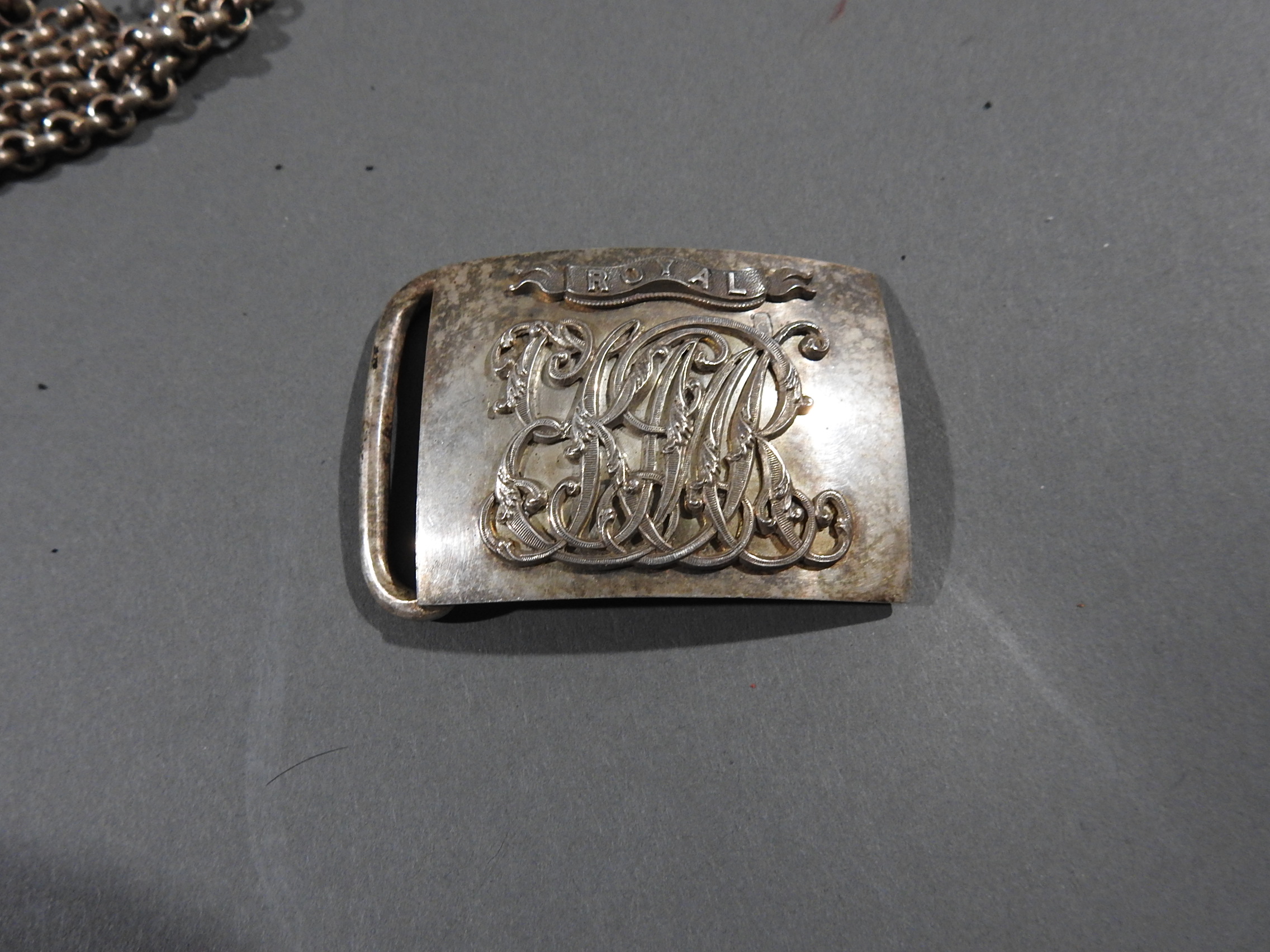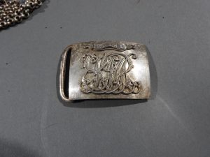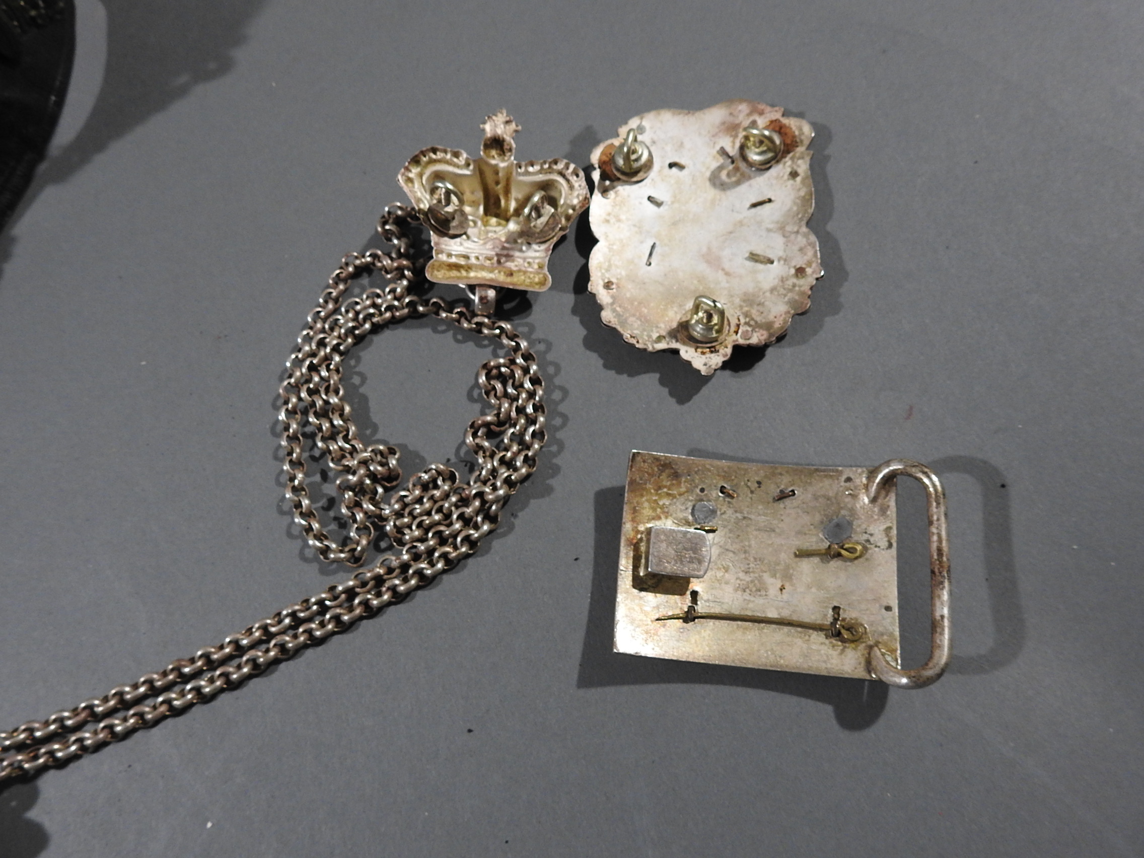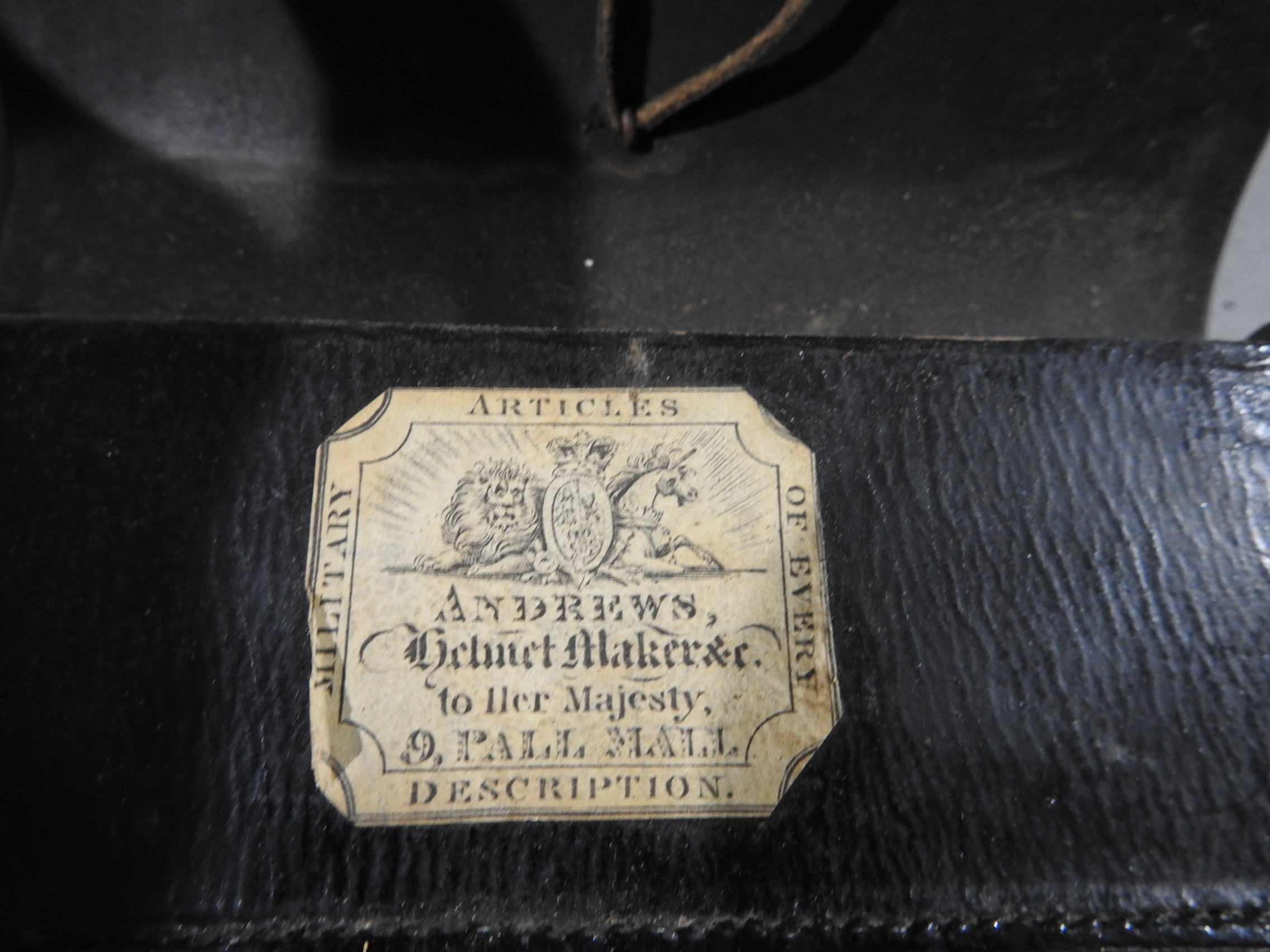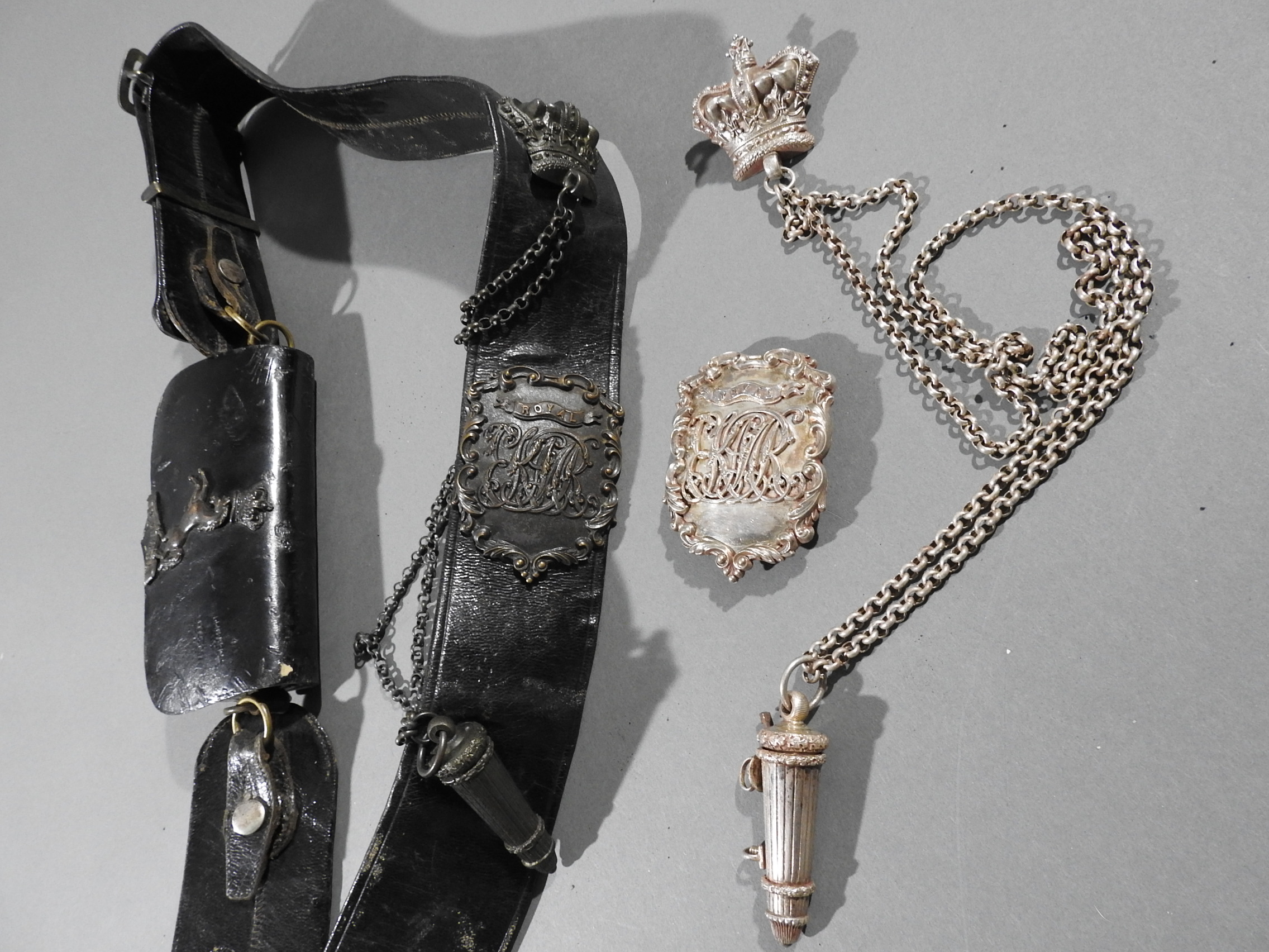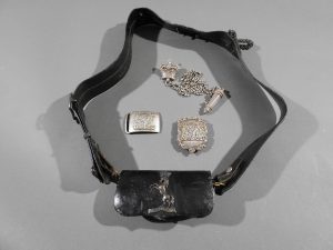 A Victorian black leather cross belt and pouch, the pouch with regimental badge to centre with original paper makers label to inside, Andrews London. The cross belt with blackened fittings, Victorian crown boss, regimental plate and whistle. Included in the sale is what we think maybe the dress fittings for the belt which are all the same as the ones on the belt but in silver, no hallmarks plus dress belt buckle.