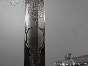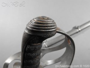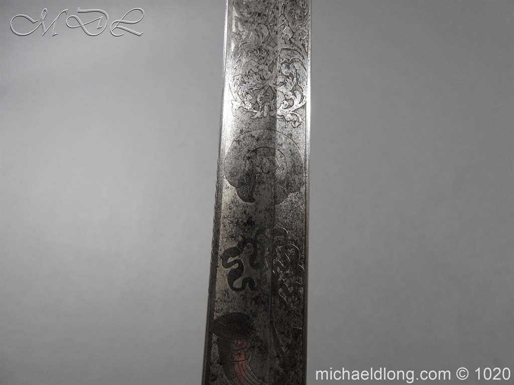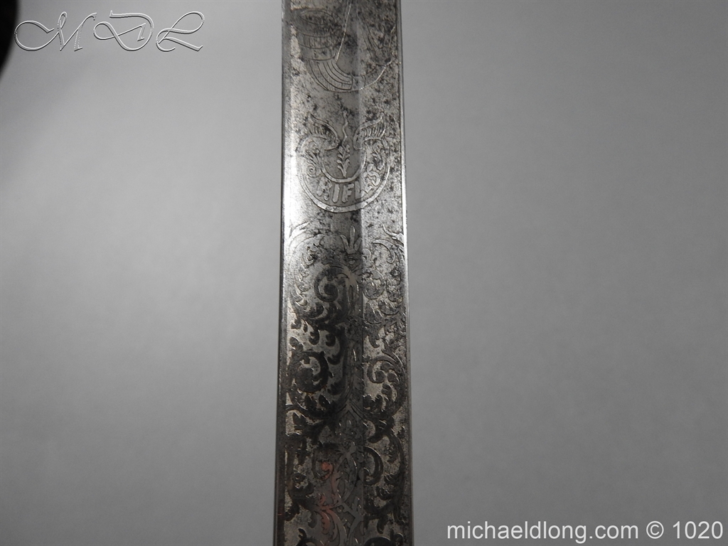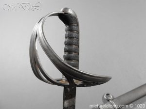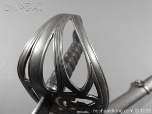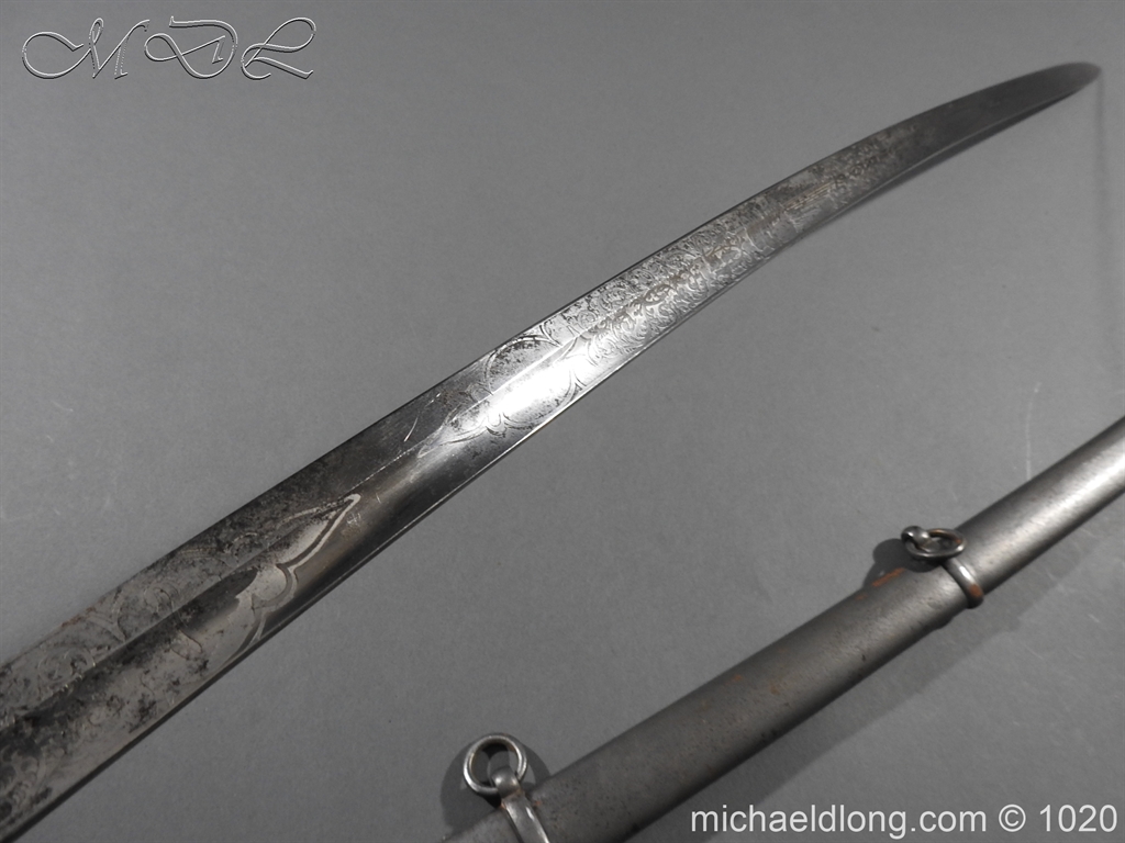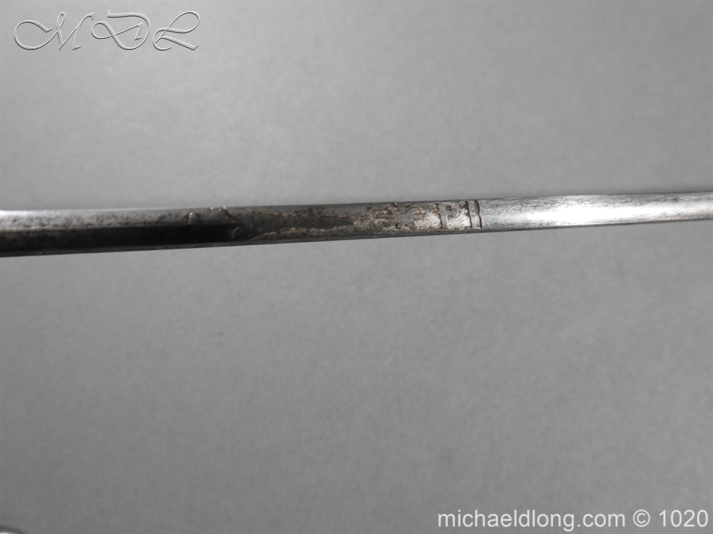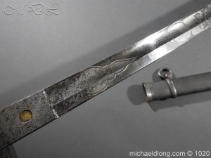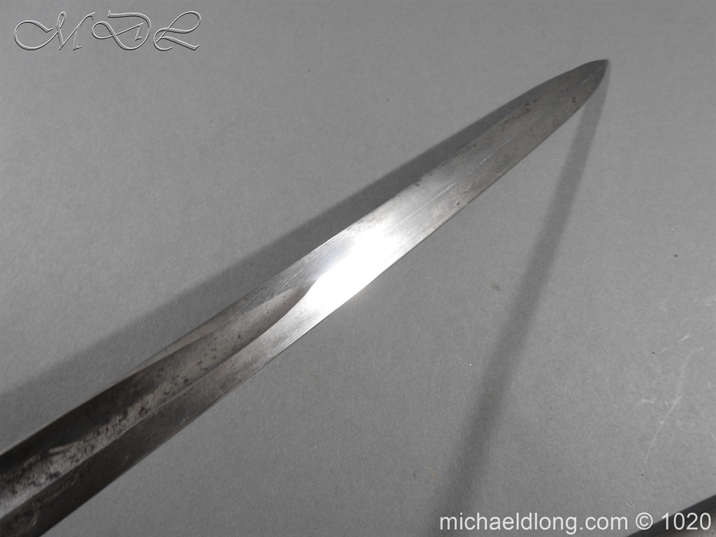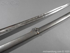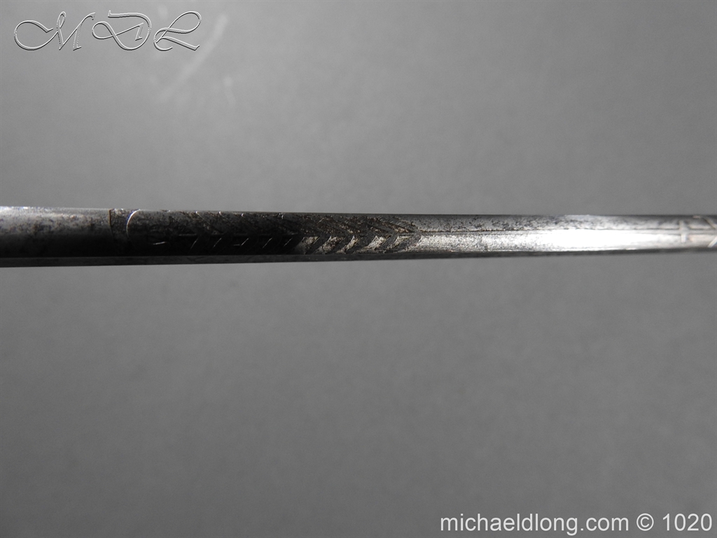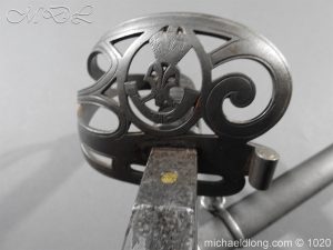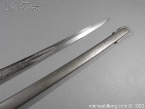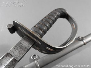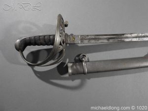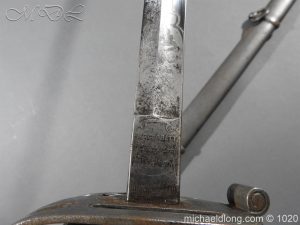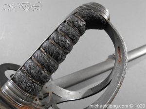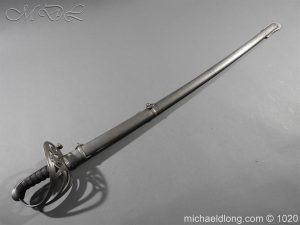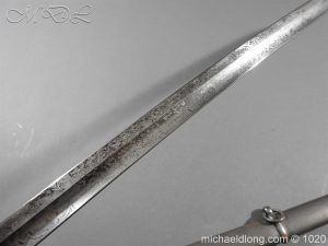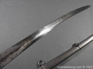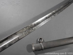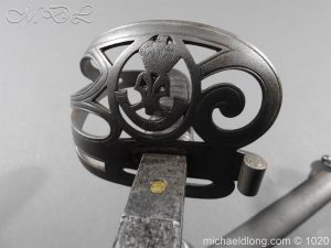 Victorian Rifle Regiment Officer’s Sword with regimental hilt with fish skin grip. The slightly curved blade engraved with V R crown the reverse with slug bugle and RIFLES. Brass proof plug and maker marked H G Gobbett Contractor Halesworth complete with steel scabbard.