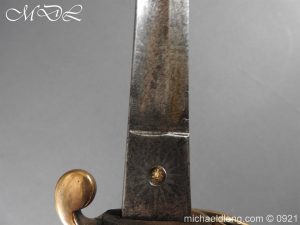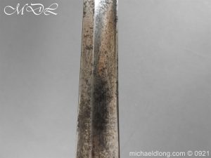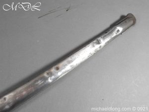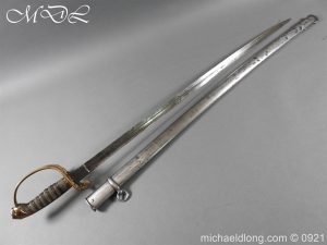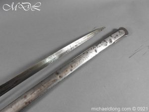 Victorian Robin Hood Rifles Officer’s Sword early example by Reeves London brass regulation hilt stamped with various letters and number with V R and crown complete with stepped pommel and wire bound fish skin grip. The slightly curved blade is well etched with crossed lances, crown and Robin Hood Rifles with slung bugle the reverse with the same but with shield. Complete with steel scabbard single ring.
