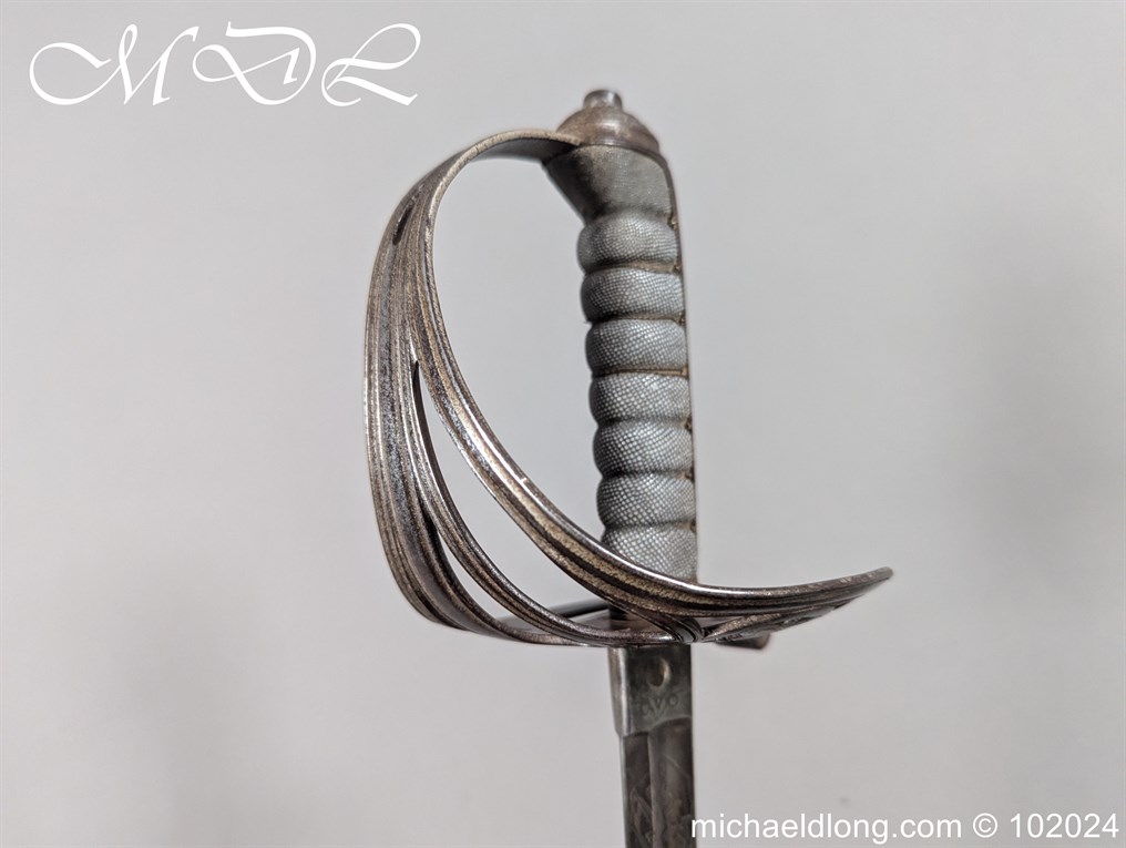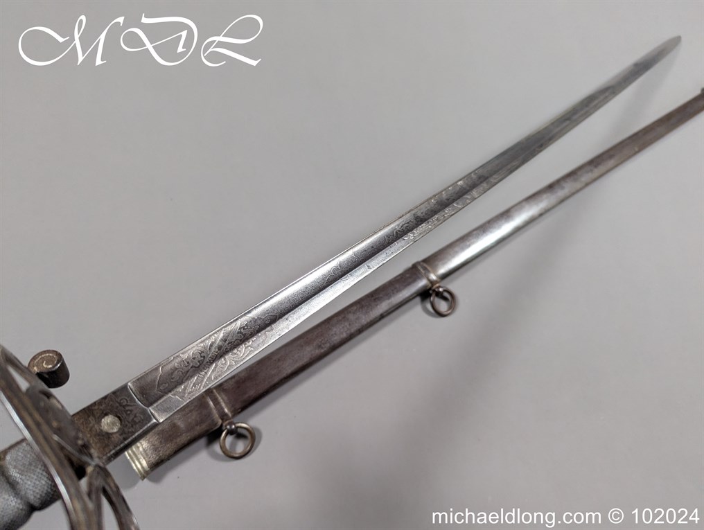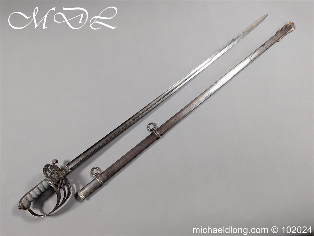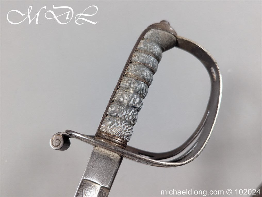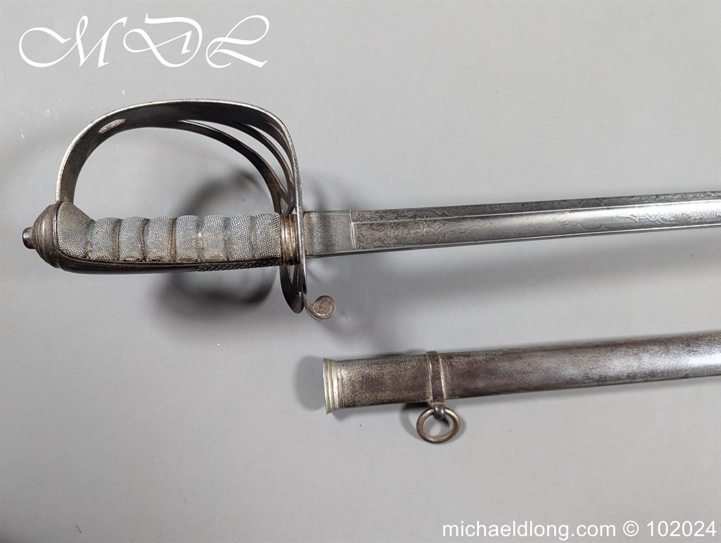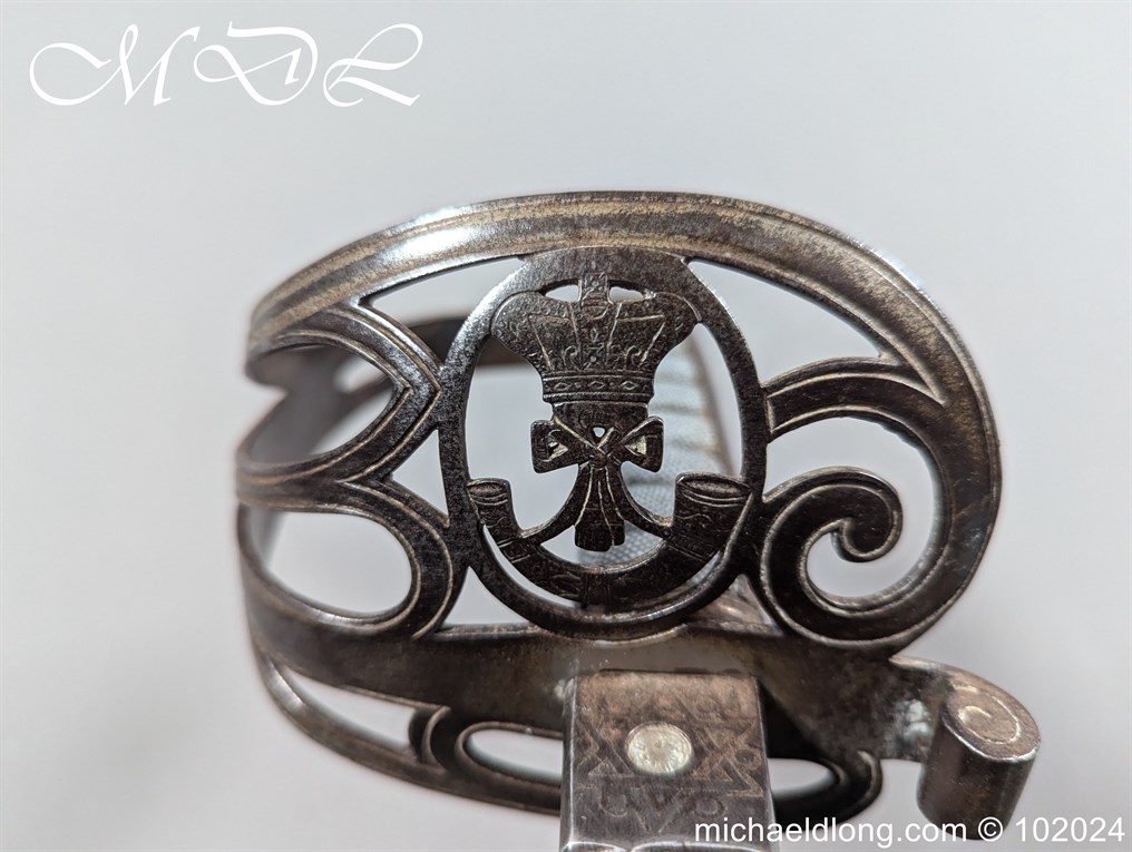 Victorian Robin Hood Rifles Officers Sword belonging to Gilbert Smith Doughty. Regulation hilt with slung bugle and fish skin grip. The blade engraved with regiment devise to one side the reverse with VR and crown plus owners name G S Dough and complete with matching steel scabbard. Overall length 100cm the blade 83cm Information: Gilbert Smith Doughty served with the Robin Hood Rifles and in 1894 was appointed a captain and later became an architect designing many buildings in Nottingham