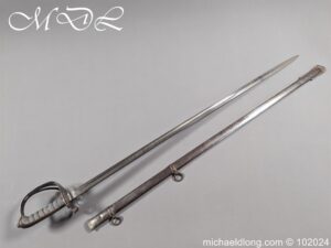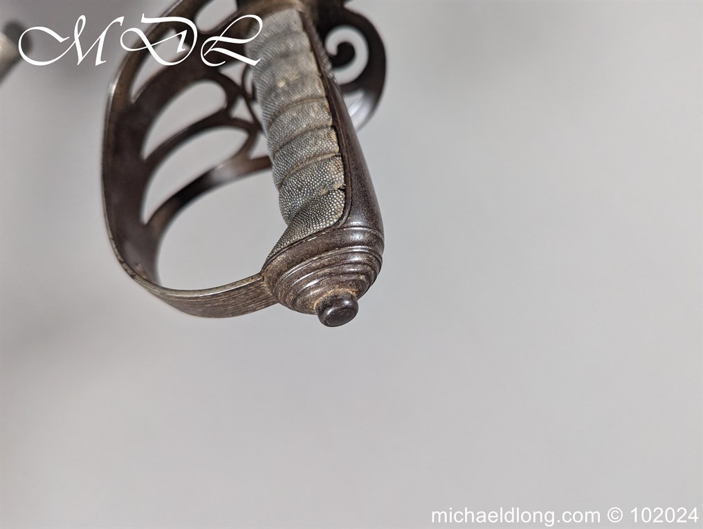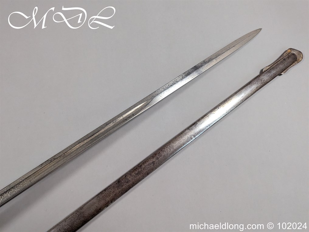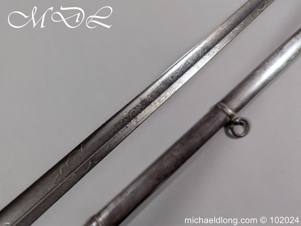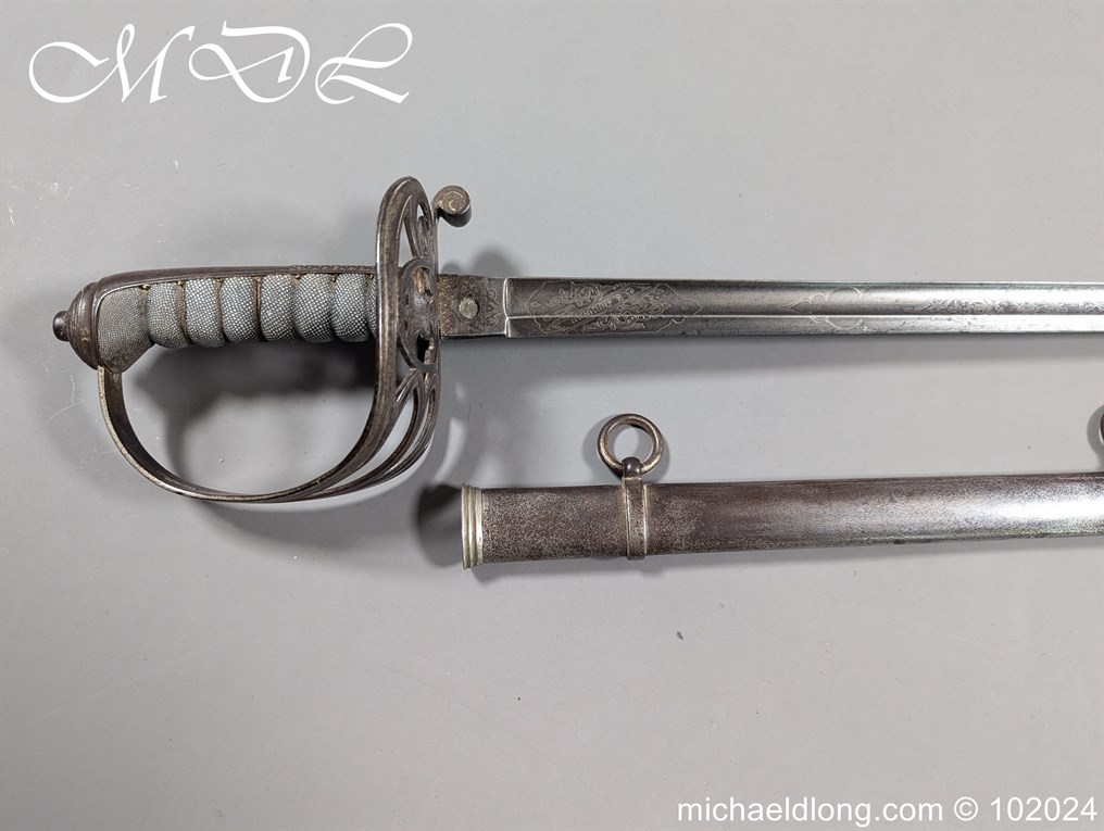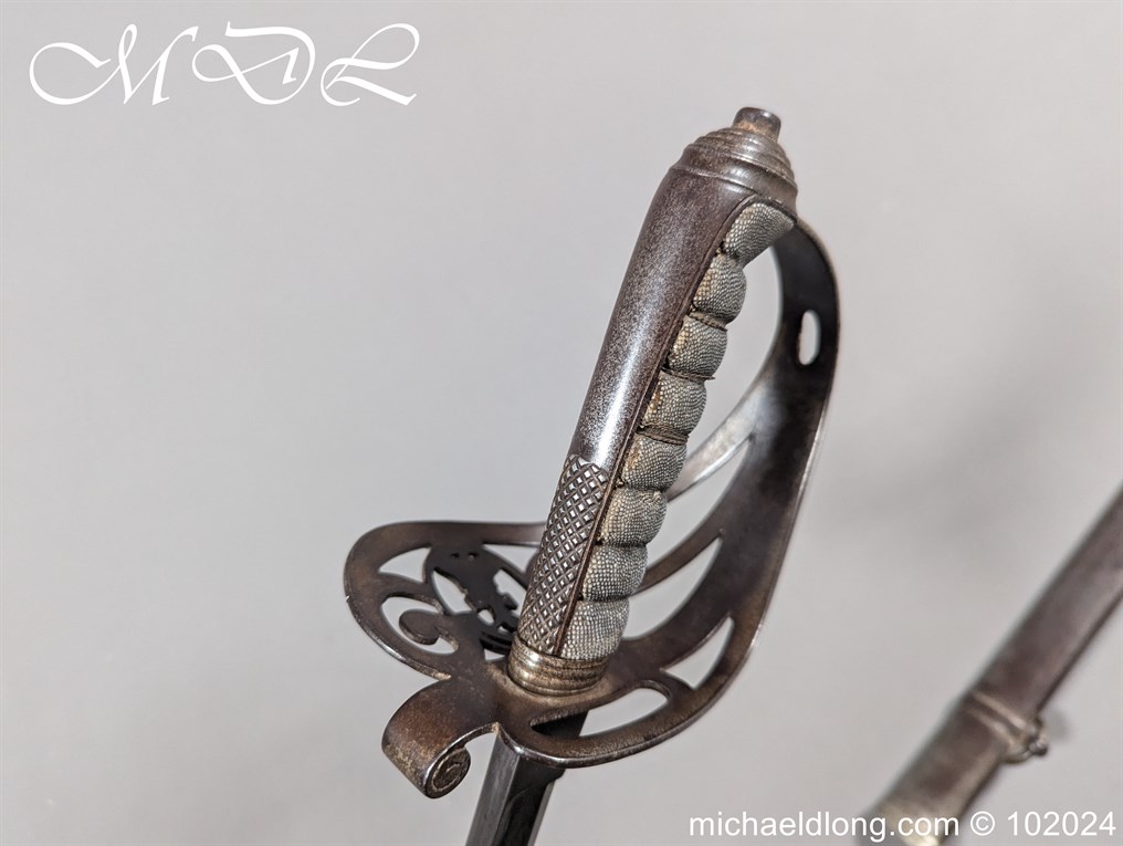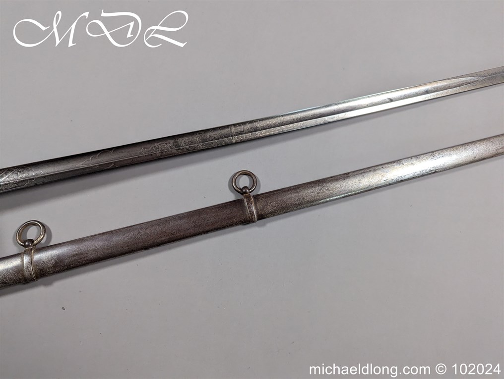 Victorian Robin Hood Rifles Officers Sword belonging to Gilbert Smith Doughty. Regulation hilt with slung bugle and fish skin grip. The blade engraved with regiment devise to one side the reverse with VR and crown plus owners name G S Dough and complete with matching steel scabbard. Overall length 100cm the blade 83cm Information: Gilbert Smith Doughty served with the Robin Hood Rifles and in 1894 was appointed a captain and later became an architect designing many buildings in Nottingham