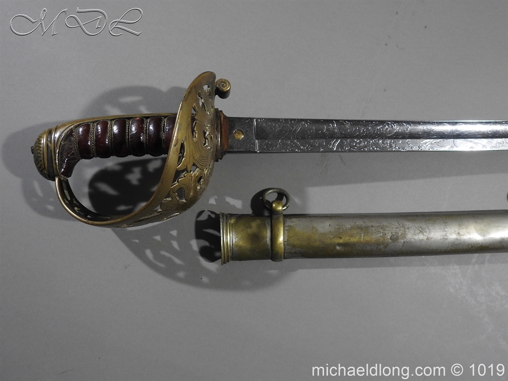Victorian Royal Engineers Sword By Wilkinson Sword number 11688 7th January 1682 with owner name, crest and motto. The sword belonged to Major H Champernowne Royal Engineers and was in China and Straites Settlements c 1889. Regulation brass hilt with leather grip bound with brass wire. The slightly curved blade with excellent deep Victorian engraving VR and Crown with the reverse detailing Royal engineers, family crest motto and H Champernowne below. Proof plug and marked Henry Wilkinson complete with steel scabbard note both throat screws missing overall length 98cm blade 82.5cm