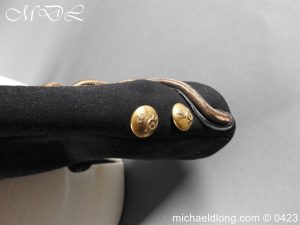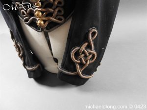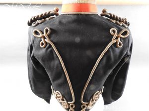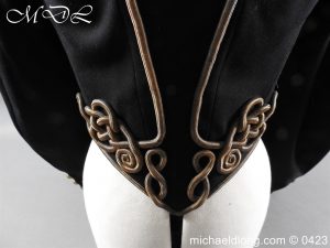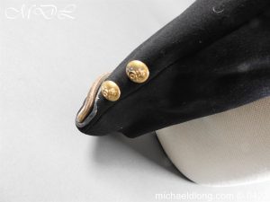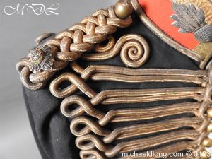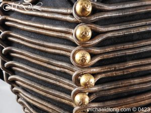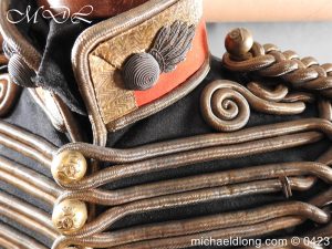Victorian Royal Horse Artillery Full Dress Jacket in very good condition clean and free of moth damage. Dark blue superfine jacket with red stand collar edged with gold lace and embroidered gold and silver bullion artillery grenades. Collar lined with black silk and fastened with two metal hooks and eyes. Top and lower edges of collar trimmed with gold bullion cord which also extends down the centre fronts and lower edge of the jacket. The front of the jacket is elaborately decorated with eighteen tapered rows of looped gold bullion cord, with a crows foot and twirl positioned at each shoulder and a brass hook for cap lines on the left, second row. The plaited gold wire shoulder straps have two embroidered bullion stars for the rank of Captain and a gilt button. The sleeves are decorated at the cuff with gold cord Austrian knots with gold Russia braid eyes and tracings and a single gilt button, note all buttons are correct and with Victorian crown.