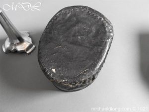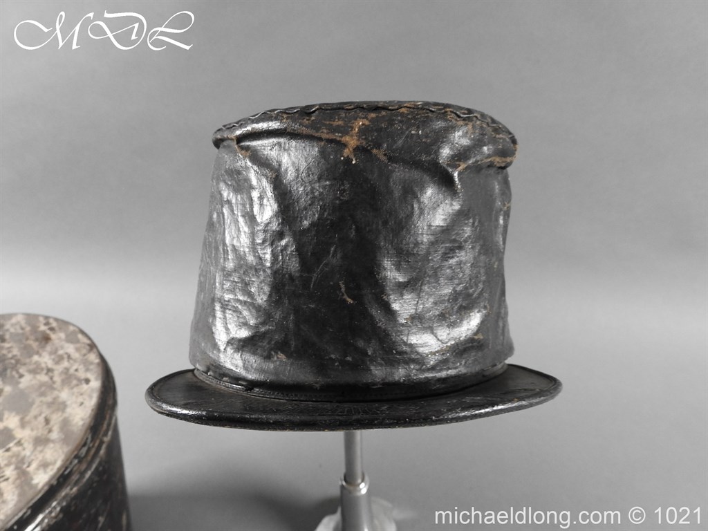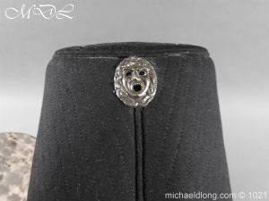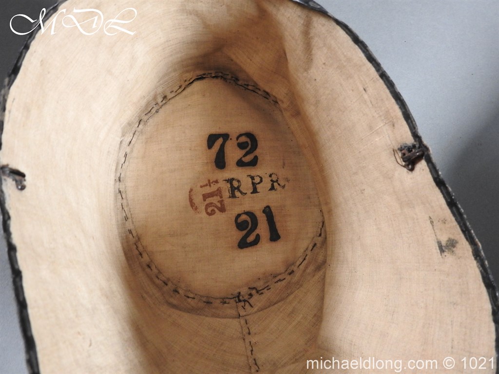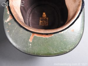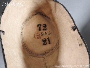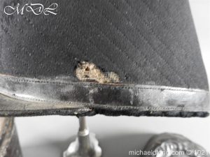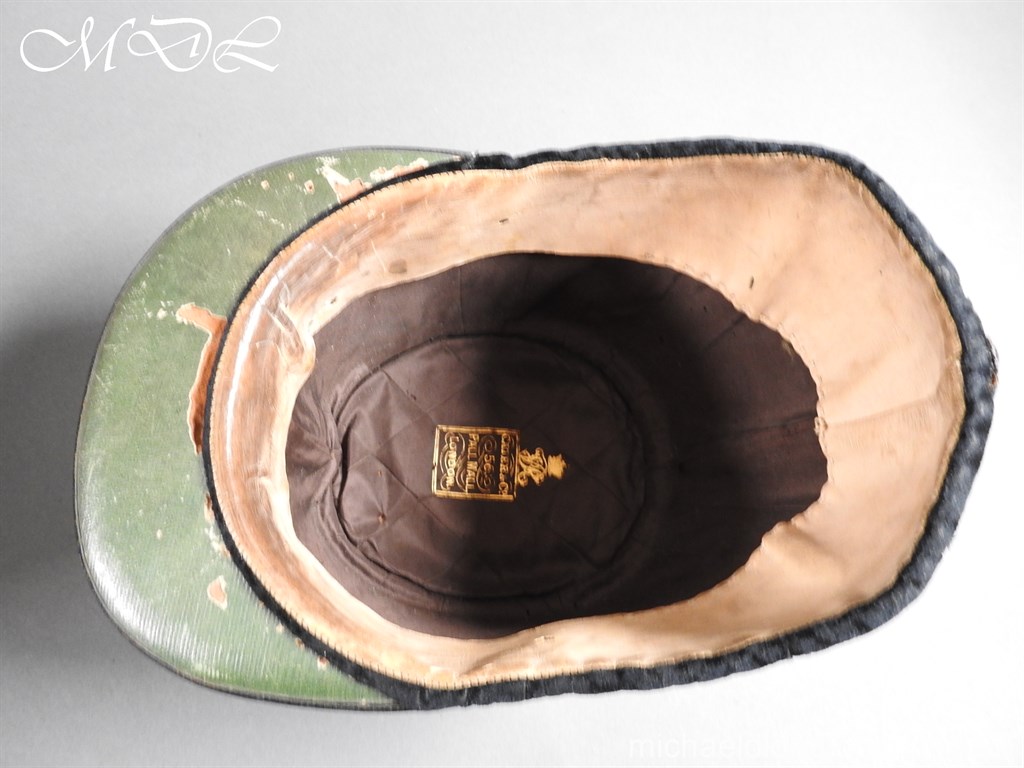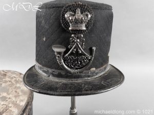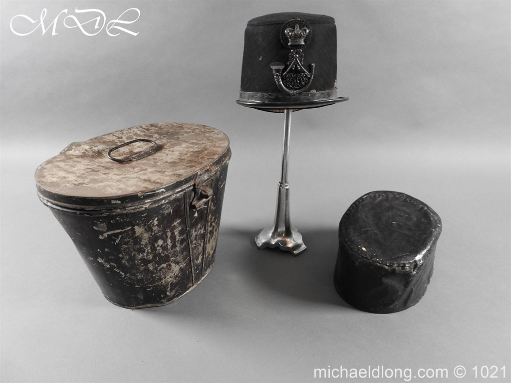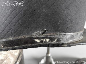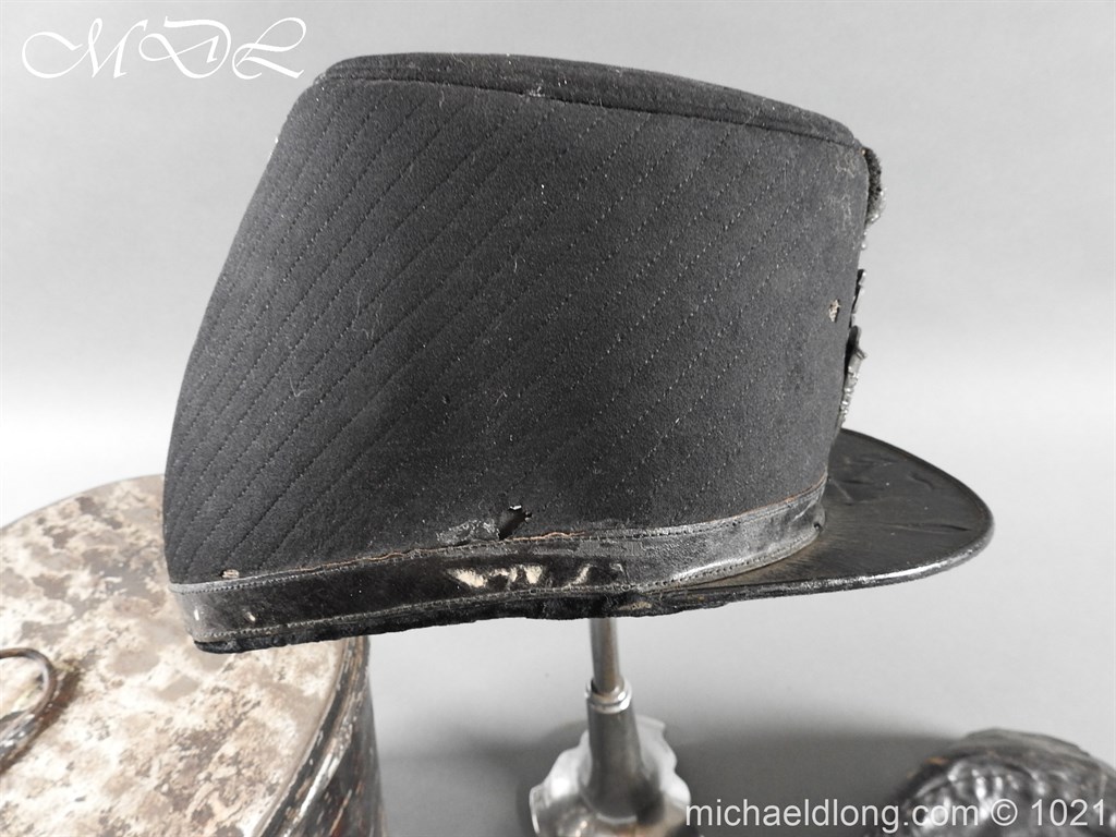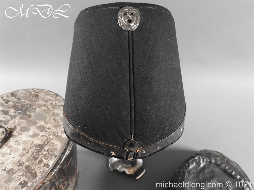 Victorian Royal Perthshire Militia Shako with blue quilted cloth body to the front there is a darkened metal regimental badge cypher is RPMPR which is RPM from both ends with crown above with a patent leather peak and headband. The rear of the shako has a darkened metal gorgons head for ventilation, the internal has a brown silk liner with makers details in gold plus VR and crown complete with leather sweat band. It is complete with black cover with various markings and transit tin please note age wear to the helmet as shown in the images