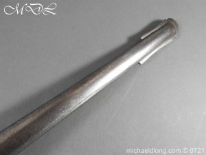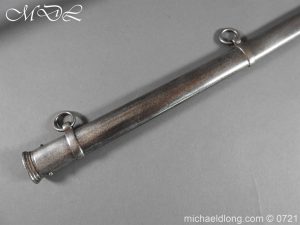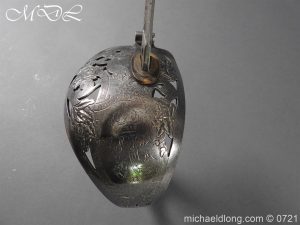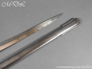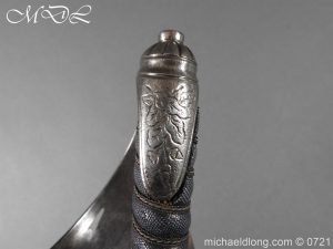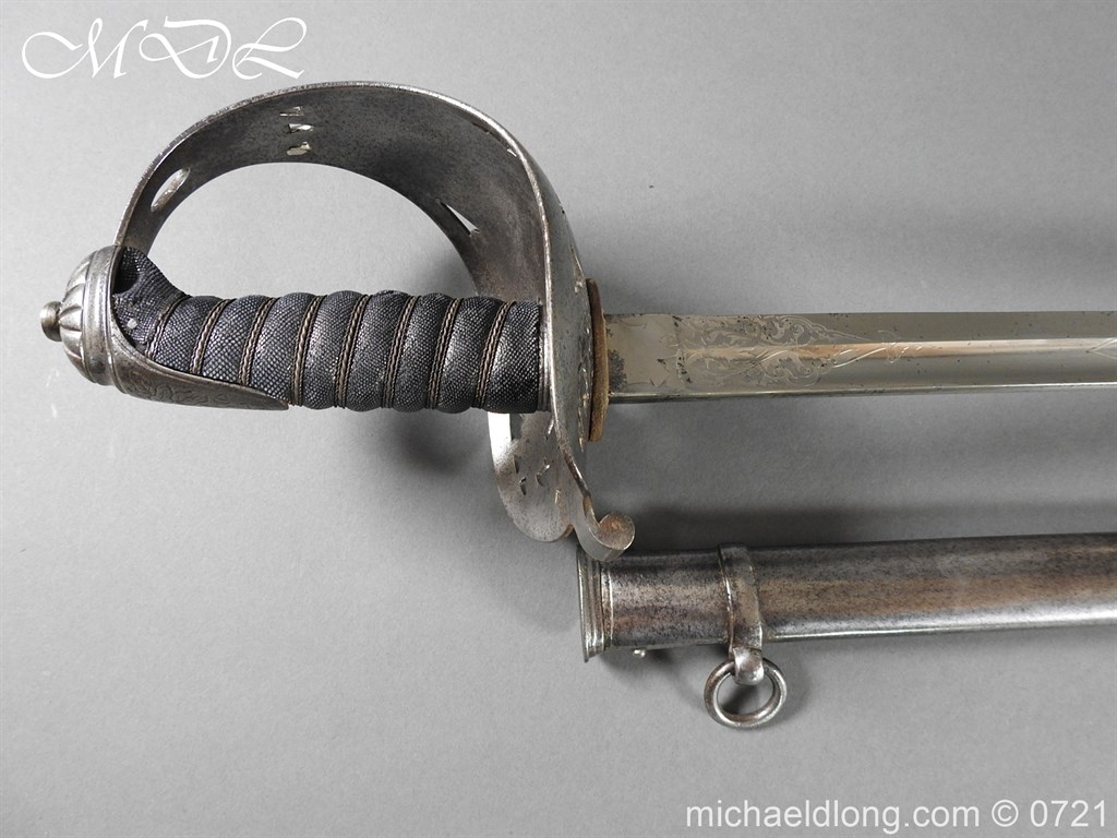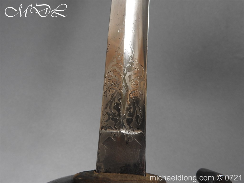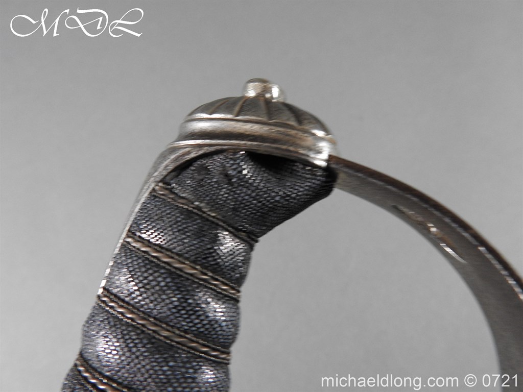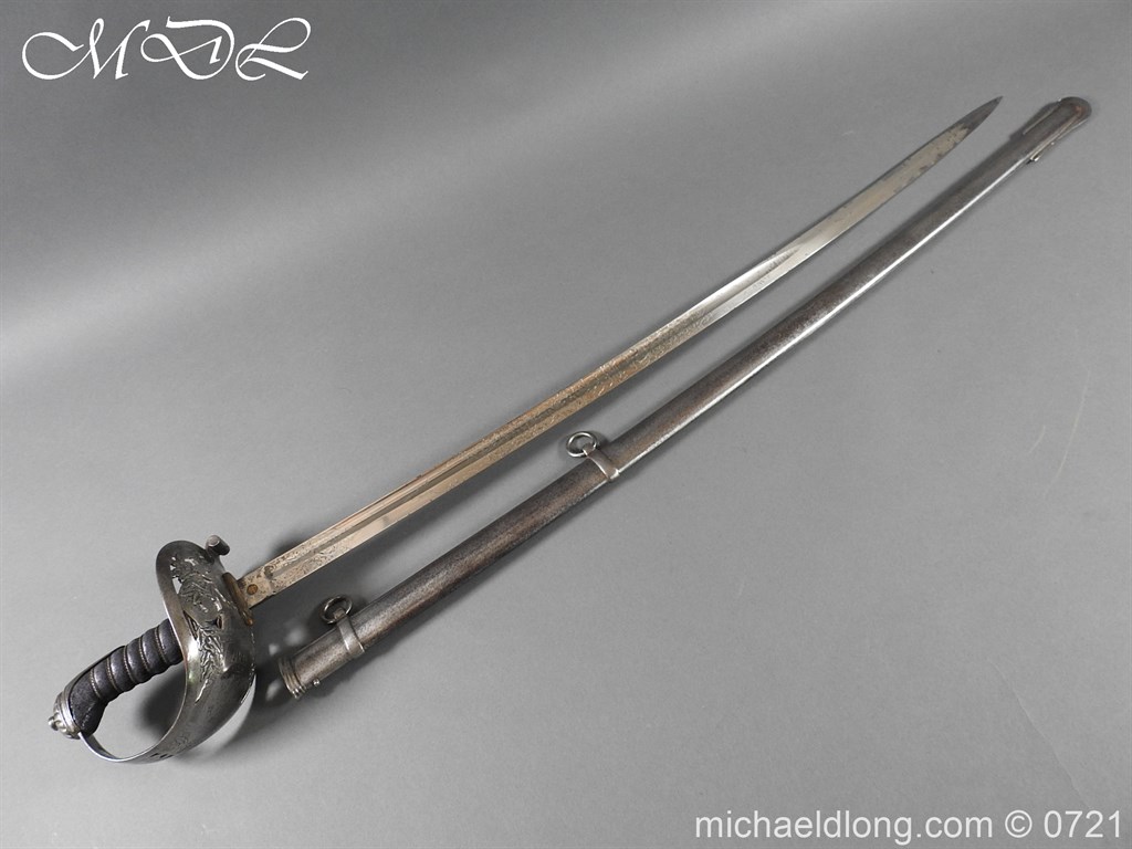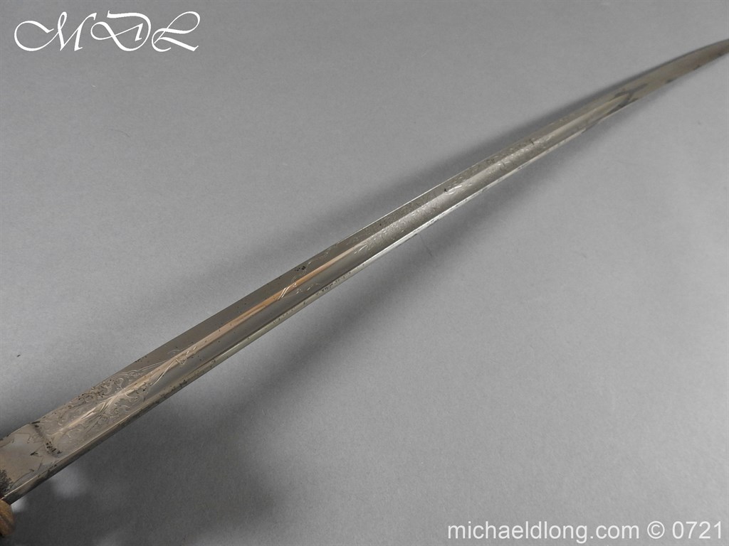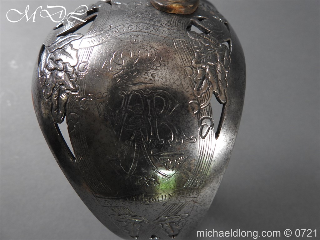 Victorian Warwickshire Rifle Volunteers Officer’s Sword with 32in. slightly curved blade etched with foliate decoration, VR cypher and Bugle-horn above inscription 1st WARWICK R.V. Pierced steel guard incised with VR cypher above a Bugle-horn and scrolls inscribed WARWICKSHIRE RIFLE VOLUNTEERS, wire-bound fish skin grip with extended pommel in lieu of back-strap and steel scabbard.