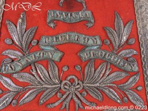 Rare Victorian West Kent Yeomanry Officers Full Dress Sabretache, fine bullion embroidered Victorian crown above bullion embroidered rearing Kent horse with Invicta scroll and three part scroll within laurel spray having motto, “Loyalty Liberty Property”. Thick silver braid edging to the front. Red morocco leather backing and rear pouch.