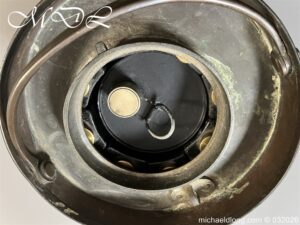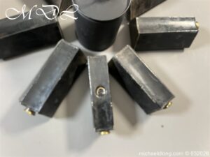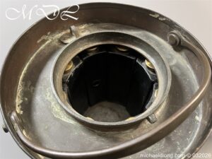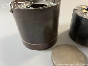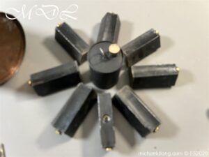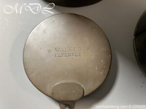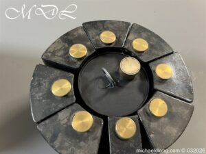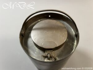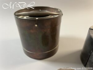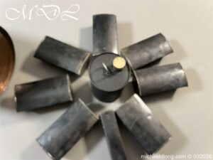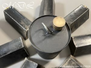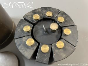Early 19th Century made of copper, containing 8 shaped japanned tinned iron canisters arranged around a central circular canister which has been painted, circular copper lid marked Walkers Patentee – James Walker’s patent is dated 7 September 1810 No. 3373, locking pin and carrying handle. For reference, please see W. Keith Neal and D.H.L. Back, British Gunmakers Their Trade Cards, Cases and Equipment, p. 18, plates 31-33