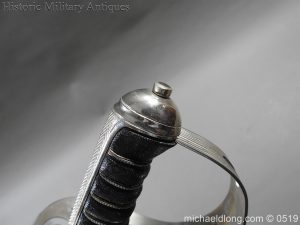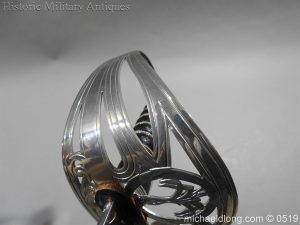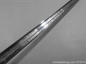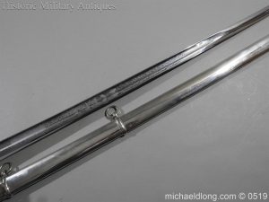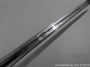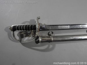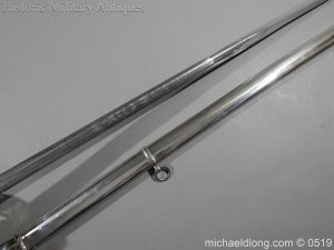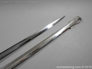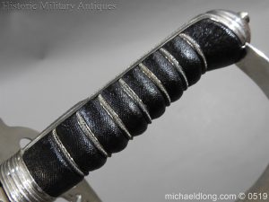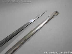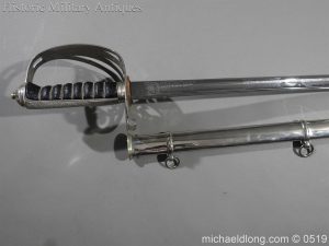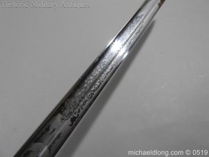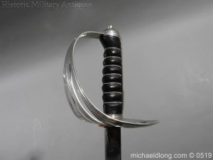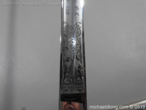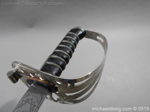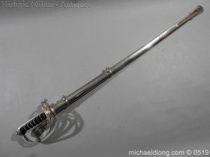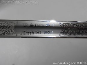 Excellent sword in parade condition, the regimental hilt retains all it’s plating, the blade is well etched with King’s crown, GR V and W S From G C March 1st 1928 (St George’s day), the reverse with King’s crown and regiment badge, battle honours. Complete with parade scabbard.