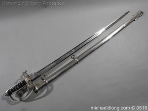 Excellent sword in parade condition, the regimental hilt retains all it’s plating, the blade is well etched with King’s crown, GR V and W S From G C March 1st 1928 (St George’s day), the reverse with King’s crown and regiment badge, battle honours. Complete with parade scabbard.