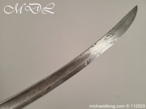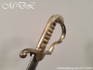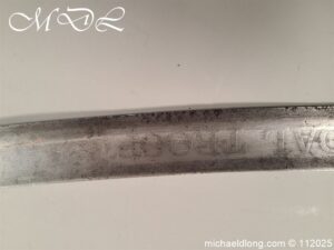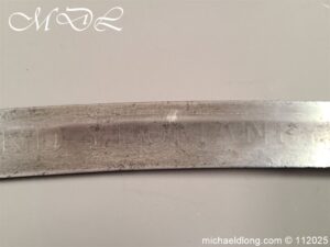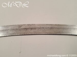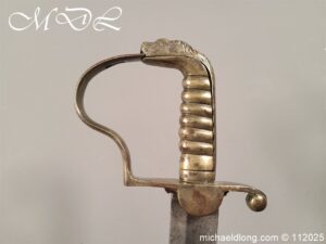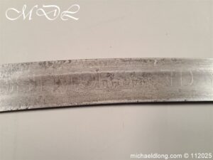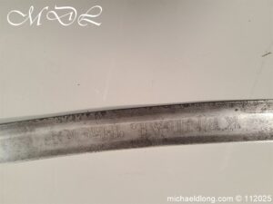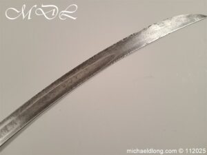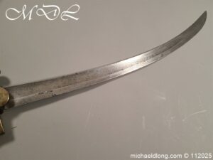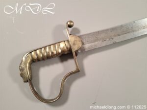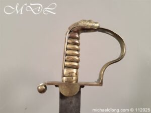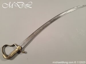 Westmoreland Yeomanry Troopers Sword c 1820 period and very similar to the Pioneer or Royal Artillery sword of that period. Brass guard and grip with flattened lion head pommel and curved langets. The blade single edged curved and engraved on one side with KENDEL TROOP the reverse with WESTMORLAND YEOMANRY. Overall length 35 inch the blade 30 inch