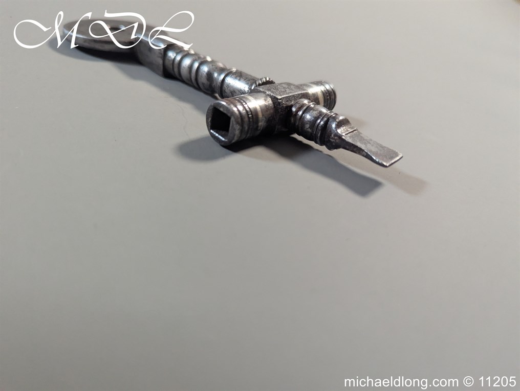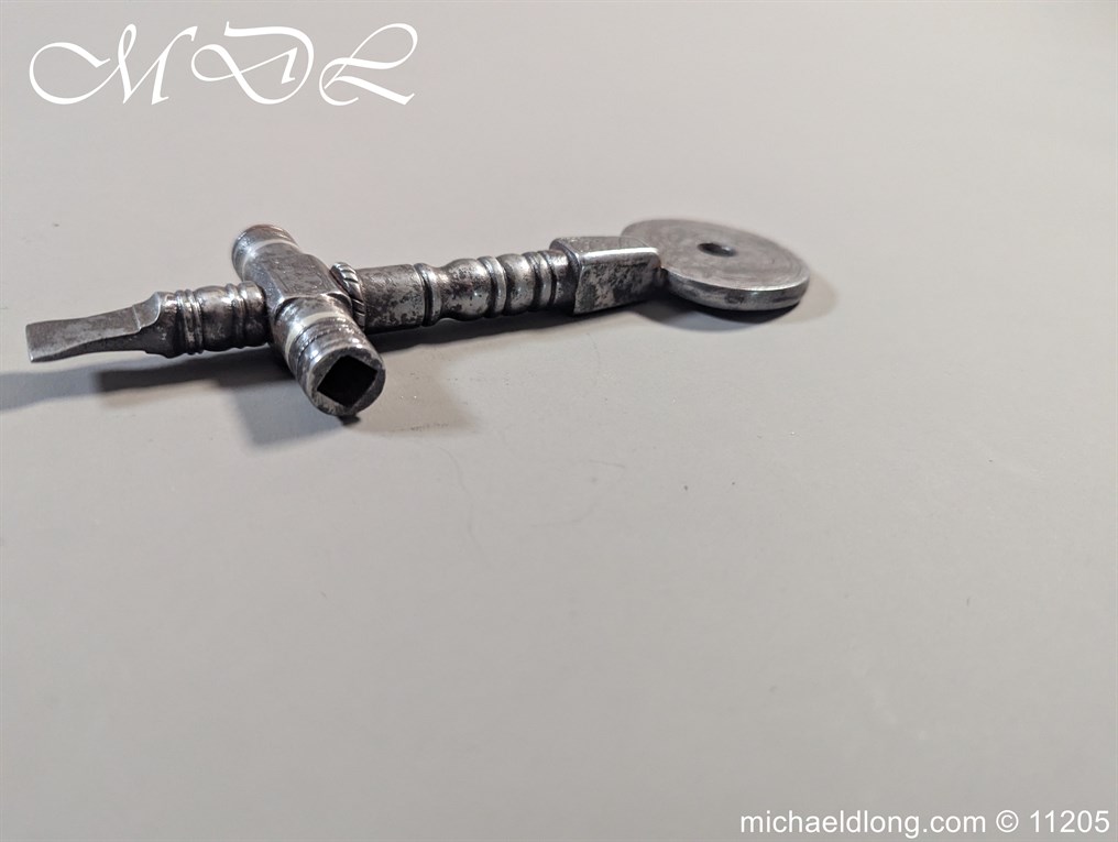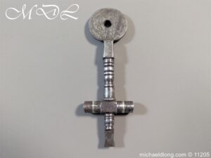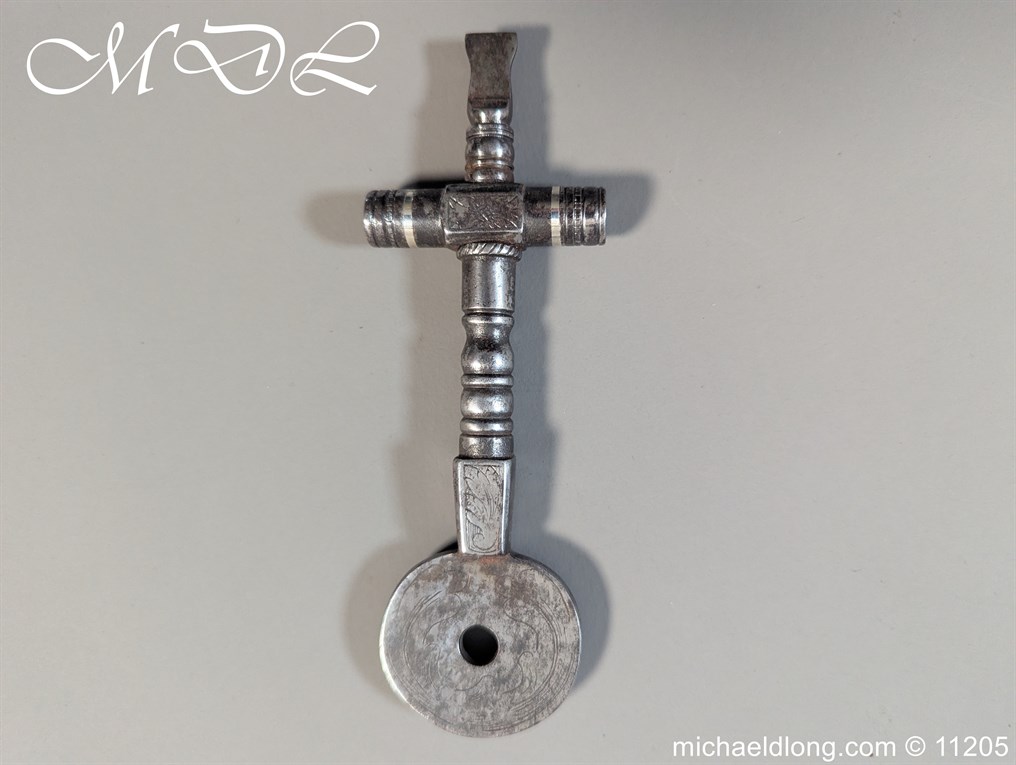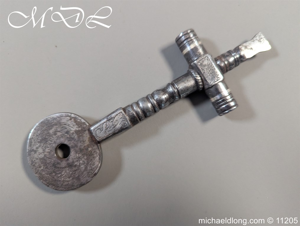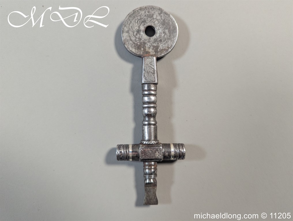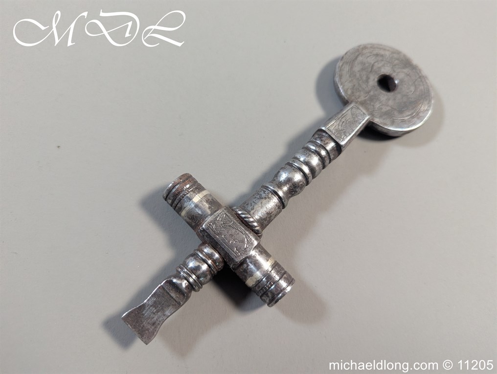 Wheelock Combination Key – Tool, high quality turned round centre shaft leading to square section terminating in circular grip to one end and screwdriver to the other. The cross section again with turned decoration and inlayed with silver bands which houses spanner section to each end. Floral and animal engraved decoration, overall length 6.25 inch the width 2 inches