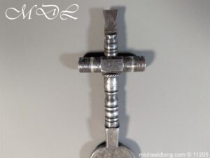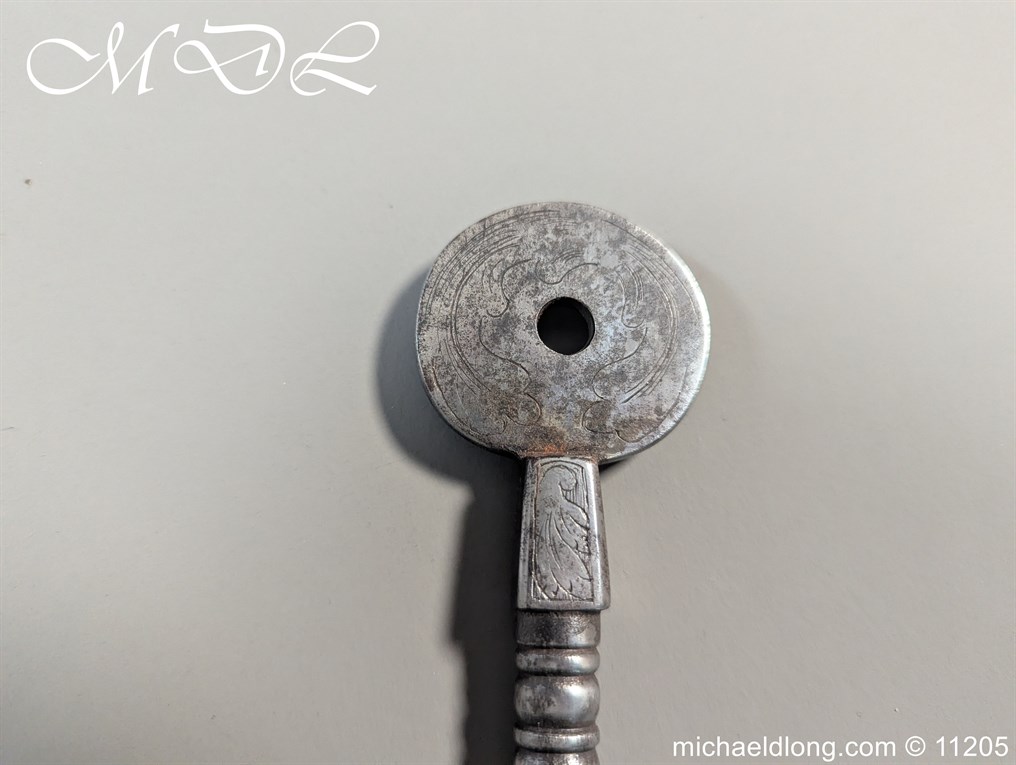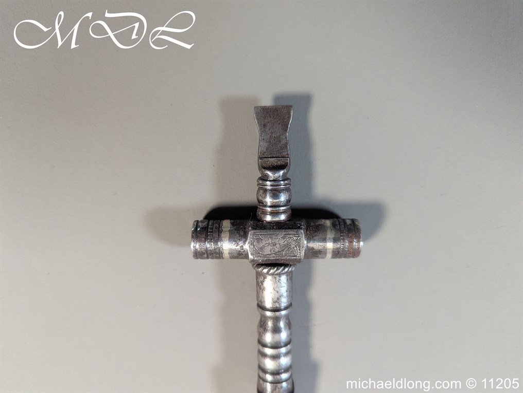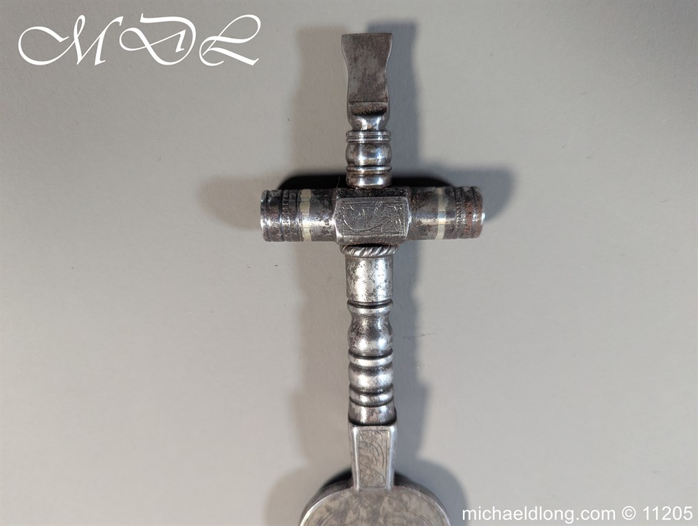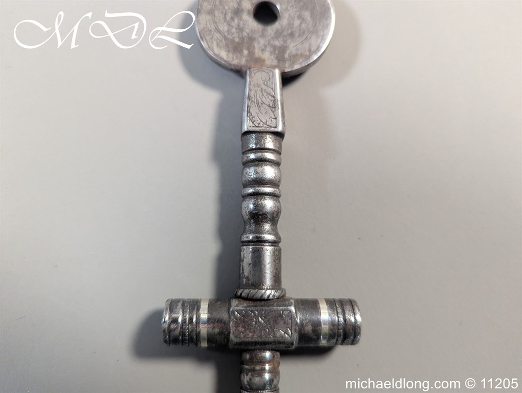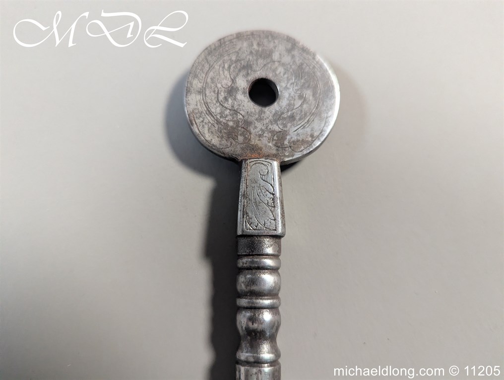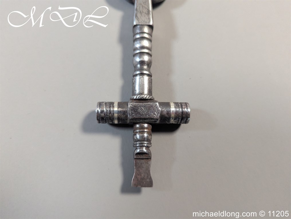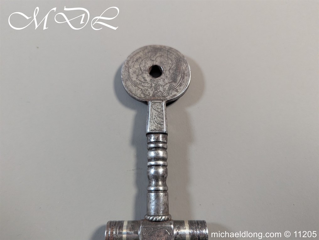 Wheelock Combination Key – Tool, high quality turned round centre shaft leading to square section terminating in circular grip to one end and screwdriver to the other. The cross section again with turned decoration and inlayed with silver bands which houses spanner section to each end. Floral and animal engraved decoration, overall length 6.25 inch the width 2 inches