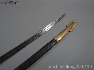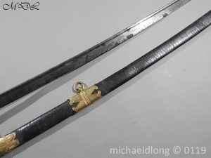 William IV British 1822 pattern Infantry officer`s sword, the single edged pipe or quill back blade etched with royal cipher within panal and maker marked Cater Pall Mall London, brass hilt with IV royal cipher, good fish skin grip with twist wire binding complete with leather scabbard with gilt mounts slight movement on top mount