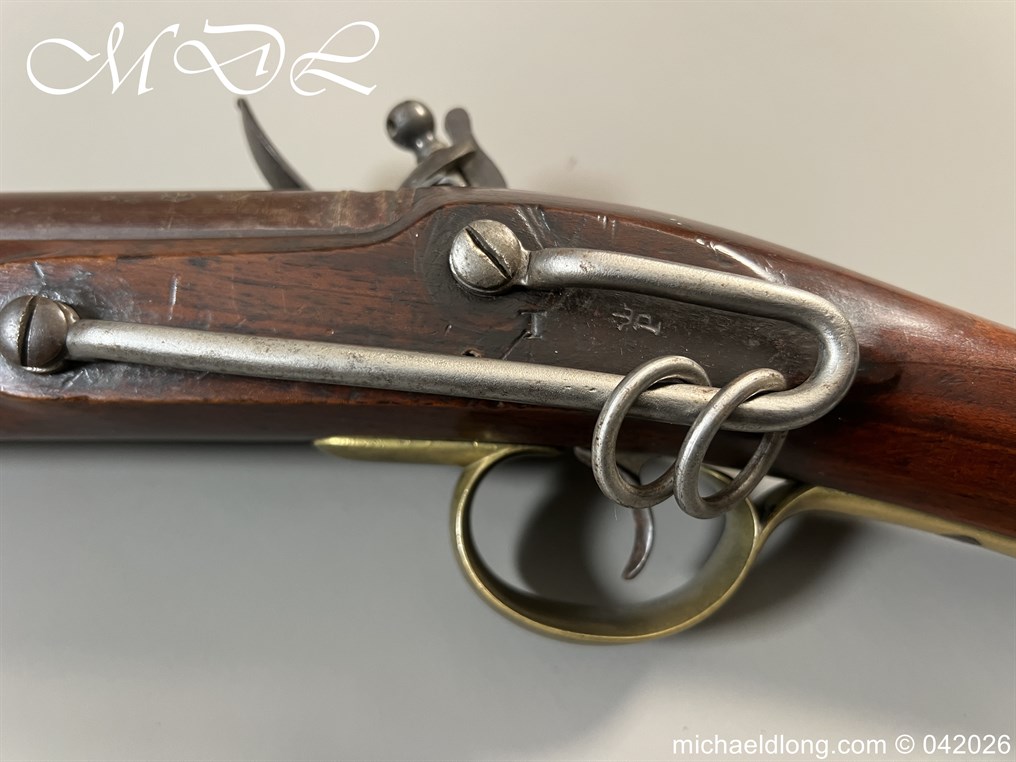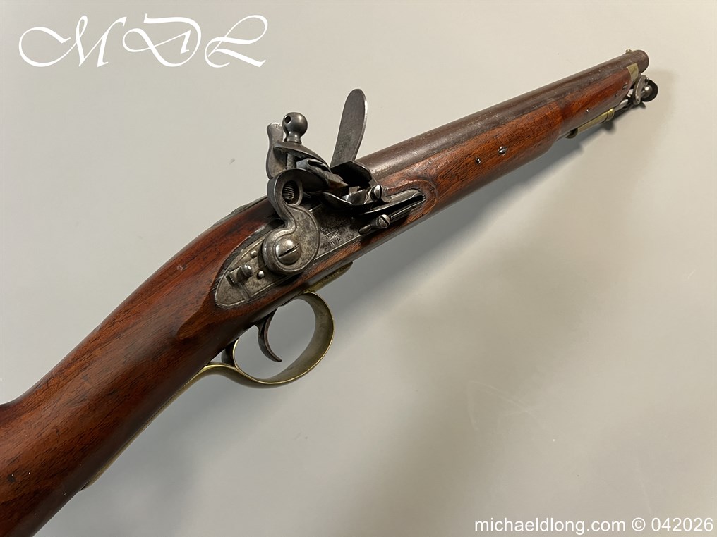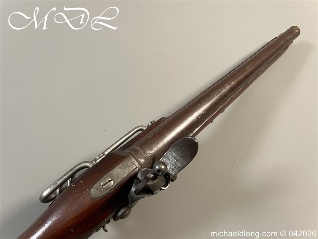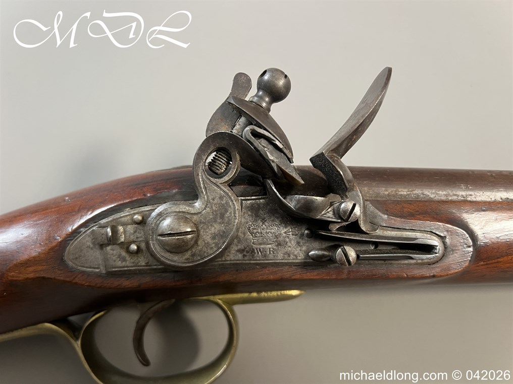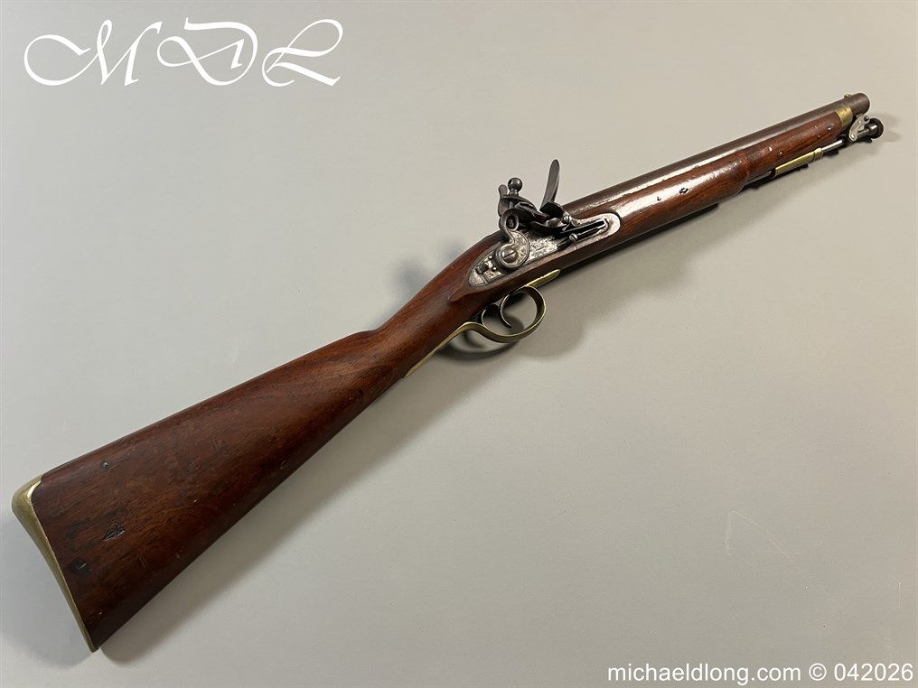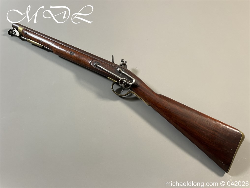 Paget 16-Bore Flintlock Cavalry Carbine, the barrel with brass fore-sight, stamped with Tower proofs and crowned M inspection mark, plain tang with inspection mark, flat engraved lock with WR crowned and TOWER across the tail, figured full stock stamped with Board of Ordnance ownership mark on one side of the butt, initial P under the saddle ring, two inspection marks behind the tang of the trigger guard, and with regulation brass mounts, saddle-bar and ring, and stirrup ramrod. UK shipping Free – Rest of the World at cost