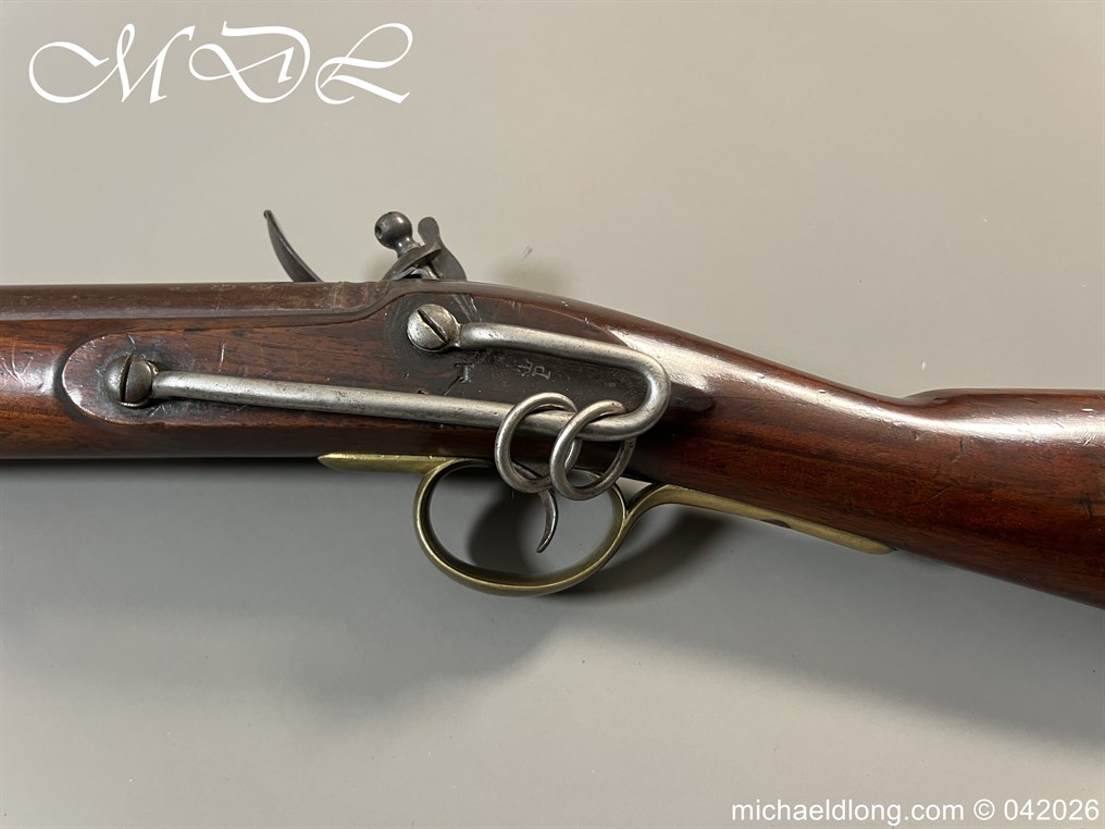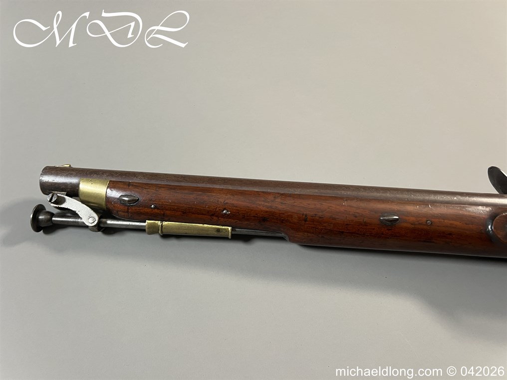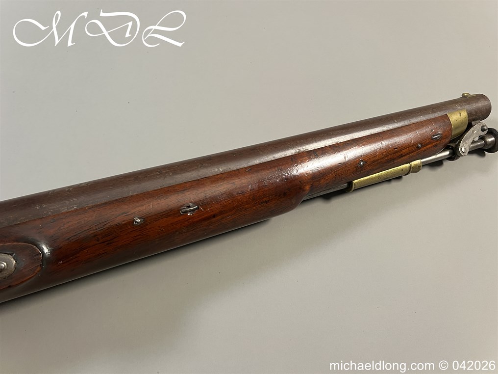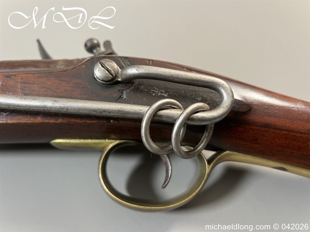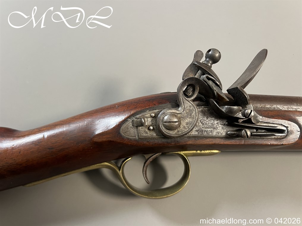 Paget 16-Bore Flintlock Cavalry Carbine, the barrel with brass fore-sight, stamped with Tower proofs and crowned M inspection mark, plain tang with inspection mark, flat engraved lock with WR crowned and TOWER across the tail, figured full stock stamped with Board of Ordnance ownership mark on one side of the butt, initial P under the saddle ring, two inspection marks behind the tang of the trigger guard, and with regulation brass mounts, saddle-bar and ring, and stirrup ramrod. UK shipping Free – Rest of the World at cost